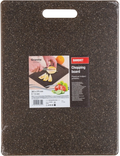 Praktična deska za rezanje Granite v temno rjavi izvedbi združuje sodoben videz z visoko vzdržljivostjo. Ne absorbira vonjav, enostavno se vzdržuje in zahvaljujoč vgrajeni odprtini jo lahko priročno prenašate ali obesite.