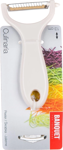 Praktično Y strgalo za hitro pripravo finnih julienne trakcev iz zelenjave in sadja. Ostro nerjaveče rezilo 5 cm reže natančno in gladko, vzdržljiv plastični ročaj zagotavlja udoben oprijem. Idealno za korenje, zeleno, redkev in druge sestavine, v mešanici barv za vašo kuhinjo.