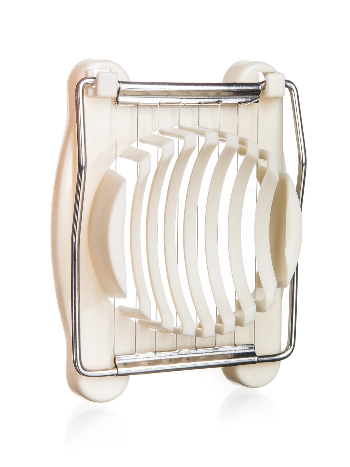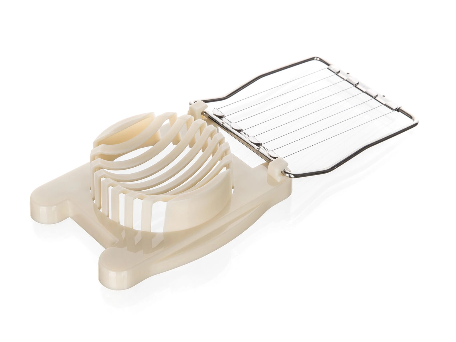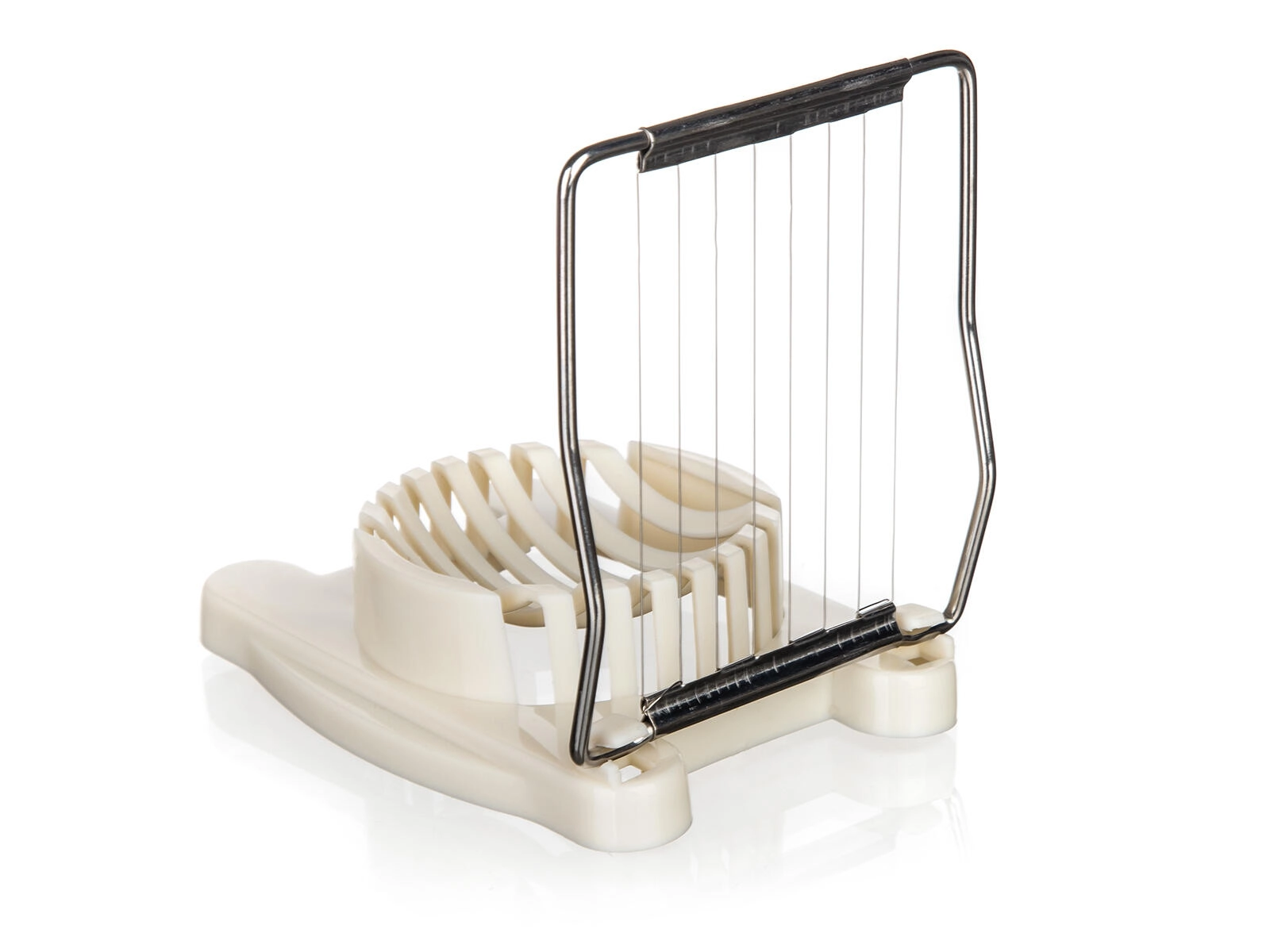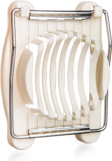 Eleganten kremni rezalnik za jajca združuje praktičen dizajn in hitro uporabo. Stabilna osnova z oblikovano zibelko jajce varno fiksira, medtem ko gosto razporejene nerjaveče strune zagotavljajo čiste in enakomerne reze brez stiskanja. Idealno za jajca v solatah, sendvičih ali za dekorativno serviranje.