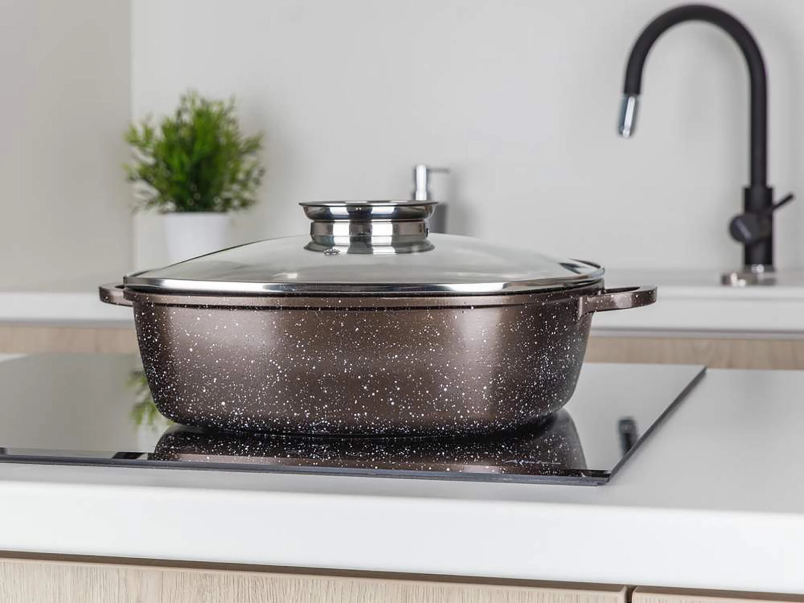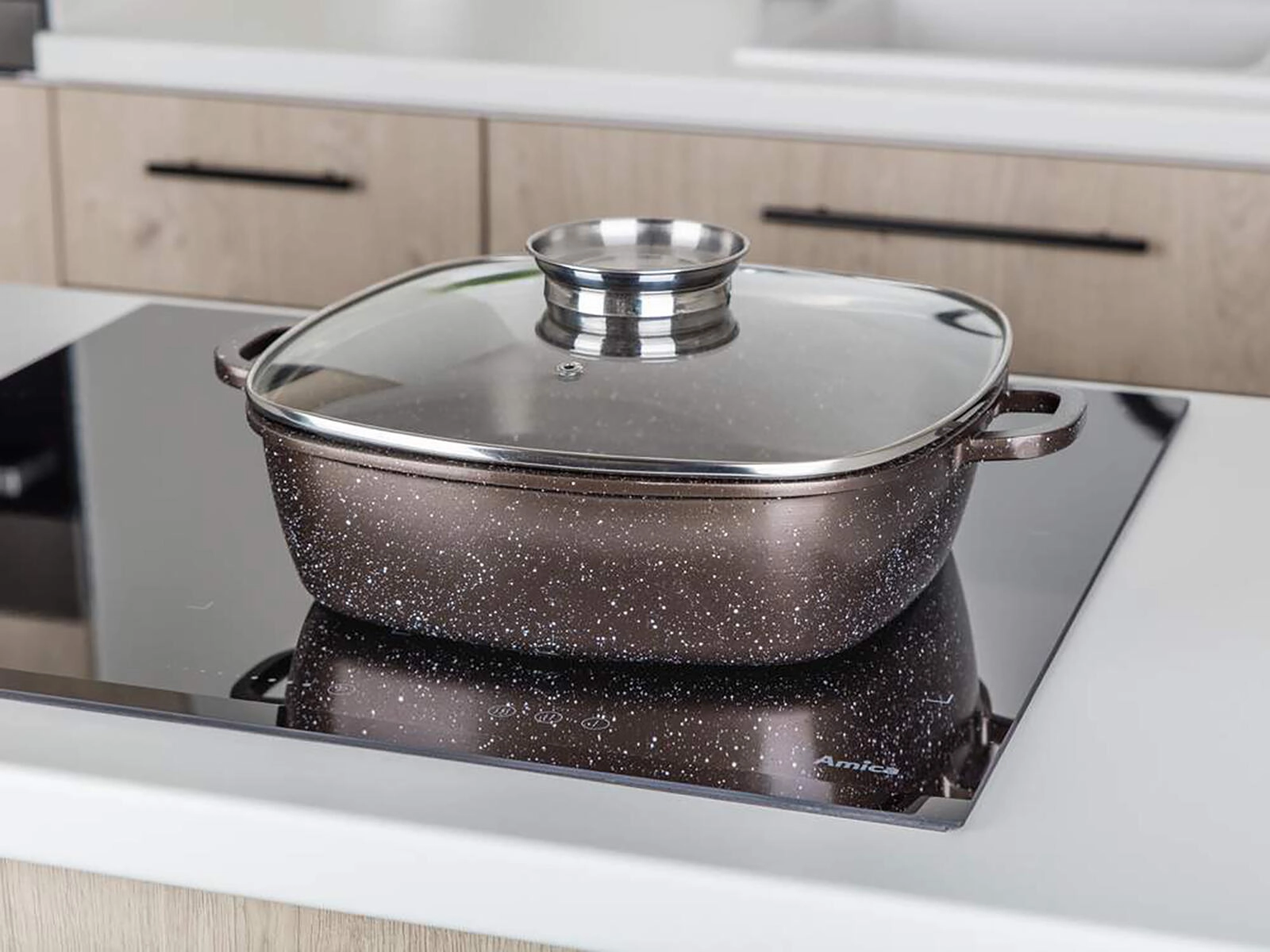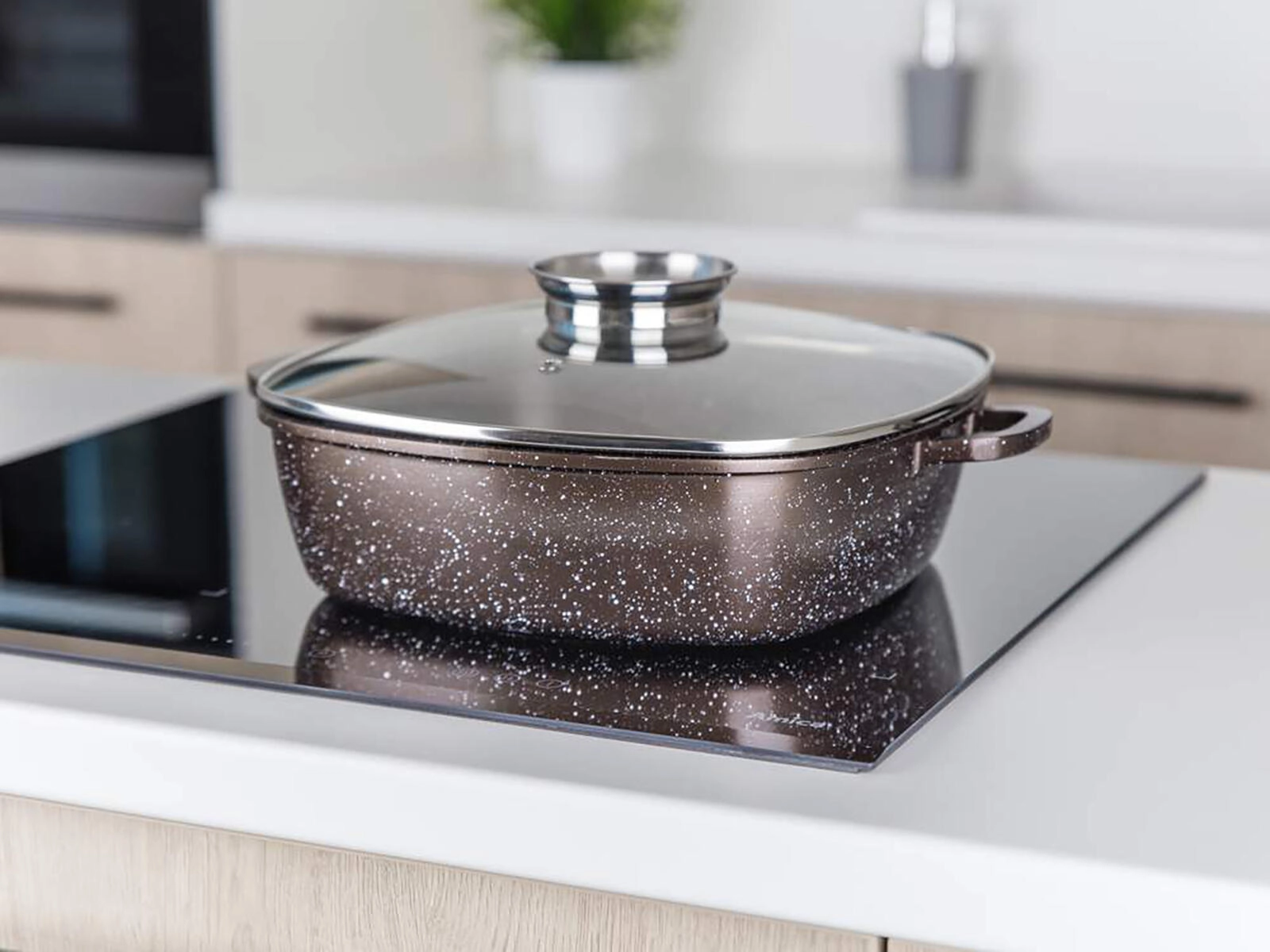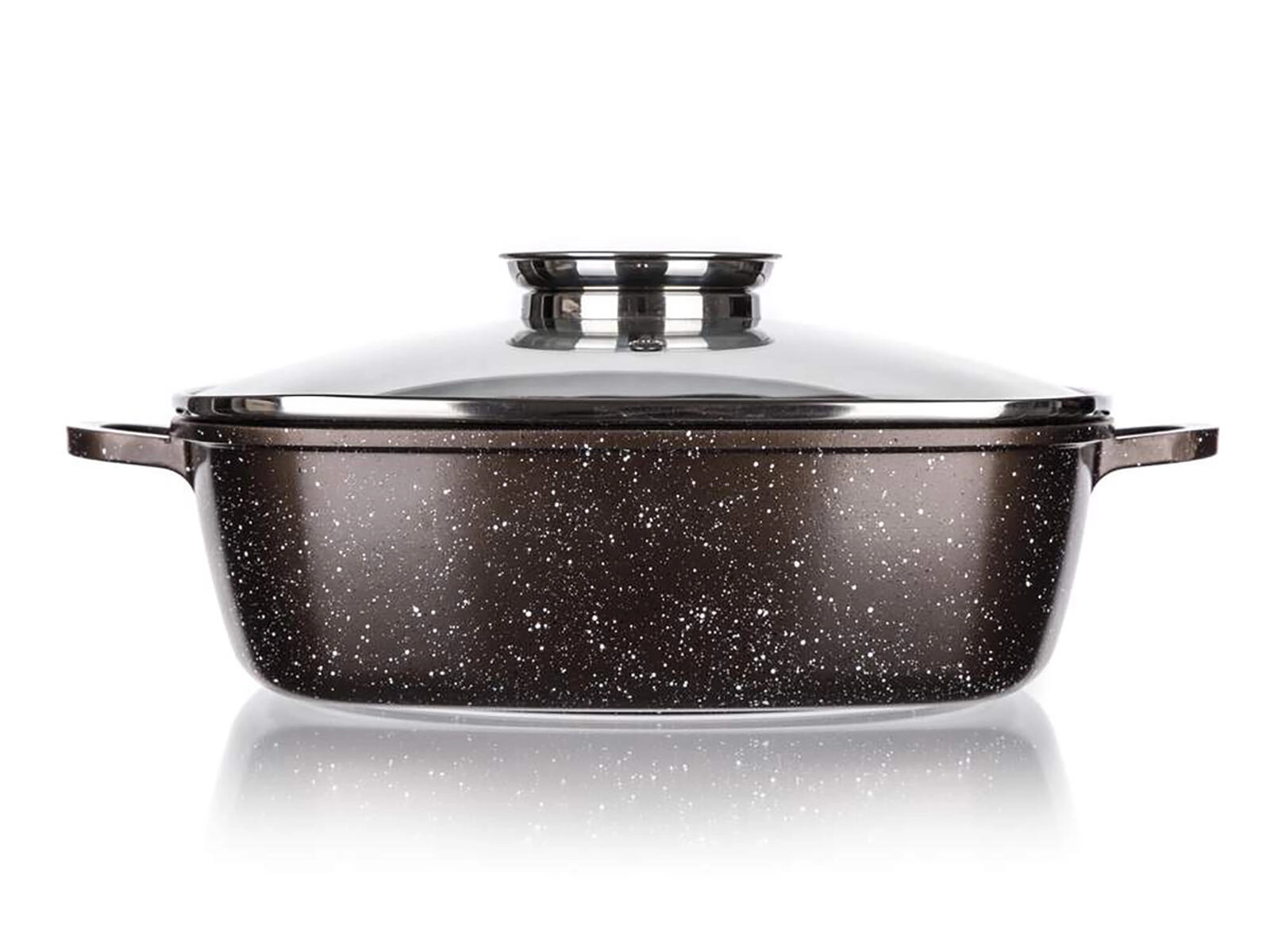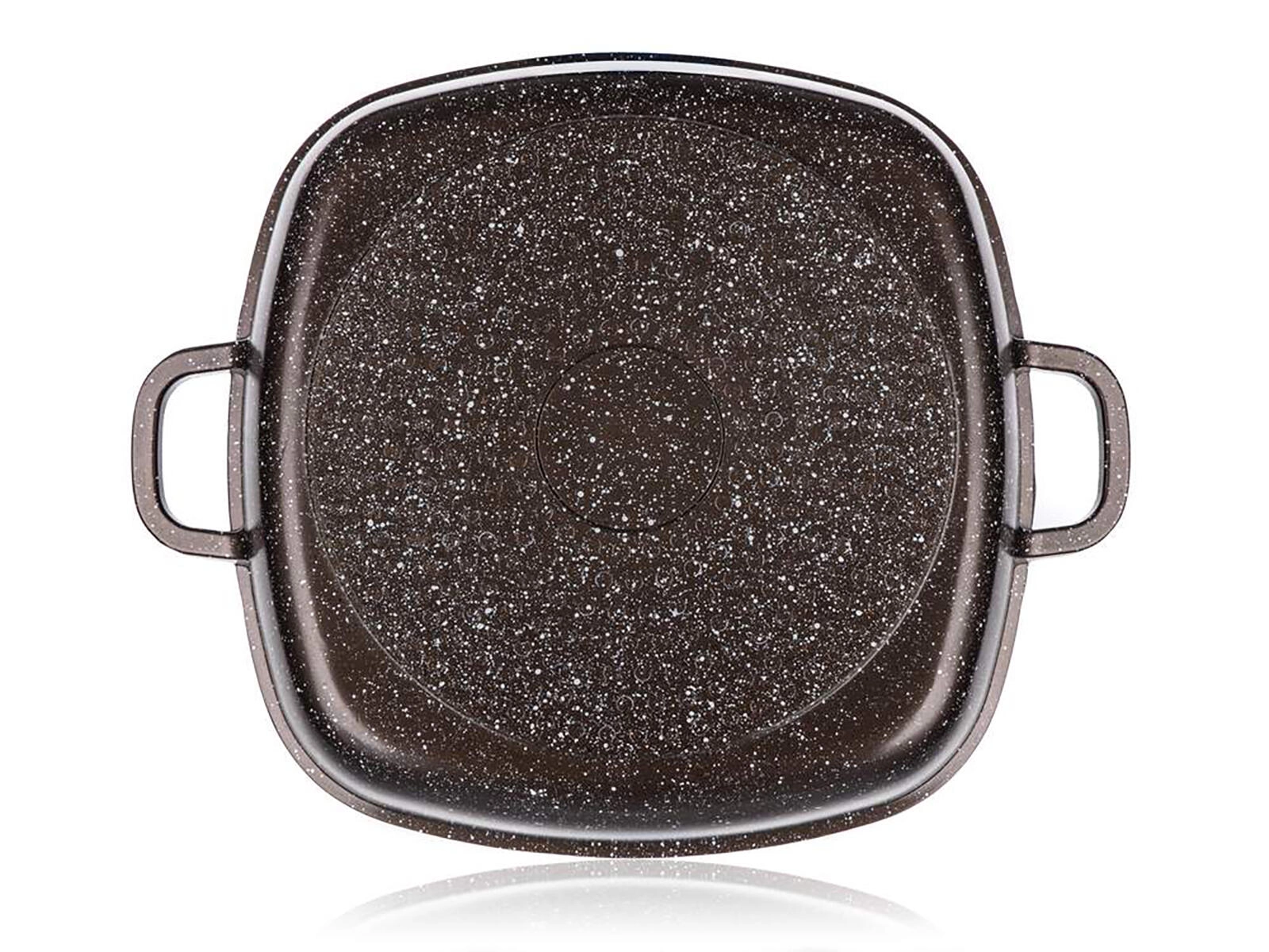 Zaradi toplotno odpornega zunanjega premaza in indukcijskega dna je pekač trpežen in vsestranski – primeren za plin, elektriko, steklokeramiko, indukcijo, pečico in pomivalni stroj. Eleganten granitni dekor v temno rjavi barvi se poda vsaki kuhinji.