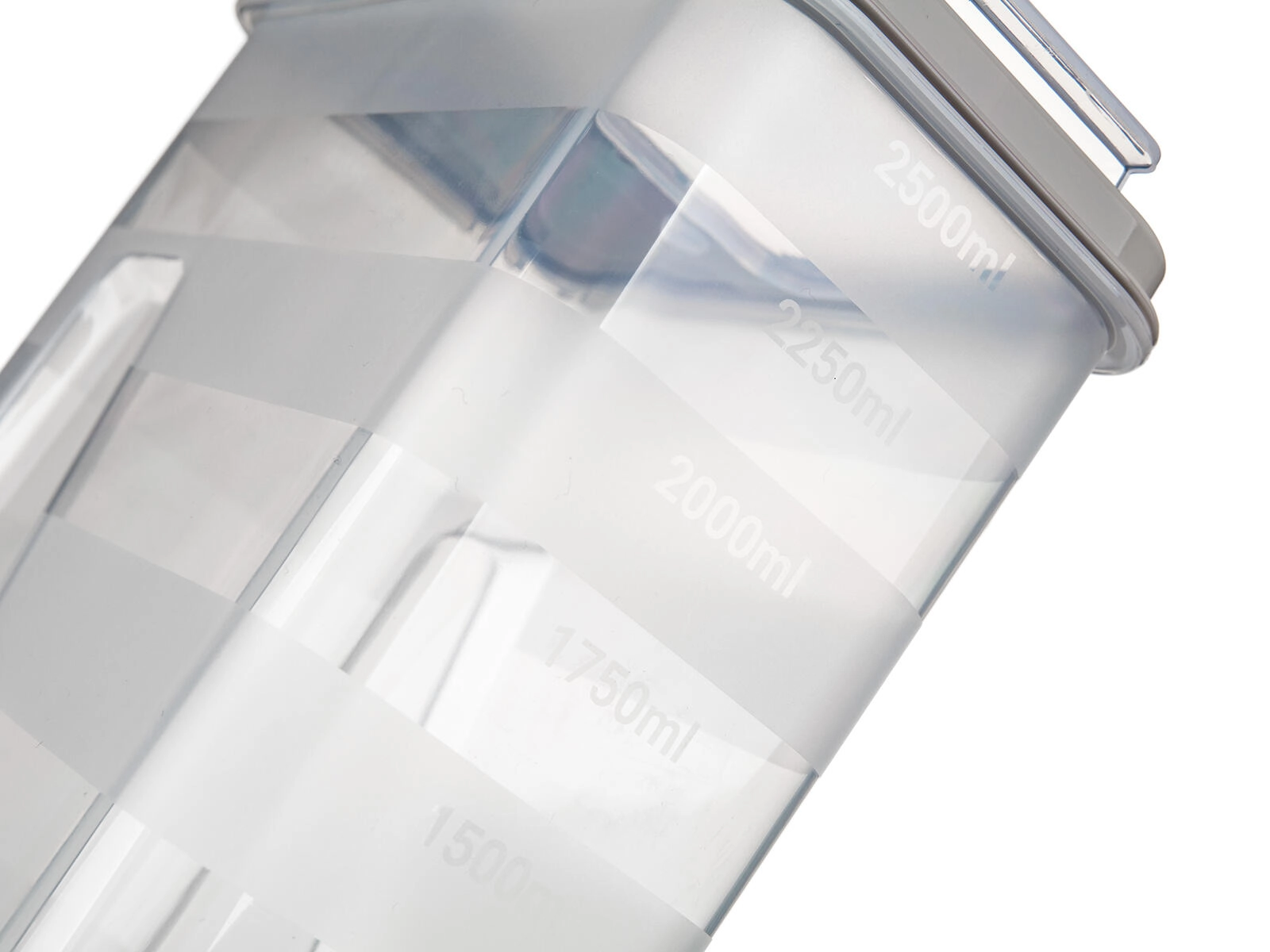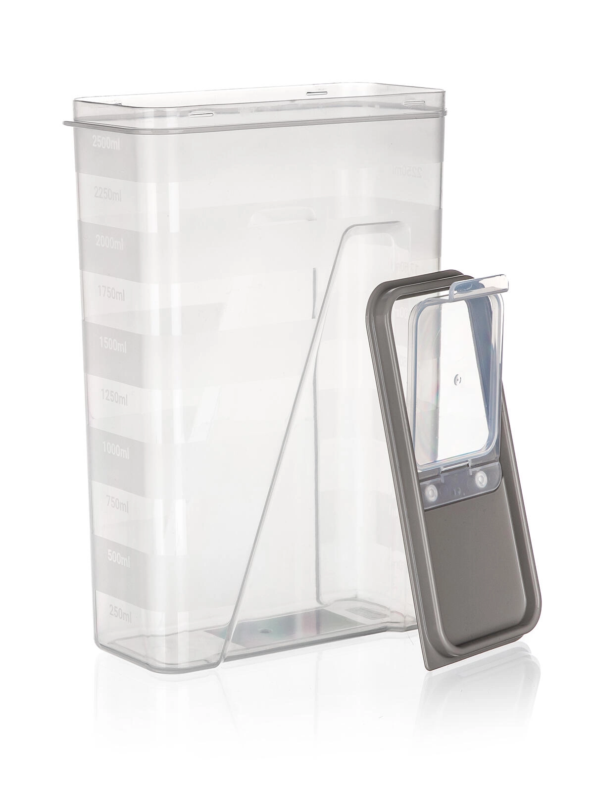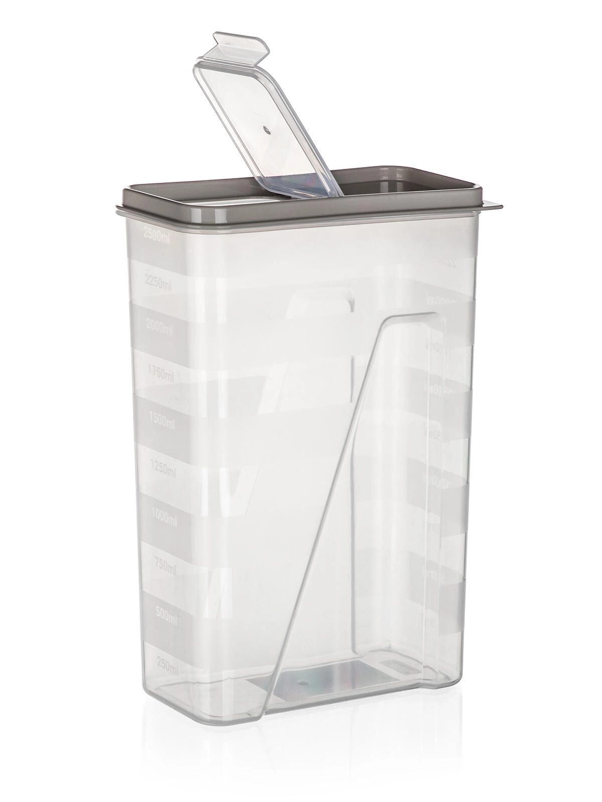 Praktična in stilska posoda s prostornino 2,5 l ohranja vaše suhe sestavine sveže in pregledno shranjene. Zahvaljujoč prosojnemu ohišju vedno vidite vsebino in količino, pokrov v odtenku latte se zlahka odpira in omogoča natančno doziranje. Vgrajene merilne oznake na vsakih 250 ml olajšajo nadzor zalog in pripravo receptov. Idealna za testenine, stročnice, moko, sladkor ali žita.