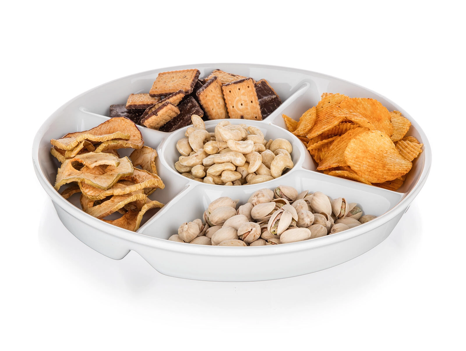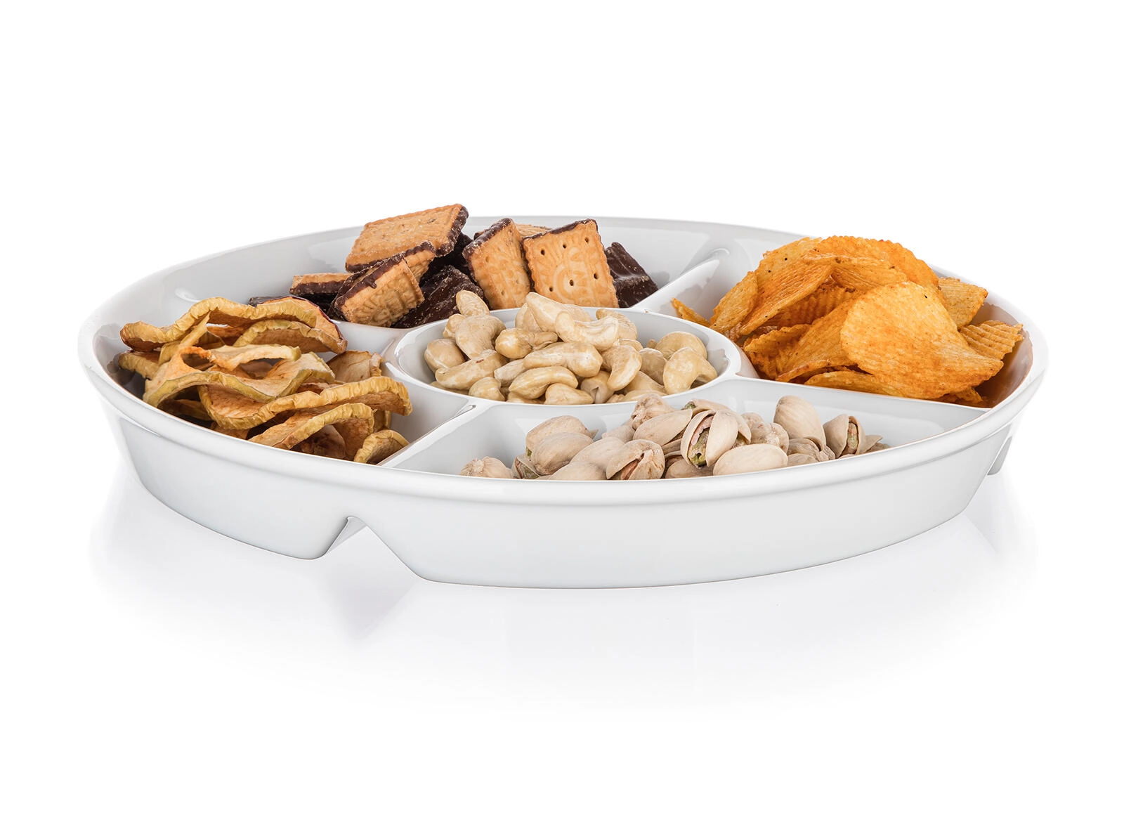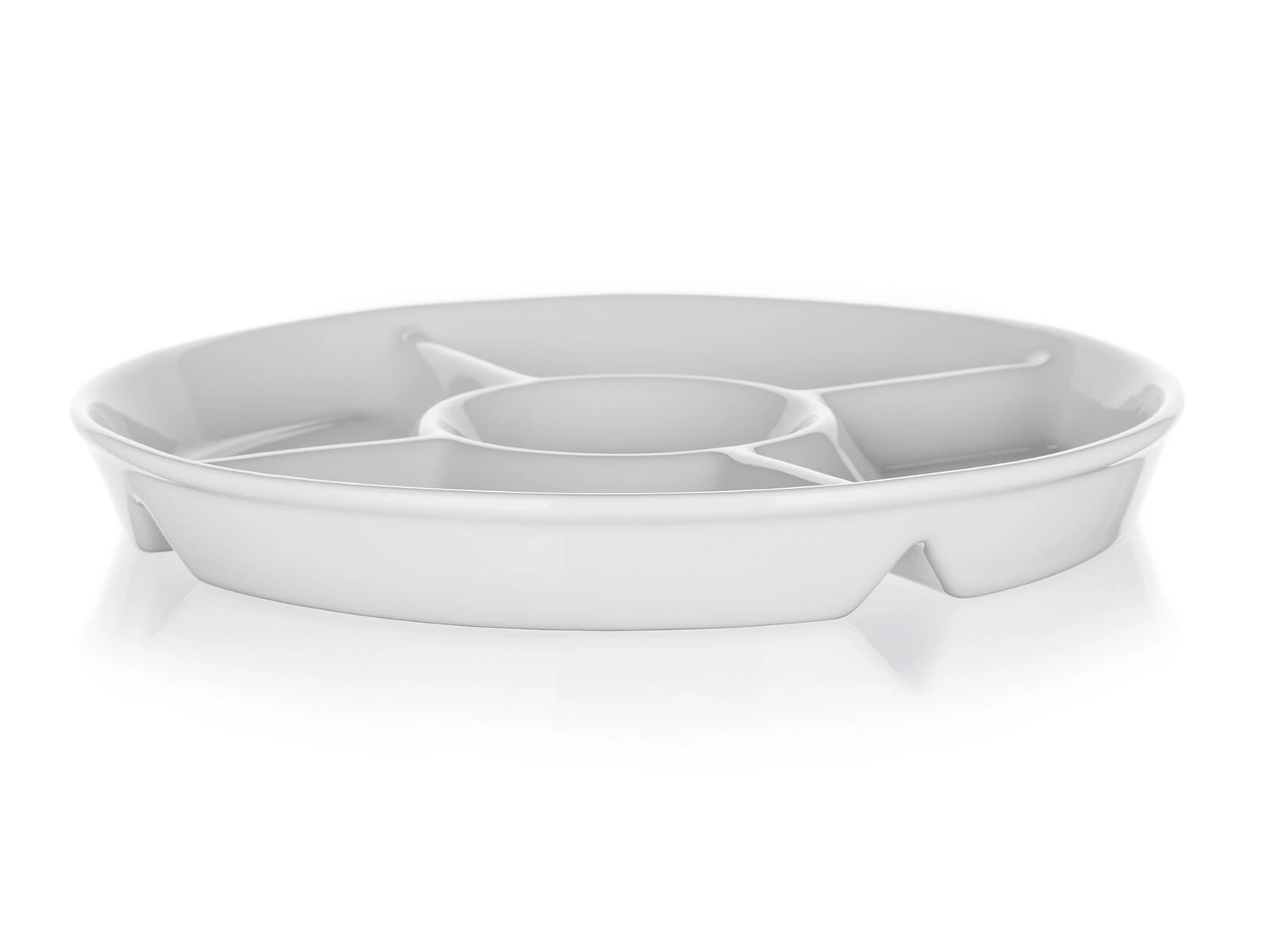 Več prekatov omogoča strežbo različnih prigrizkov brez mešanja okusov – idealno za dipe, prigrizke in crudités.