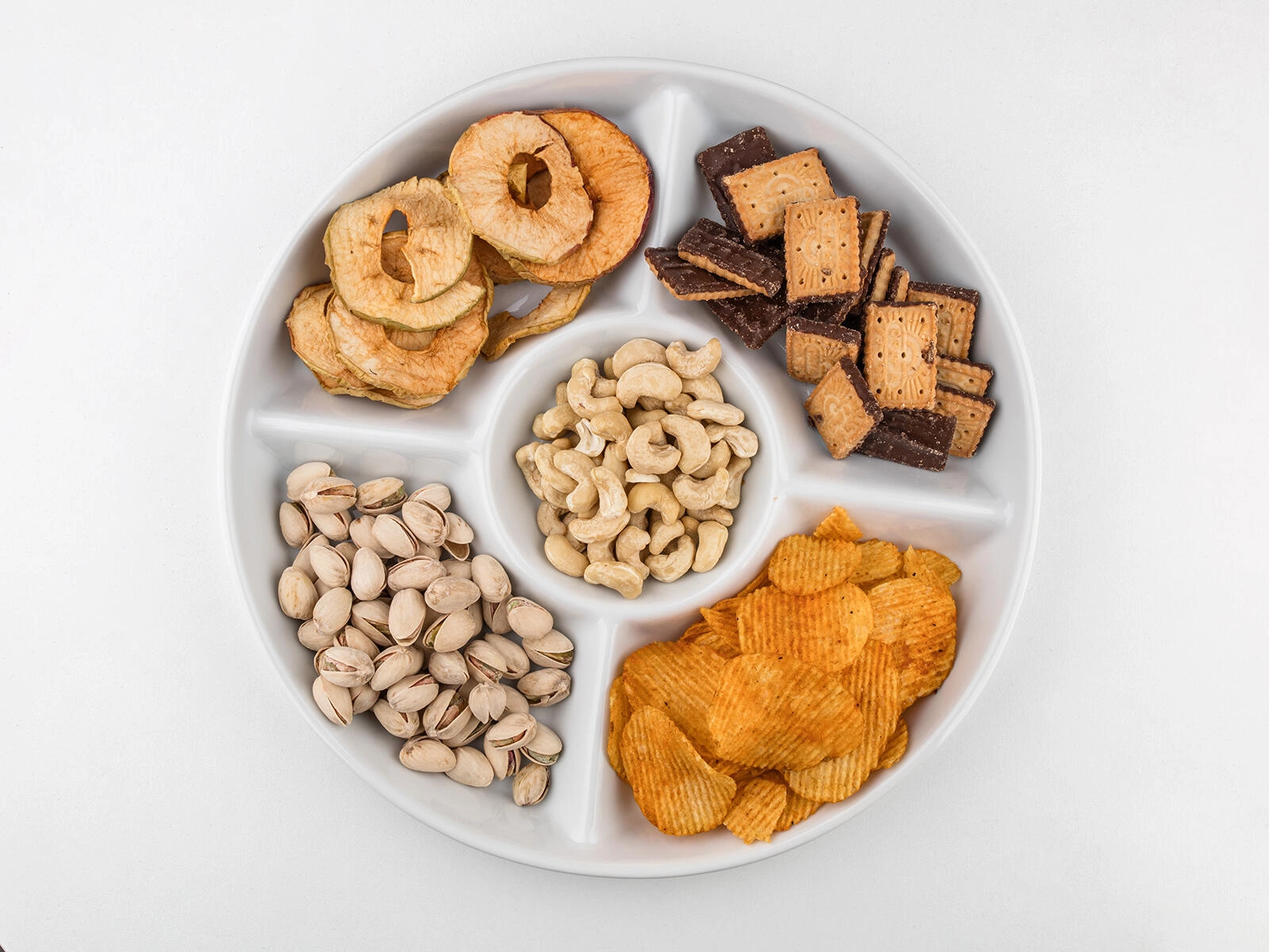 Dip, oreščki, čips, sadje, zelenjava, prigrizki