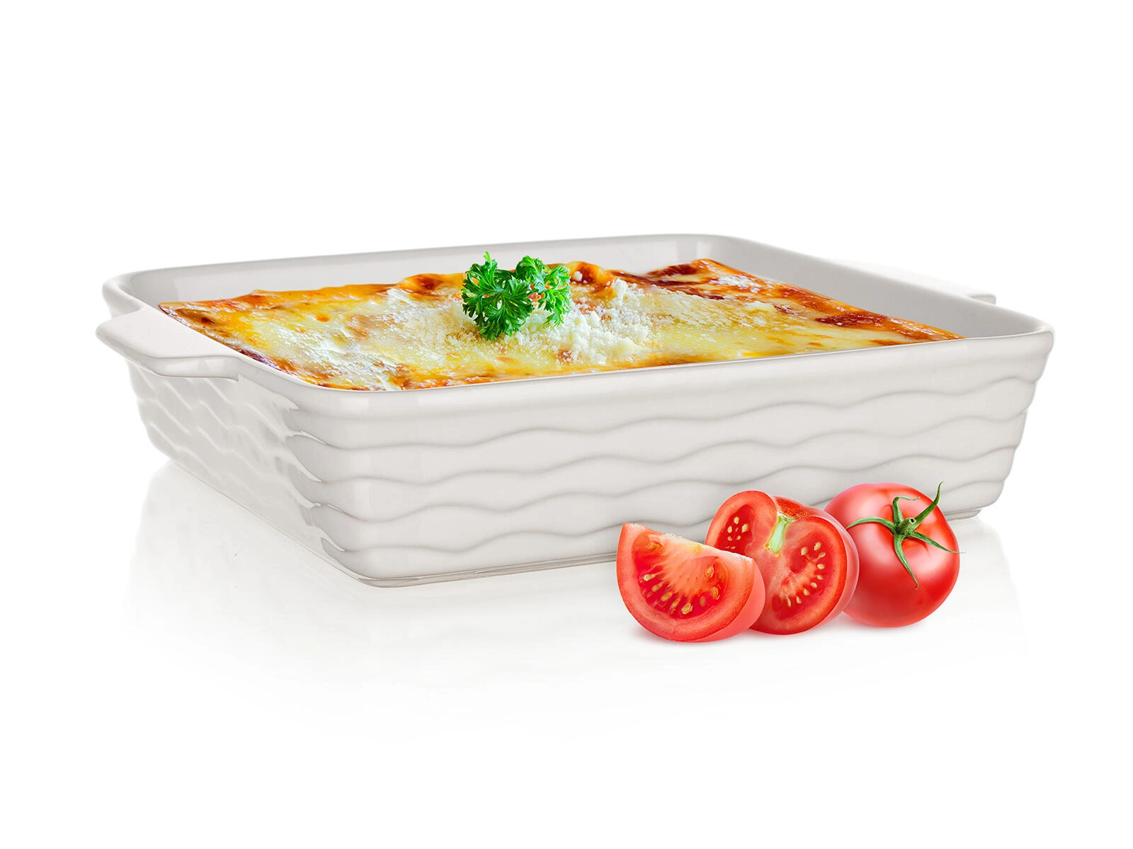 Kakovosten keramični material absorbira in postopoma sprošča toploto, zato se vaše lazanje, gratinirane testenine in zelenjava spečejo enakomerno in brez prismoditev.