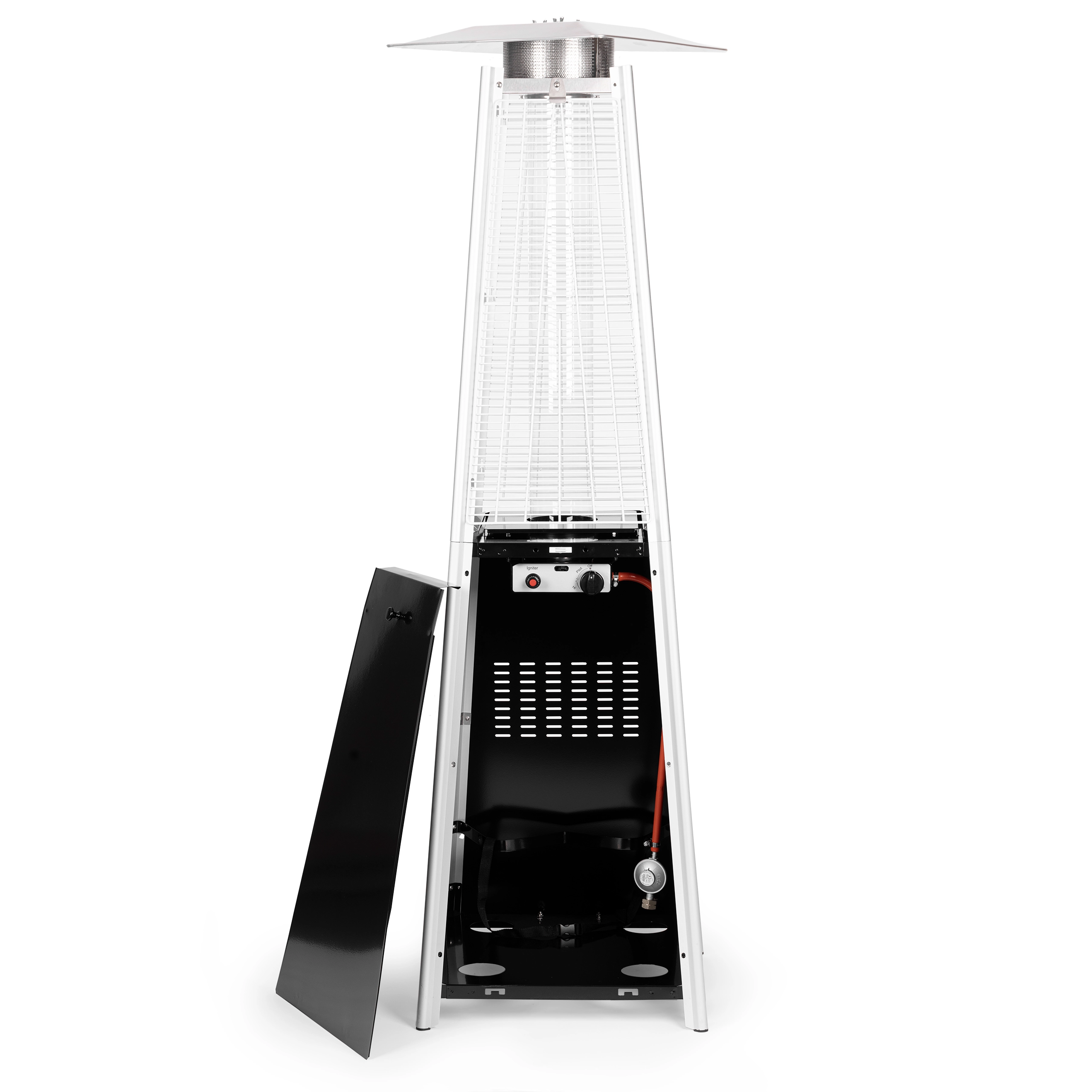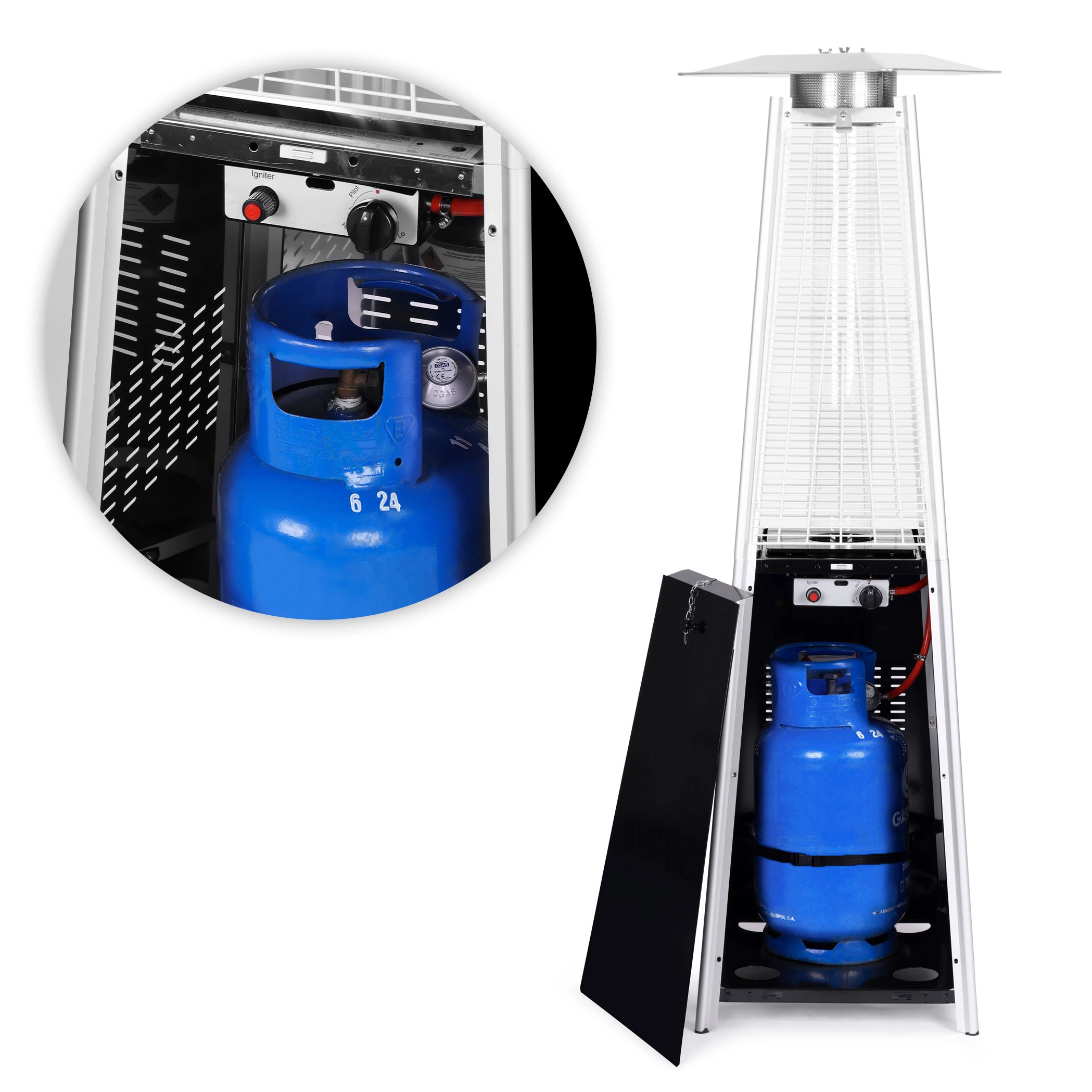 Za največjo varnost ima grelec zaklenjen prostor za PB jeklenko (do 11 kg) z varnostnim trakom. V paketu je regulator tlaka s cevjo ter vodoodporna prevleka za zaščito pred dežjem in prahom. Idealna rešitev za celoletno druženje na prostem.