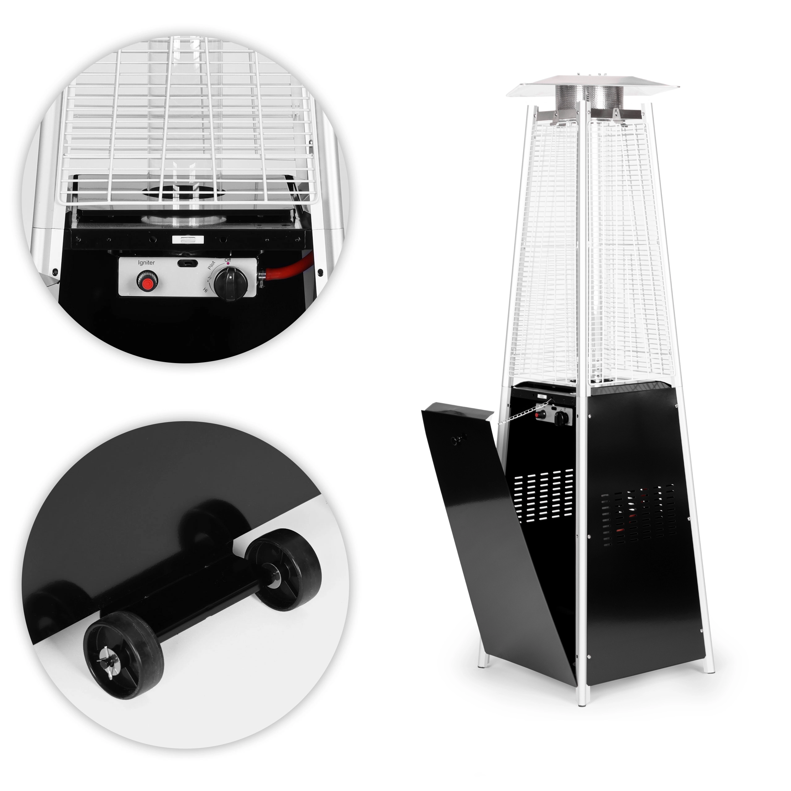 Nadzorna plošča omogoča stopenjsko nastavitev moči glede na vreme. Električni vžig (1× AAA, ni priložena) olajša zagon, energijsko varčno delovanje pa varčuje s plinom. Vgrajena transportna kolesca in gumirani čepi na nogah poenostavijo premikanje in ščitijo tla.