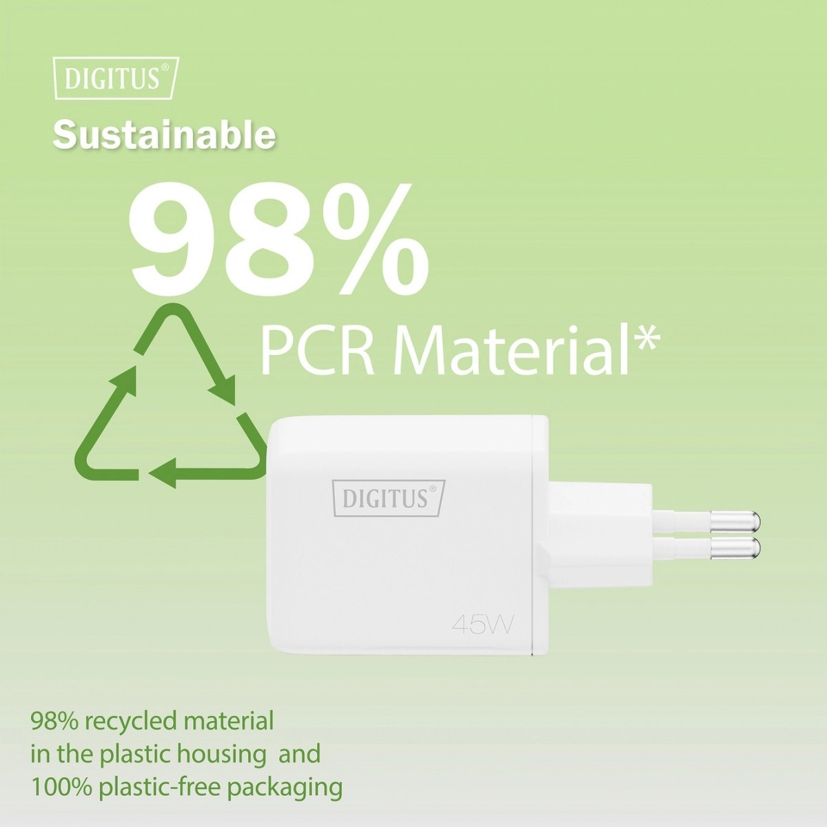 Vrat USB‑C nudi moč do 45 W, vrat USB‑A do 22,5 W. Pri hkratni uporabi obeh vrat polnilec inteligentno razdeli moč na 25 W (USB‑C) in 18 W (USB‑A) za varen in stabilen zagon. Zasnova iz 98 % PCR reciklirane plastike in 100‑odstotno embalažo brez plastike prinaša okolju prijaznejšo izbiro brez kompromisov pri kakovosti.