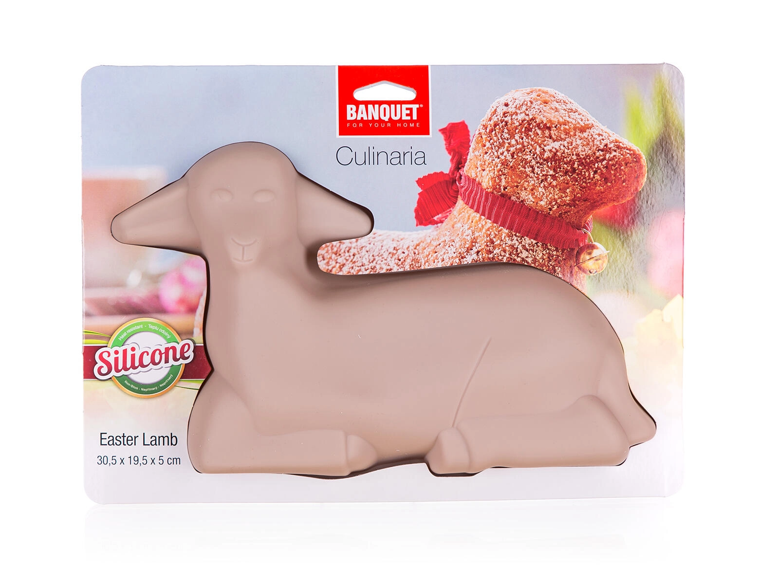 Praktičen silikonski model za velikonočno jagnje z merami 30,5 × 19,5 × 5 cm iz kolekcije Culinaria. Zahvaljujoč neprijemljivemu silikonu bo peka enostavna, brez prijemanja in z lahkim odstranjevanjem iz modela. Model je odporen na temperature do 230 °C, ne prevzema vonjav in okusov ter ga je mogoče pomivati v pomivalnem stroju.