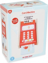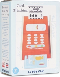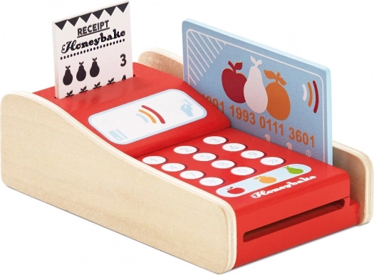Otroški plačilni terminal iz masivnega kavčukovega lesa dopolni vsako kuhinjico ali trgovinico. Zahvaljujoč realističnemu videzu, gumbom in reži za kartico si otroci urijo socialne veščine, komunikacijo in prve račune. Igrača je trdna, vzdržljiva in zasnovana tako, da prenese vsakodnevno igro.