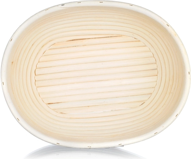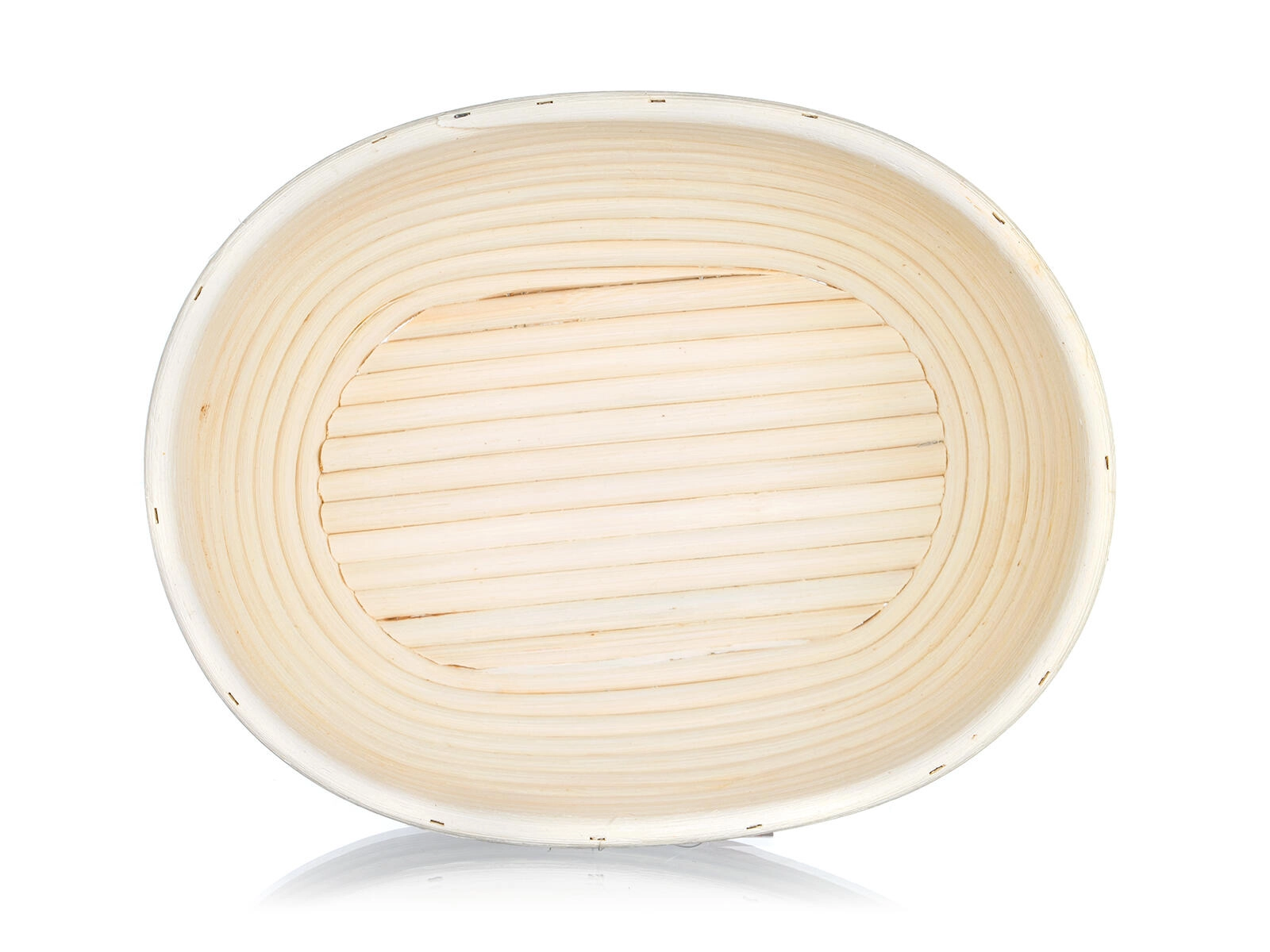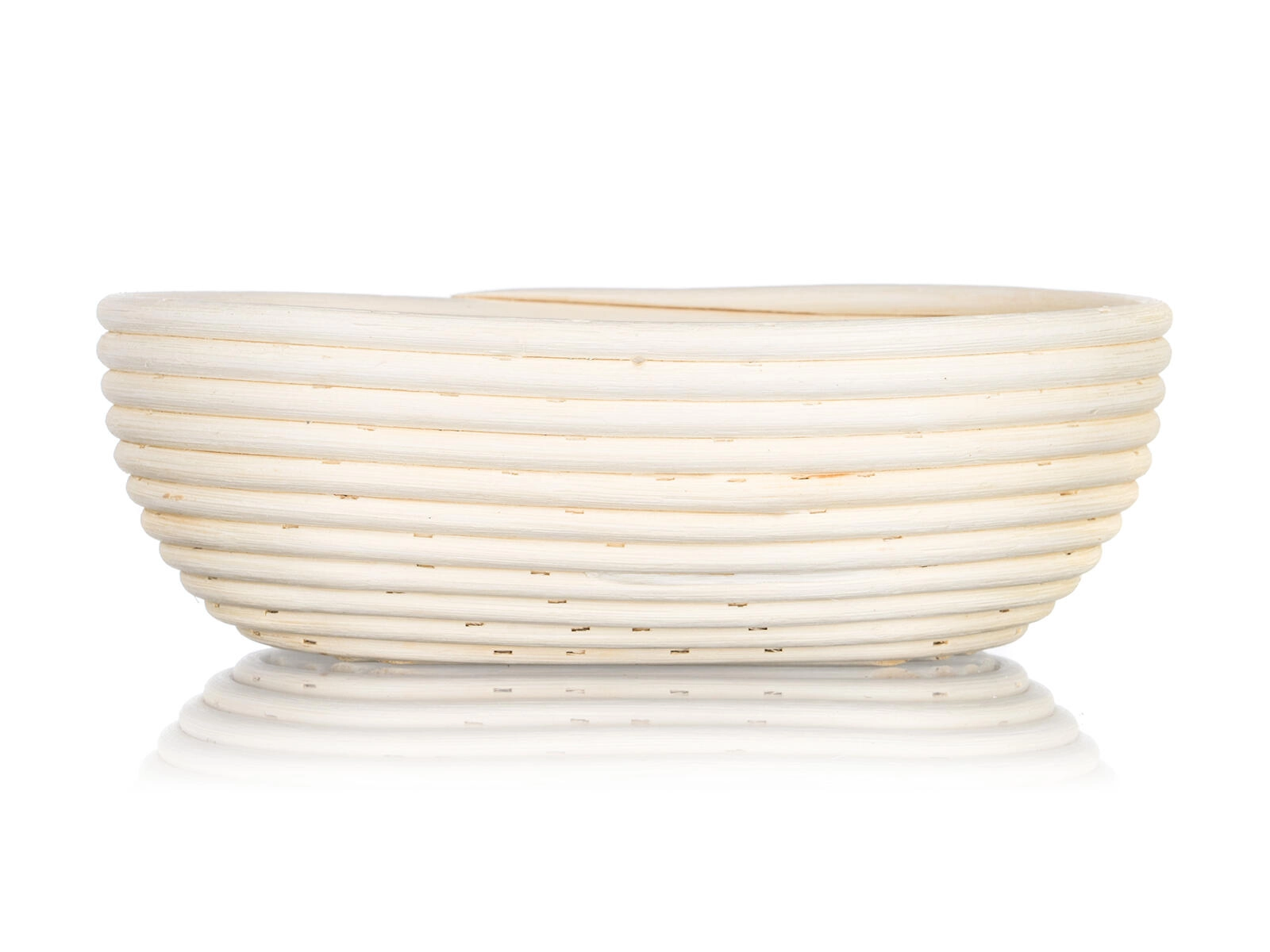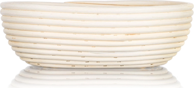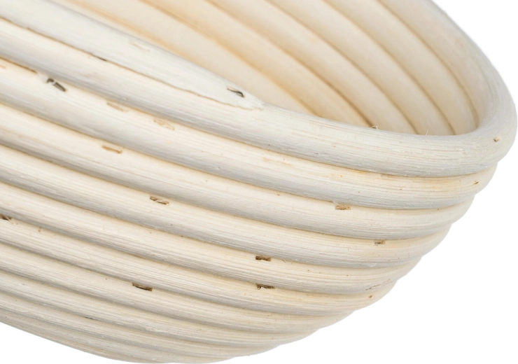 Ovalna košara iz naravnega ratana (pediga) je nepogrešljivo orodje za domače in profesionalne peke. Zaradi svoje strukturne stabilnosti in finega rebranja podpira pravilno vzhajanje testa, pomaga ohraniti obliko hlebca in na skorji ustvari privlačen spiralni vzorec, značilen za obrtniški kruh.