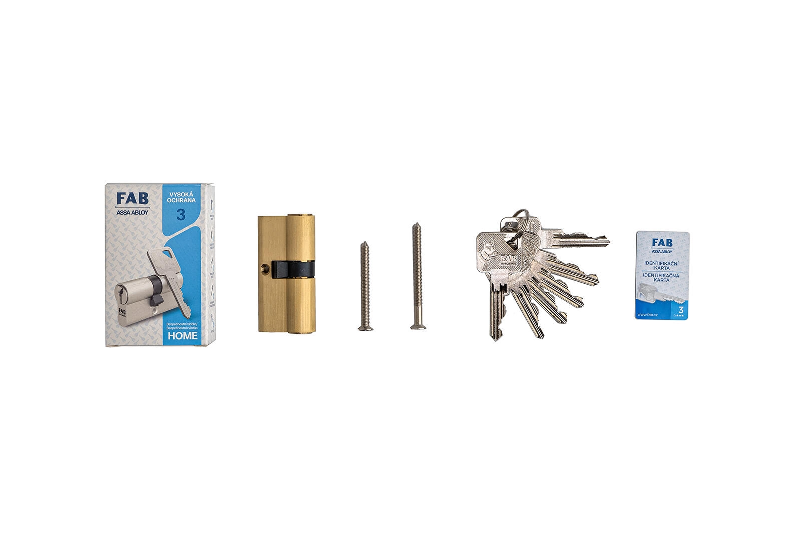 Varnostni cilindrični vložek FAB 3 HOME v dimenziji 30/35 mm ponuja stalno visoko raven zaščite za stanovanjska in vhodna vrata. Ima 6-zatični zaklepni sistem, zaščito proti vrtanju in je dobavljen s 6 ključi. Medeninasto ohišje in boben zagotavljata dolgo življenjsko dobo, prisotna sta patentno zaščiten paracentrični profil in identifikacijska kartica za nadzor podvajanja ključev.