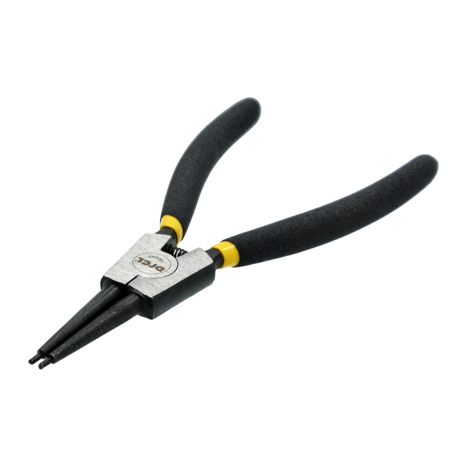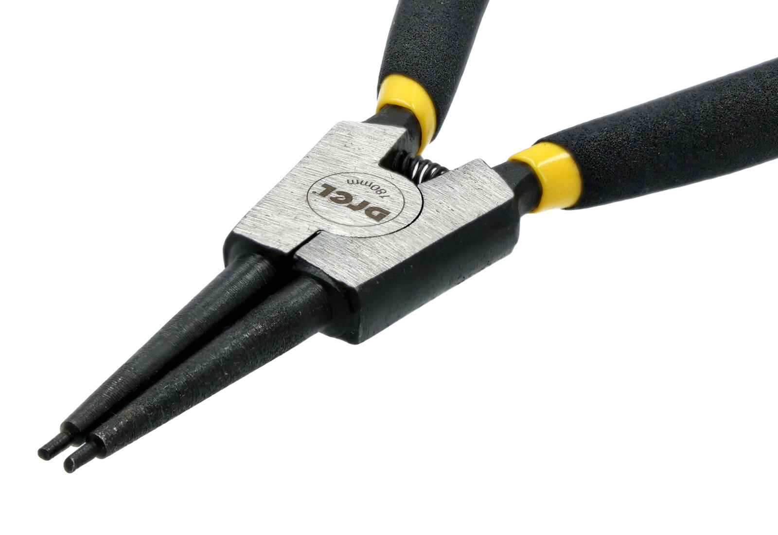 Profesionalne klešče DREL za zunanje varnostne obročke dolžine 180 mm za hitro in natančno delo na gredih in oseh. Ponašajo se z finimi dolgimi čeljustmi za varno prijemanje obročkov, vzmetnim mehanizmom za udobno odpiranje ter ergonomskimi protizdrsnimi ročaji za zanesljiv oprijem tudi pri daljšem delu.