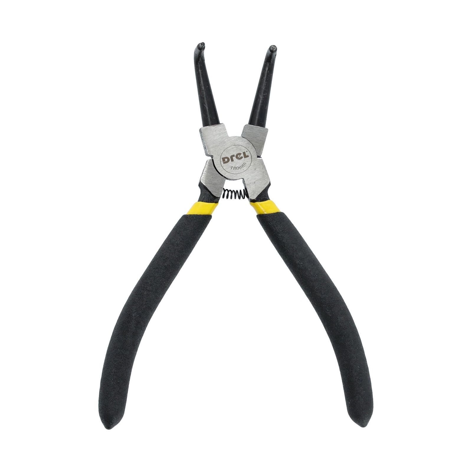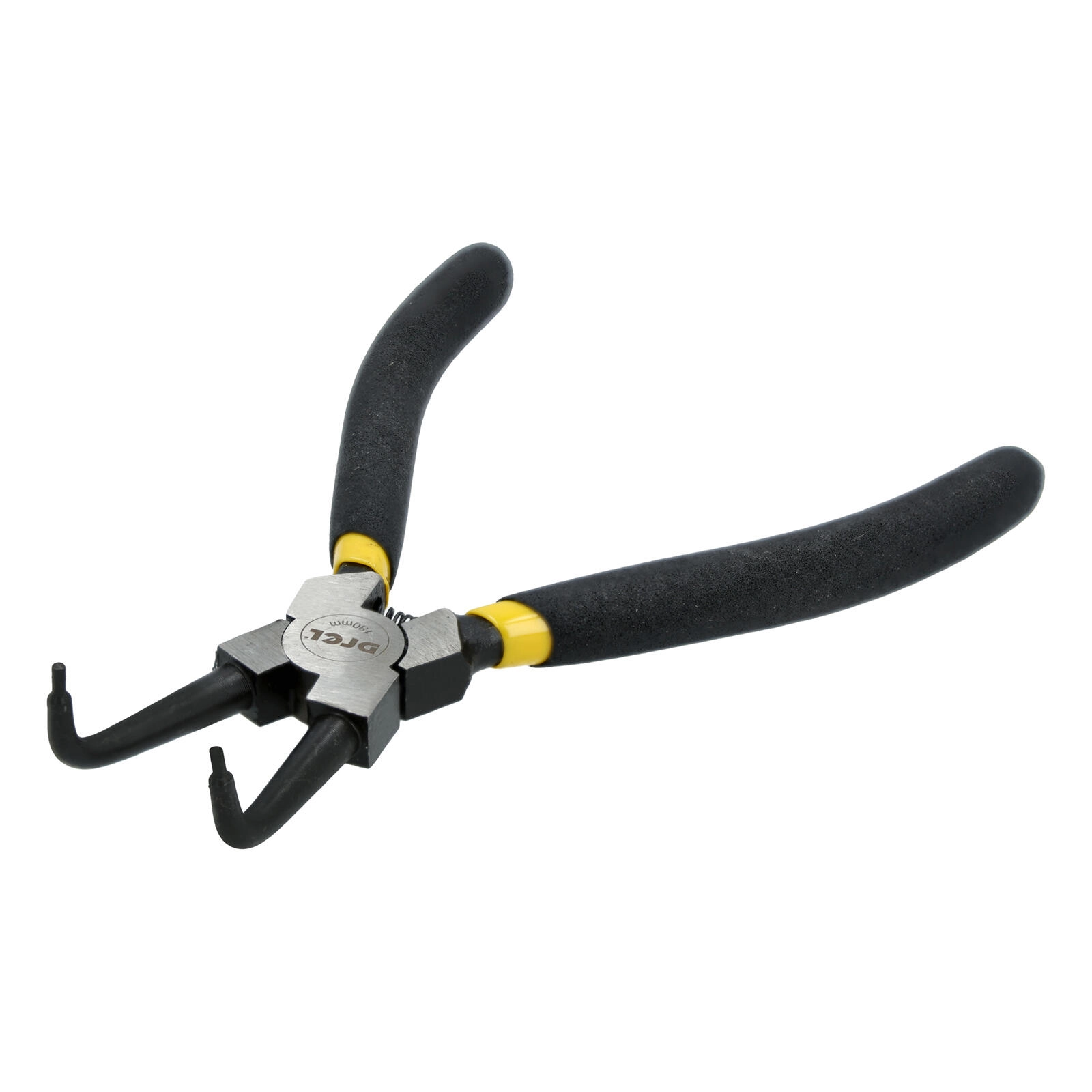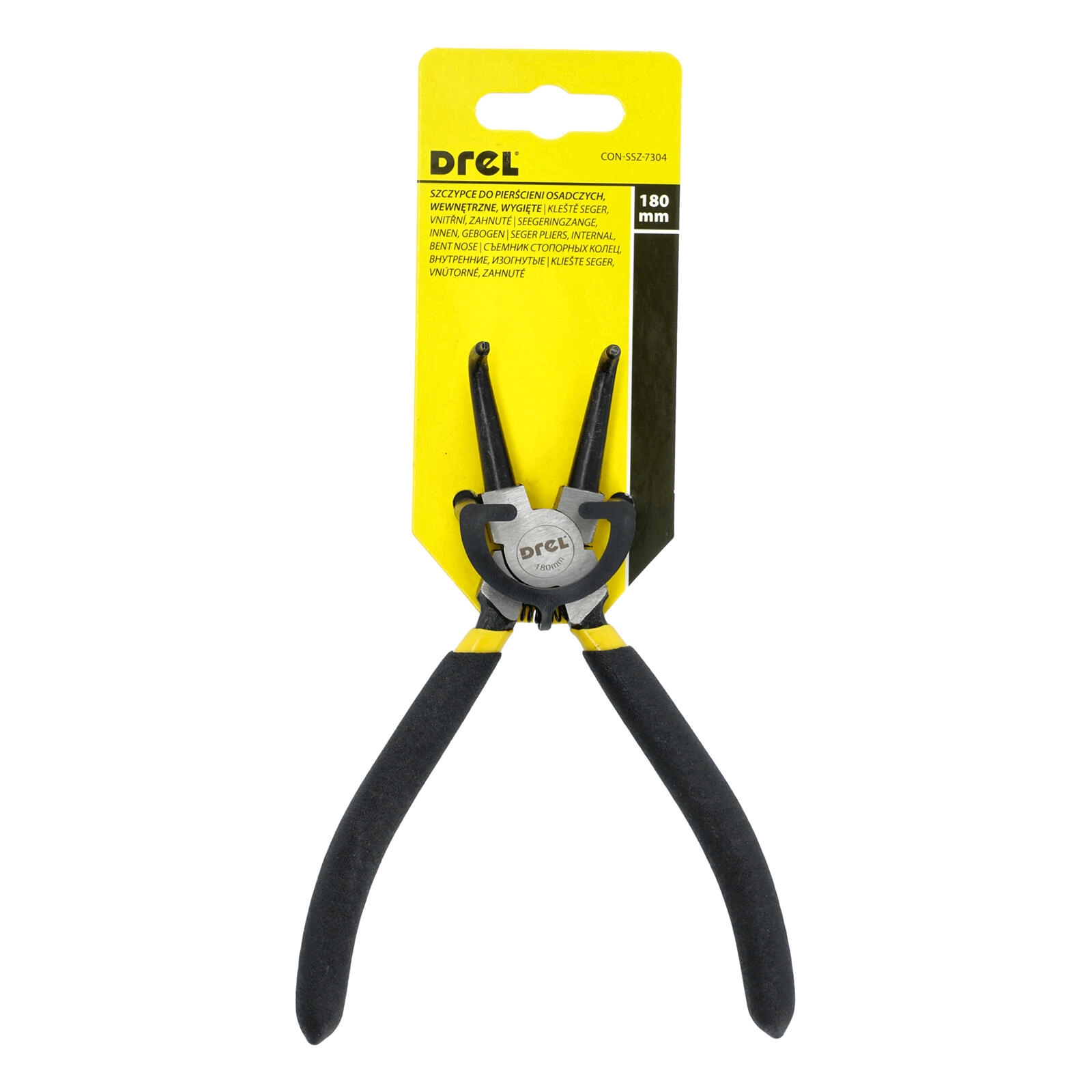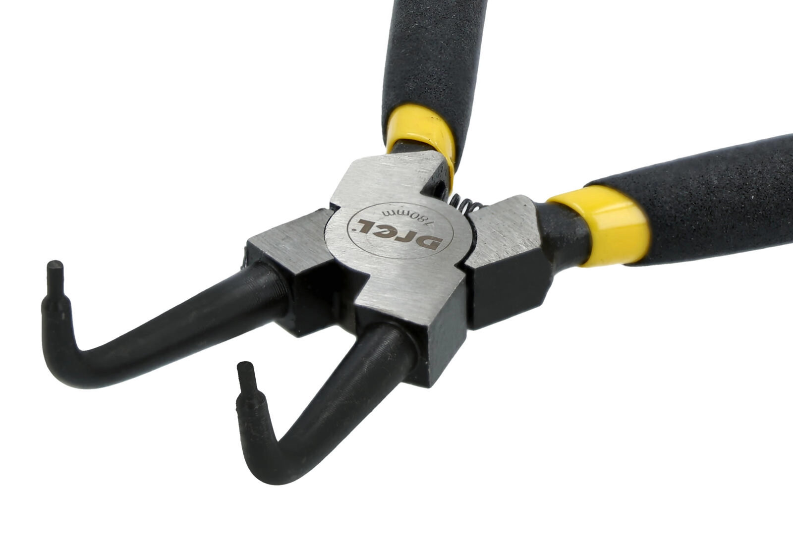 Te notranje klešče za segerje DREL z ukrivljenimi konci olajšajo ravnanje z varnostnimi obroči v odprtinah in ležiščih ležajev. Zahvaljujoč ergonomskim, protidrsnim ročajem in vzmetni asistenci boste natančno delali tudi v utesnjenih prostorih brez napora.
