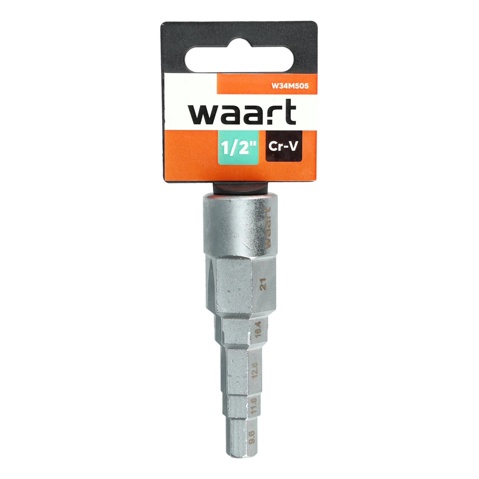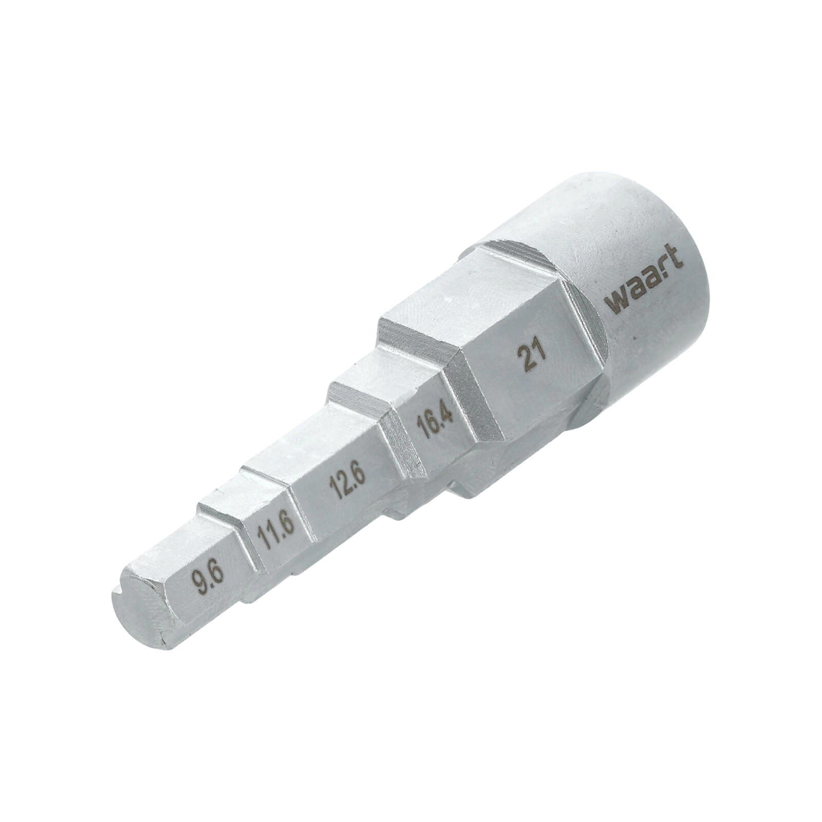 Stopničasta zasnova omogoča hitro preklapljanje med merami 3/8", 29/68", 1/2", 21/32" in 27/32" (9,6–21 mm) brez potrebe po menjavi orodja.