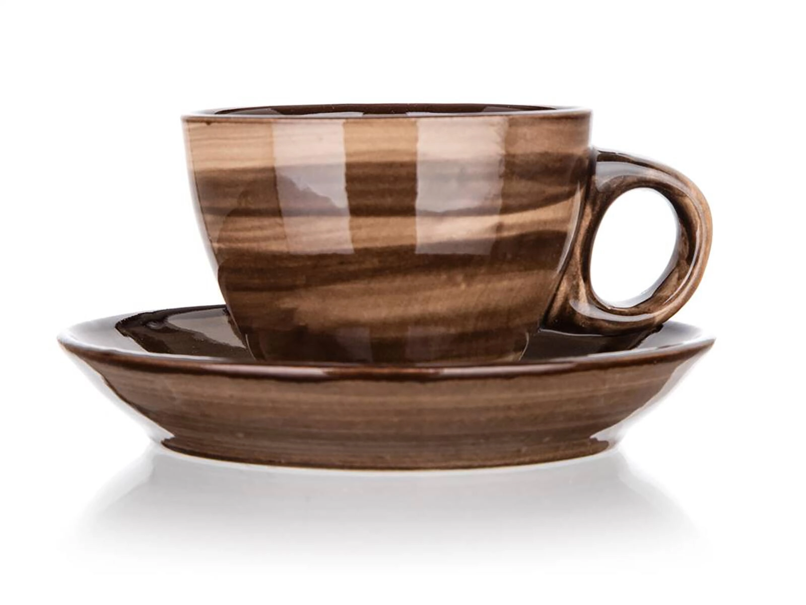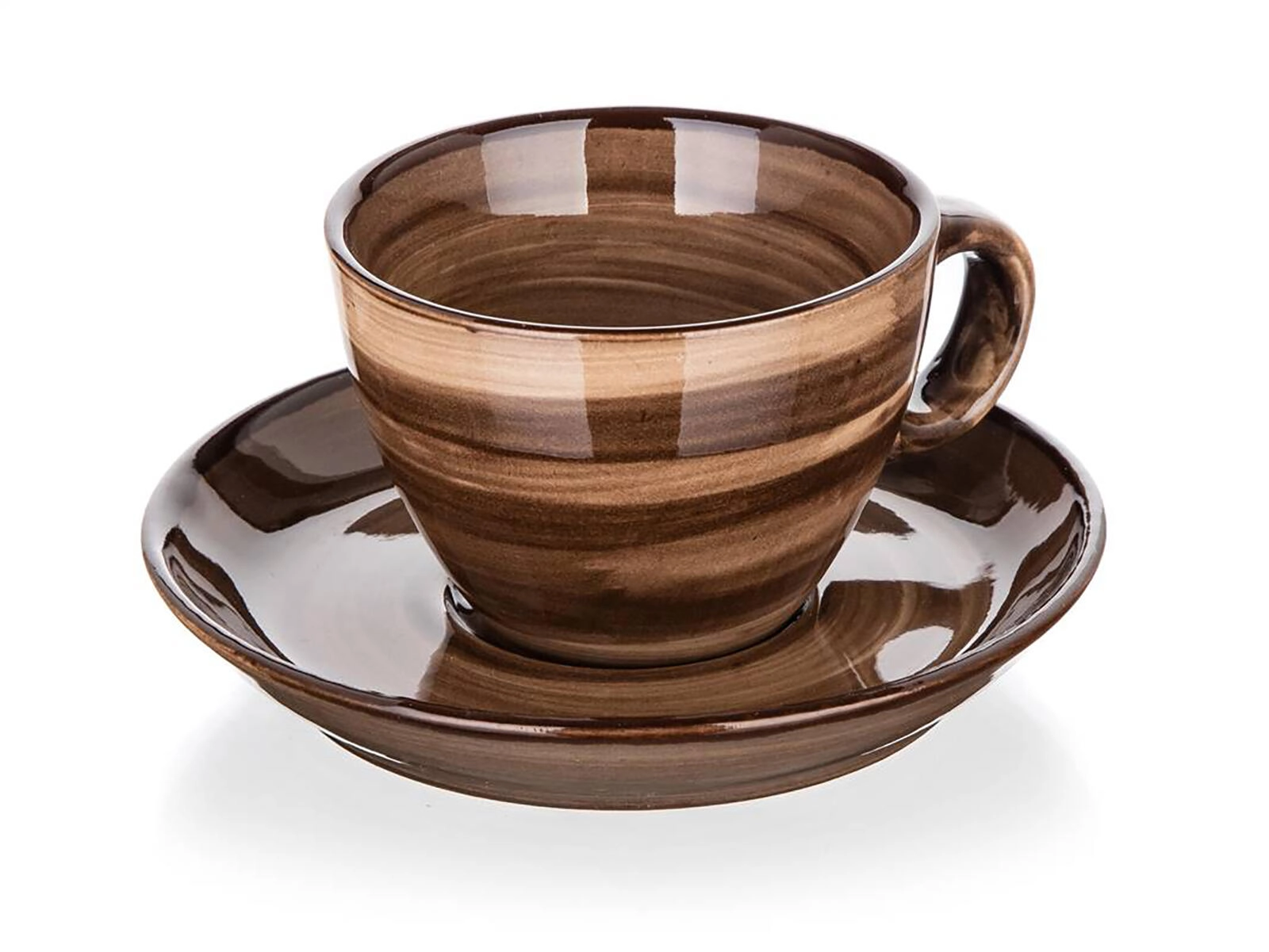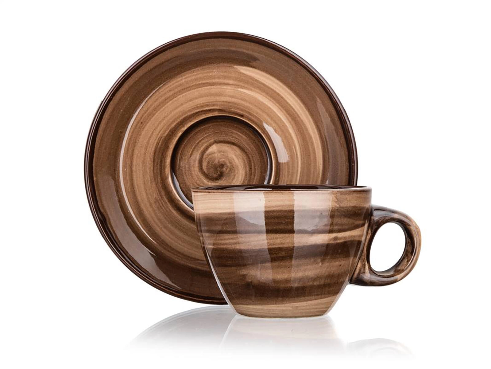 Elegantno rjavo marmoriranje in sijoča glazura ustvarita premium videz, medtem ko krožniček poskrbi za stabilnost in ujame kapljice.