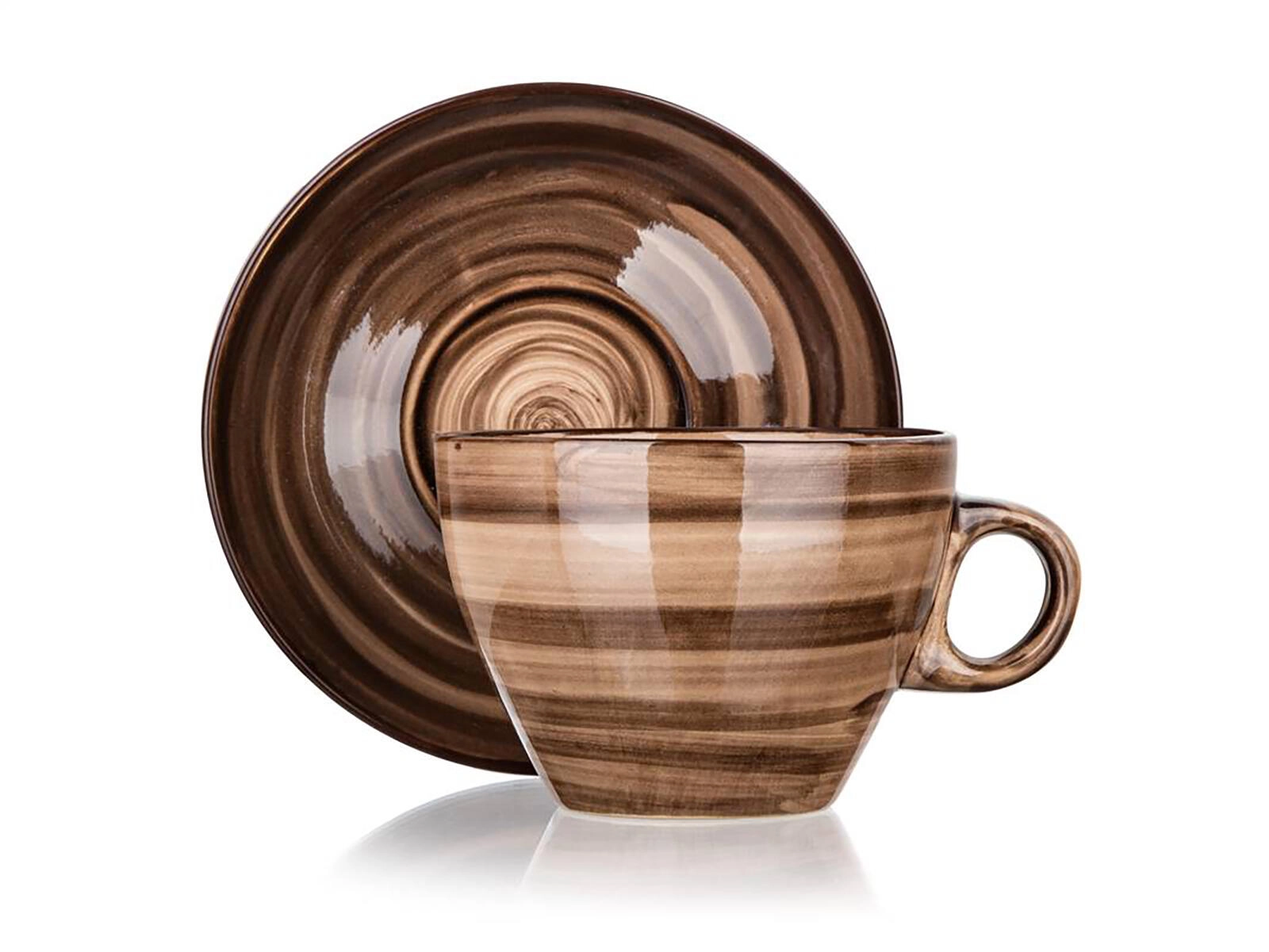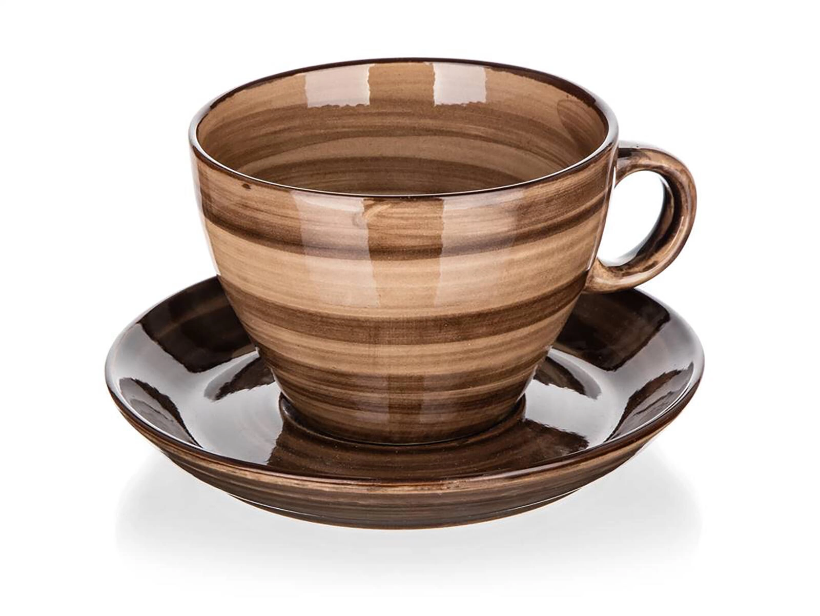 Svetleča, večbarvna rjava glazura z diskretnimi črtami daje skodelici in krožničku brezčasen videz ter se zlahka kombinira z drugim posodjem.