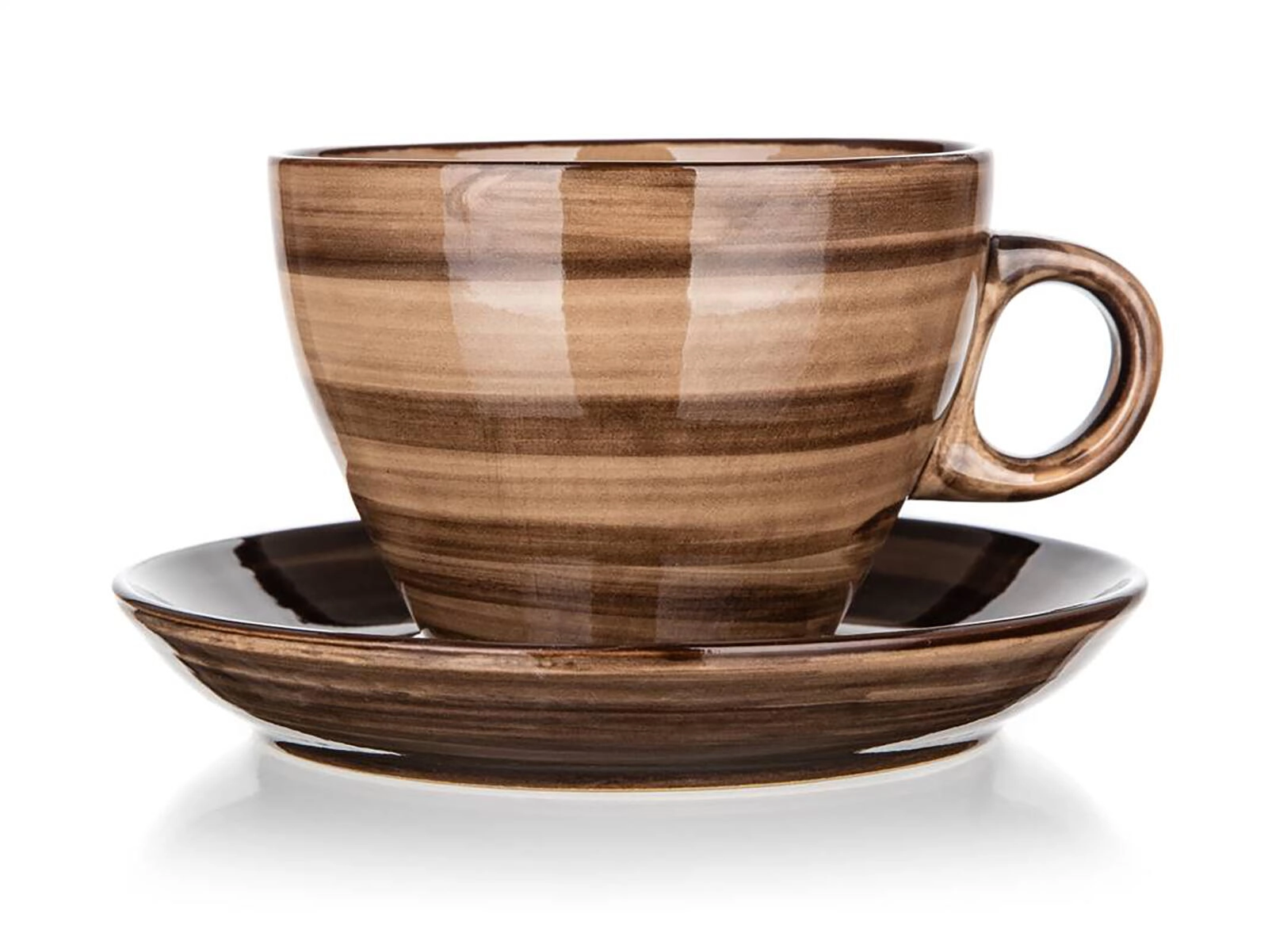 Privoščite si najljubši napitek v slogu s keramično skodelico in krožničkom Palas. Precizna glazura v toplih rjavih tonih in nežen črtast vzorec pričarata prijeten, naraven pridih na vaši mizi. Ergonomski ročaj zagotavlja udoben oprijem, krožniček pa varno prestreže kapljice.