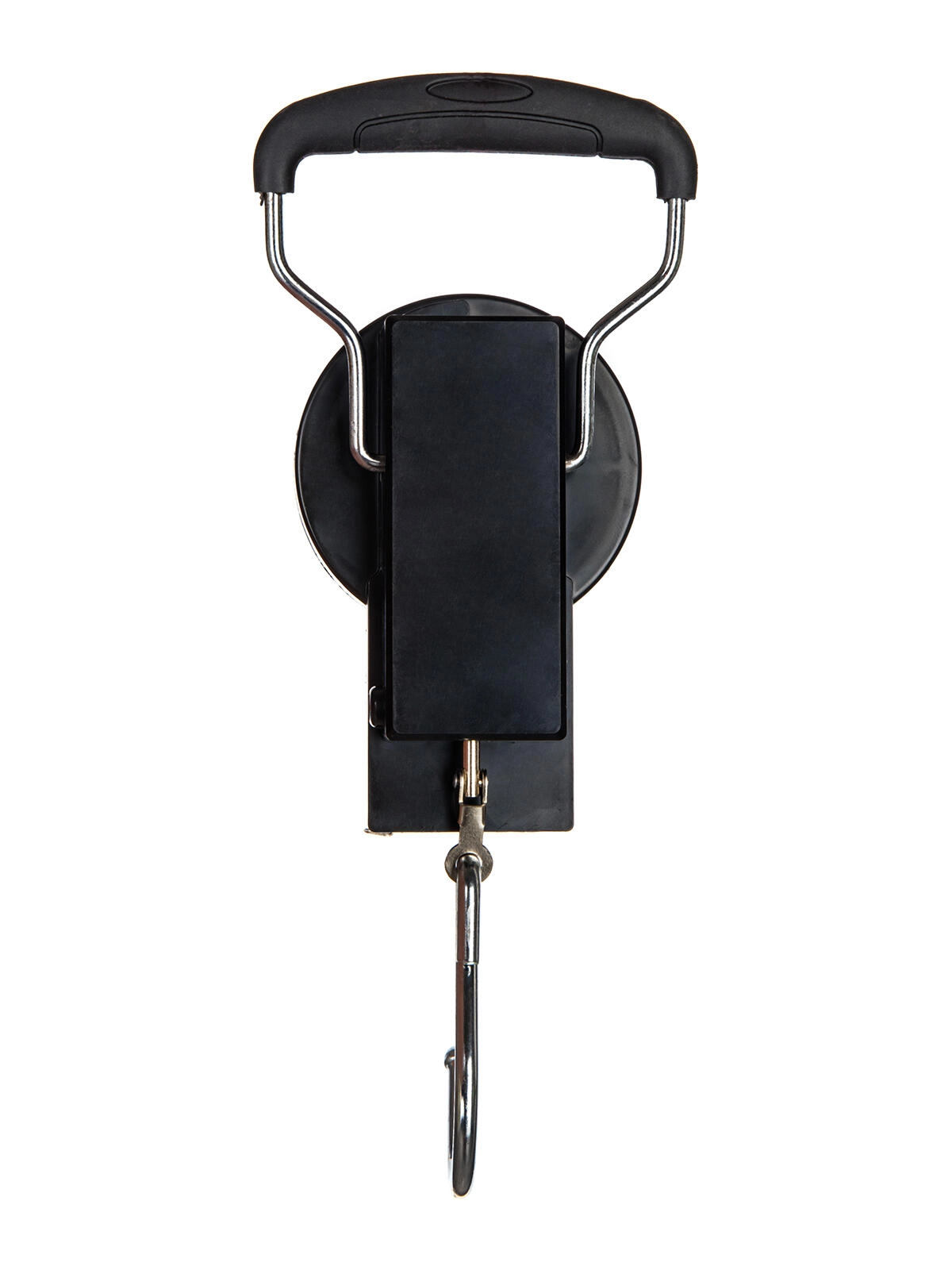Robustna kovinska kljuka varno drži tudi težje kovčke, ergonomski ročaj pa zagotavlja udobno dvigovanje in stabilen oprijem.