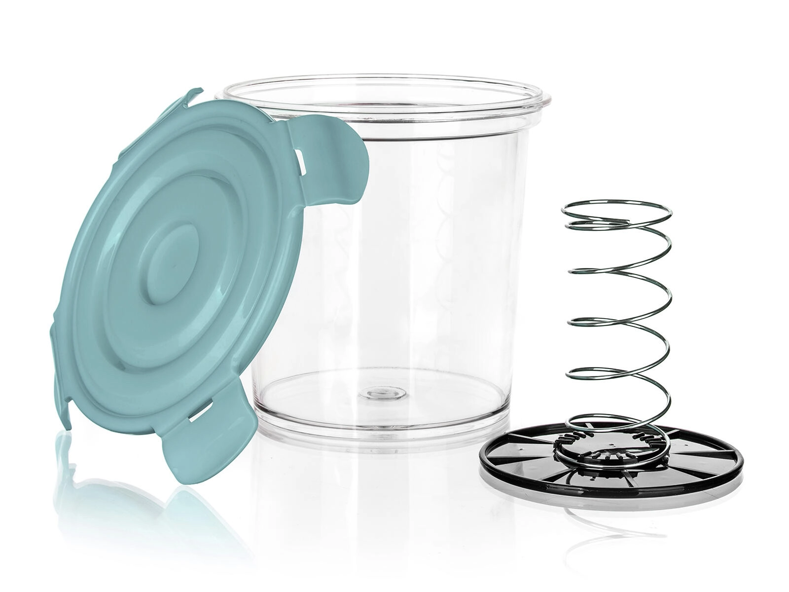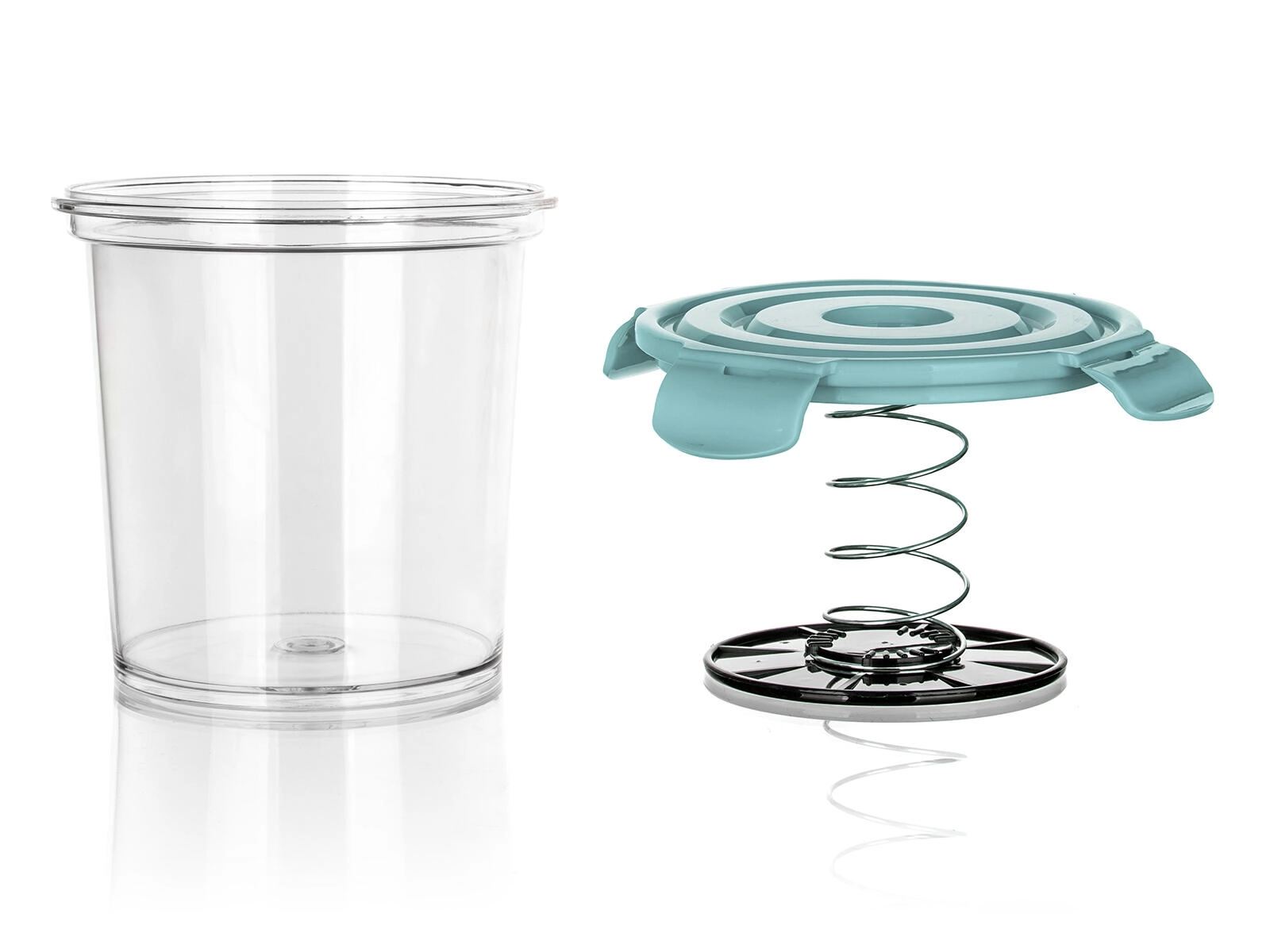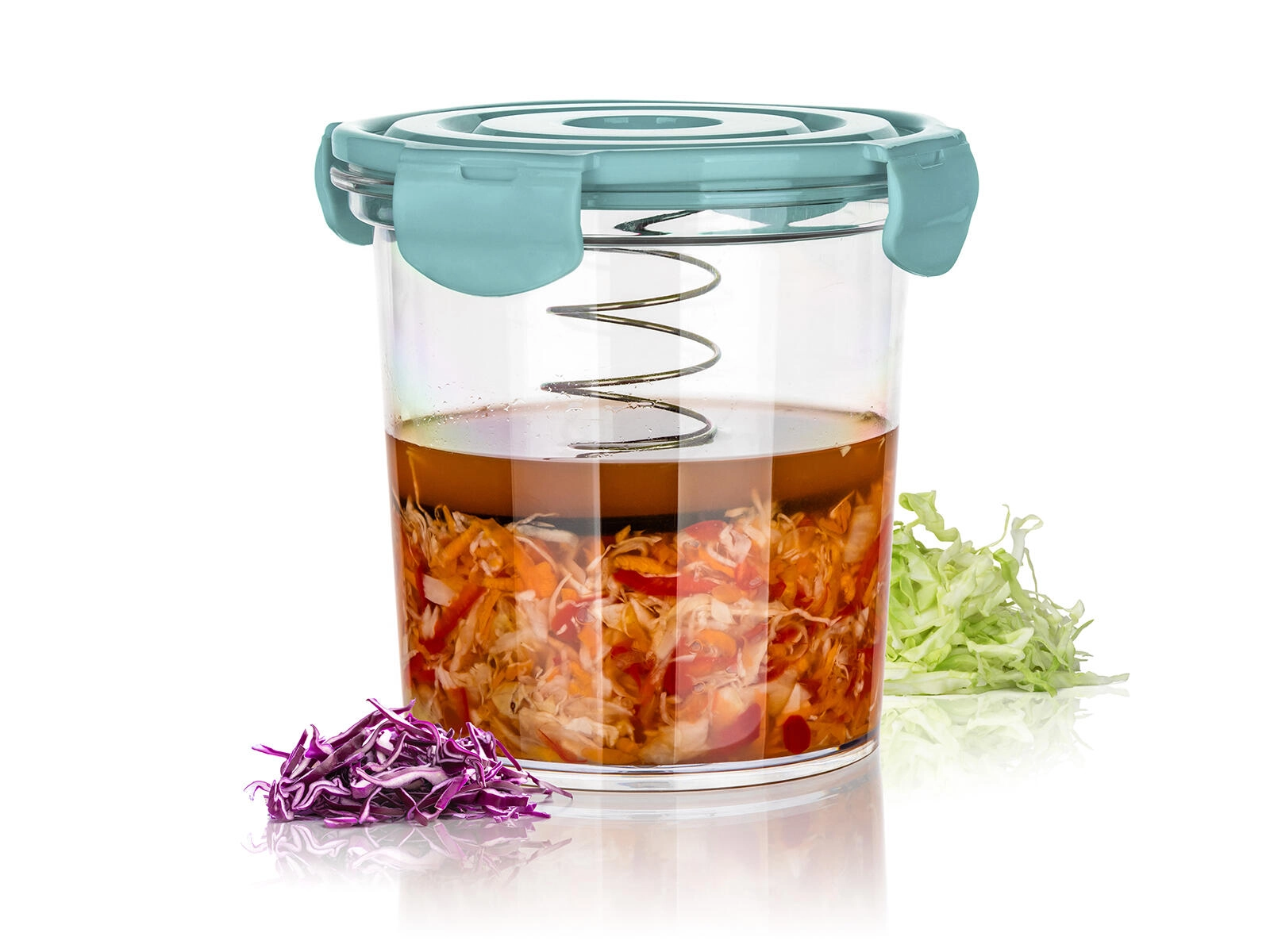 Vgrajena vzmet s pritisno ploščo ustvarja enakomeren pritisk, zato zelenjava in meso ostaneta ves čas pod gladino slanice – brez oksidacije in z boljšim okusom.