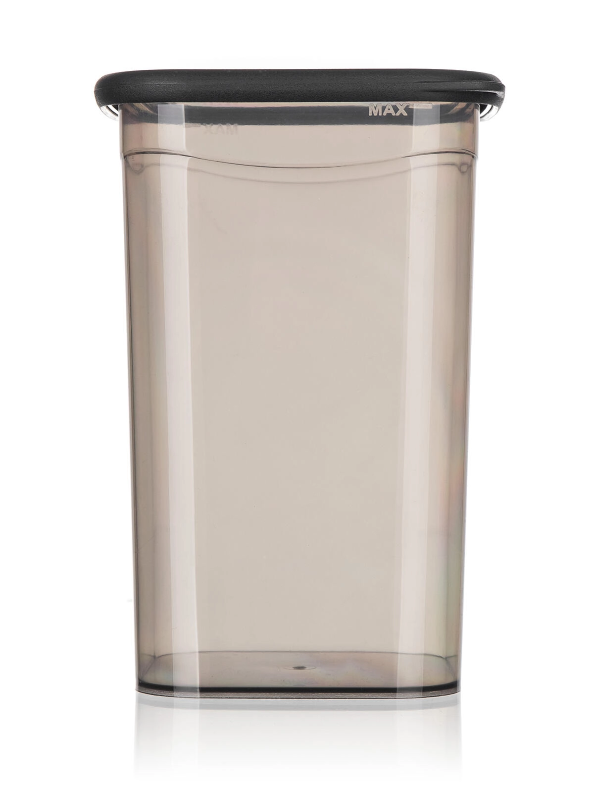 Posoda LISSA združuje moderno dimno izvedbo s praktično kvadratno obliko za učinkovito izrabo prostora. Prosojne stene omogočajo hitro preverjanje zalog, pokrov na klik pa pomaga zaščititi vsebino pred vlago in nečistočami. Idealna za vsakodnevno organizacijo shrambe.