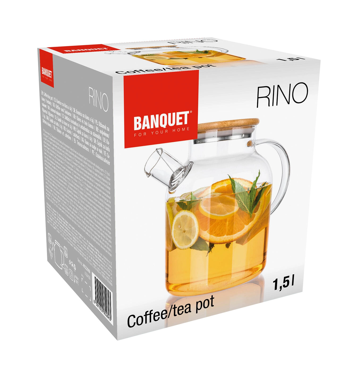Eleganten steklen čajnik Rino s prostornino 1,5 l je idealen za vroče in hladne napitke. Izdelan je iz odpornega borosilikatnega stekla ter ponuja spiralno cedilo za zadrževanje zelišč, bambusov pokrov z inox prevleko in silikonsko tesnilo proti uhajanju arome. Stekleno ohišje je primerno za pomivalni stroj.