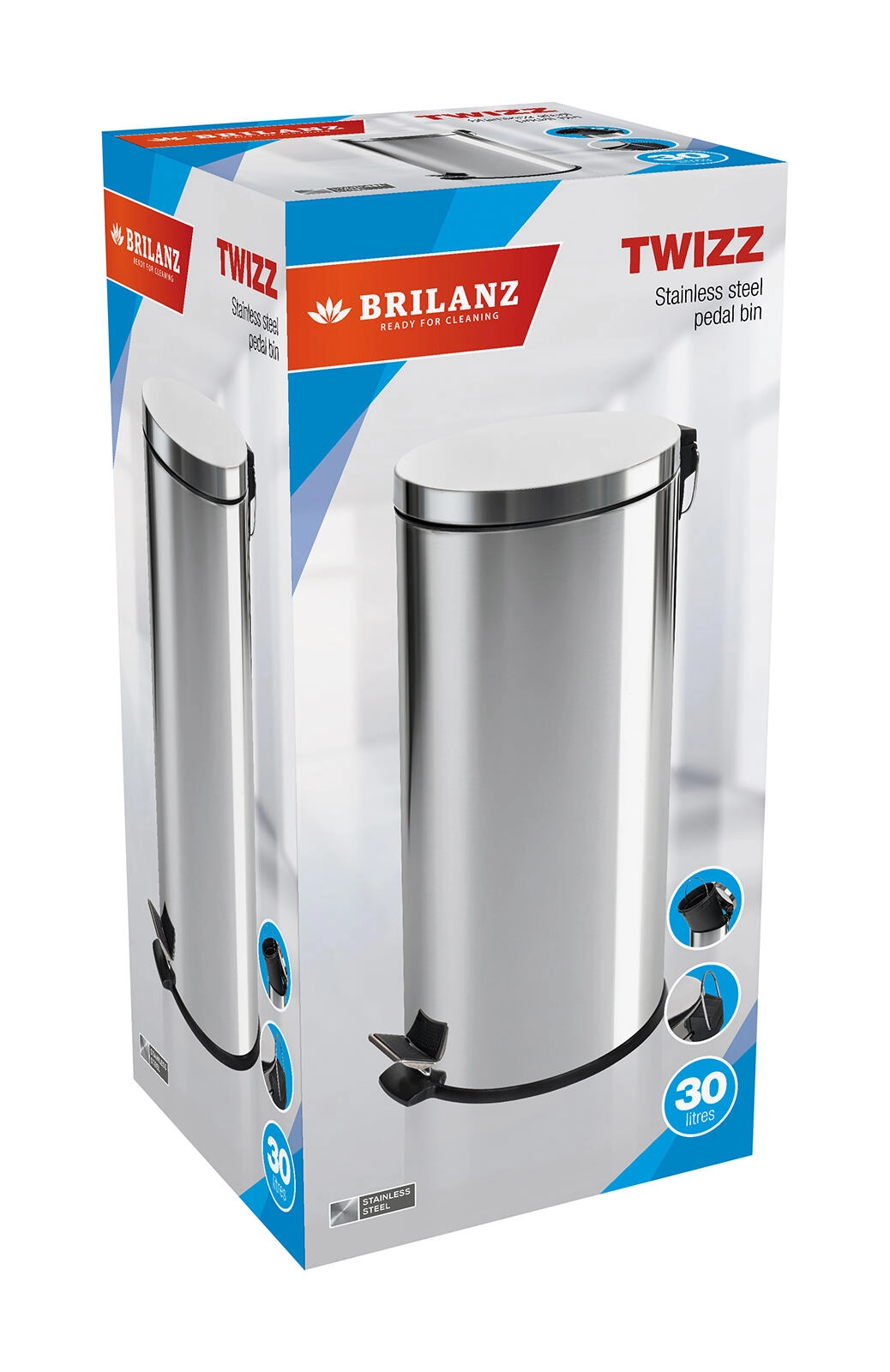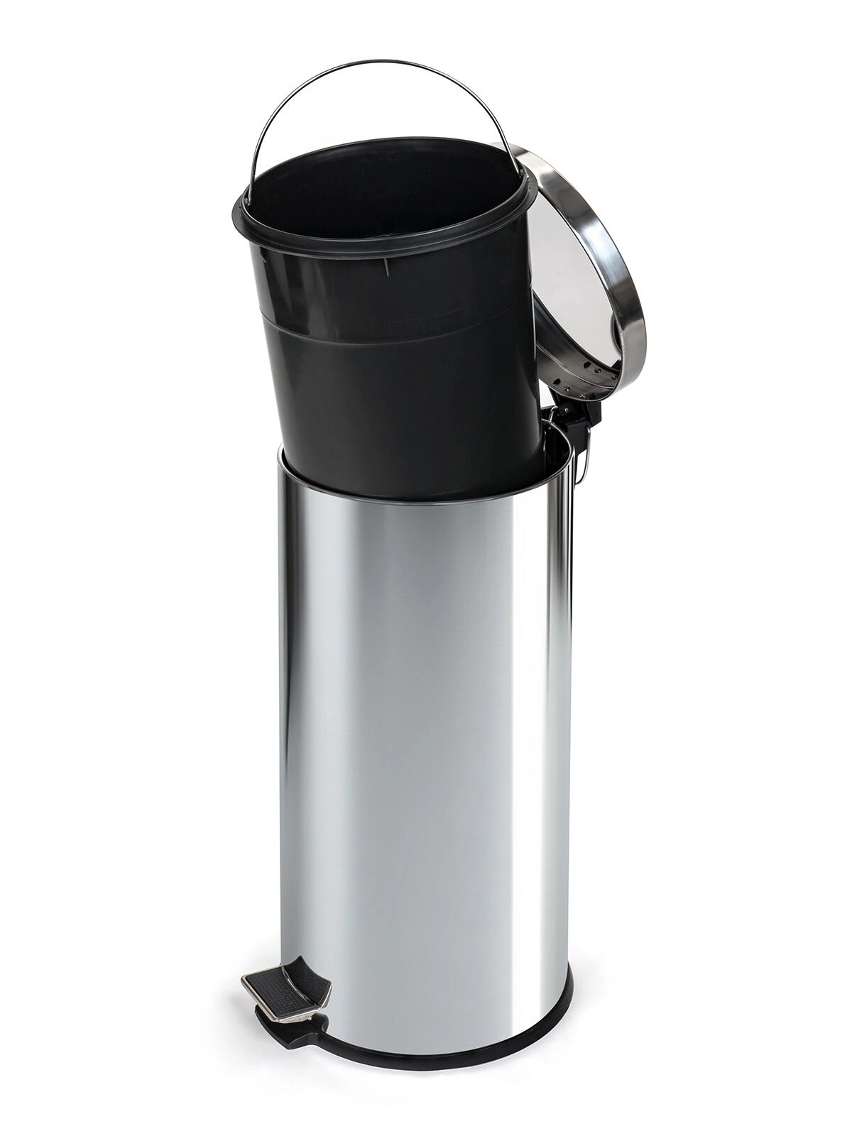 Ta koš za odpadke iz nerjavnega jekla s prostornino 30 litrov združuje sodoben videz s funkcionalnimi podrobnostmi za vsakodnevno udobje. Bleščeča površina iz nerjavnega jekla je odporna in preprosta za vzdrževanje, pedalni mehanizem zagotavlja odpiranje brez dotika rok in s tem višjo raven čistoče.