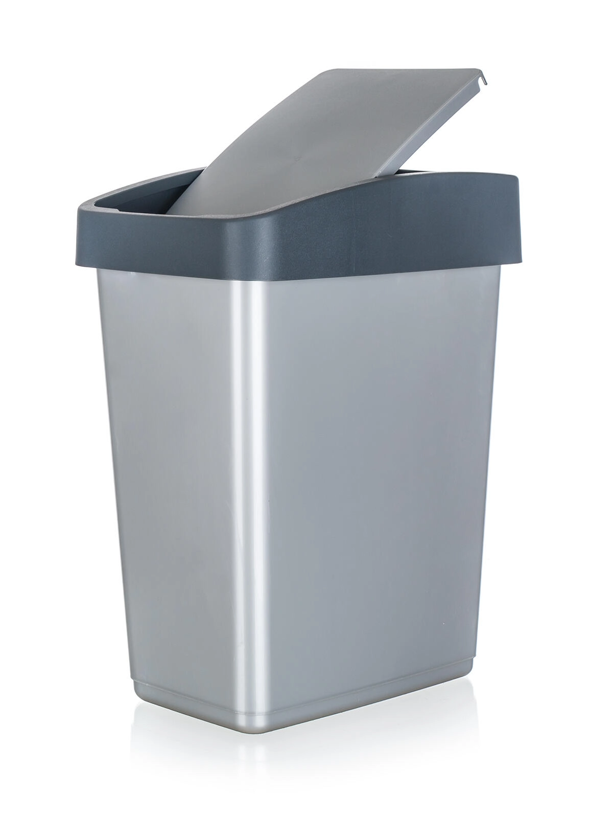 Praktičen koš za odpadke s prostornino 25 l v moderni srebrno-sivi barvi se preprosto vzdržuje in prihrani prostor zahvaljujoč pravokotni obliki. Pokrov z dvema načinoma omogoča odprto uporabo ali nihajno (push) funkcijo za udobno in higiensko odlaganje odpadkov. Trpežna plastična konstrukcija se zlahka čisti in je primerna za kuhinjo, pisarno in gospodinjstvo.