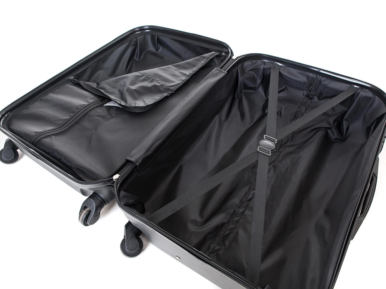 Notranjost je zasnovana za pregledno pakiranje: ločevalna tekstilna pregrada z zadrgo in žepom drži stvari na svojem mestu, medtem ko križni trakovi fiksirajo oblačila proti mečkanju. Dvojne drsnike zadrge je mogoče spojiti v integrirano številčno ključavnico za višjo varnost.