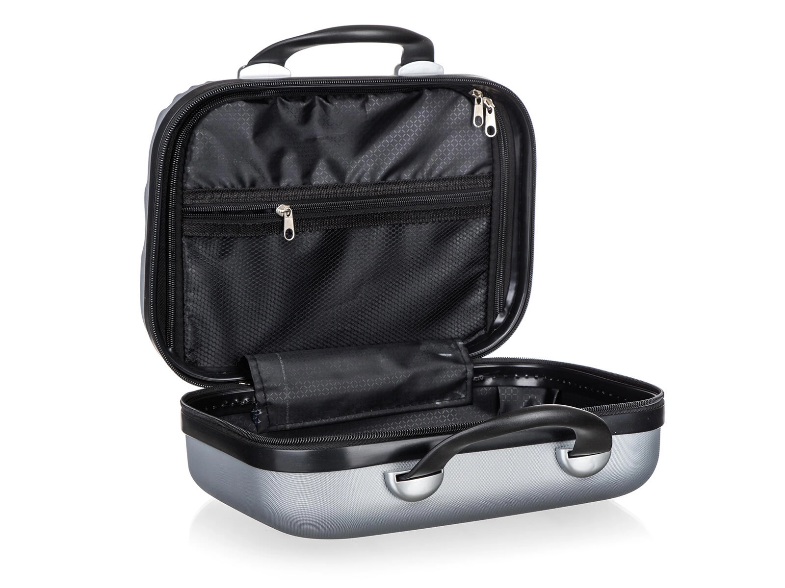 Notranjost ponuja tekstilno razdelilno pregrado na zadrgo in mrežasti žep za pregledno shranjevanje kozmetike, elektronike ali drobnih dodatkov. Dvojni drsniki zadrge omogočajo hitro odpiranje in varno zapiranje, medtem ko robustna ročaja zagotavljata udobno prenašanje.