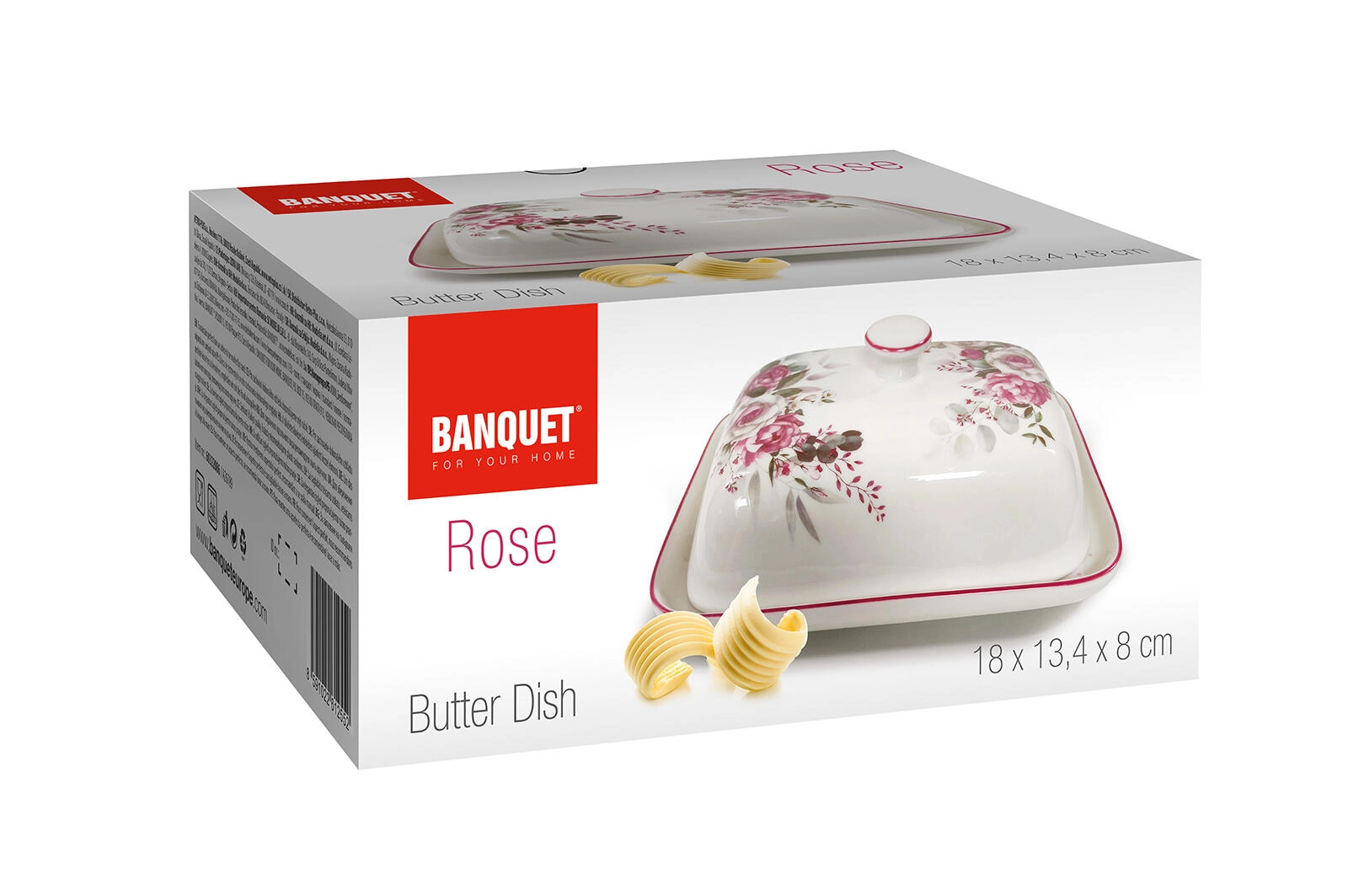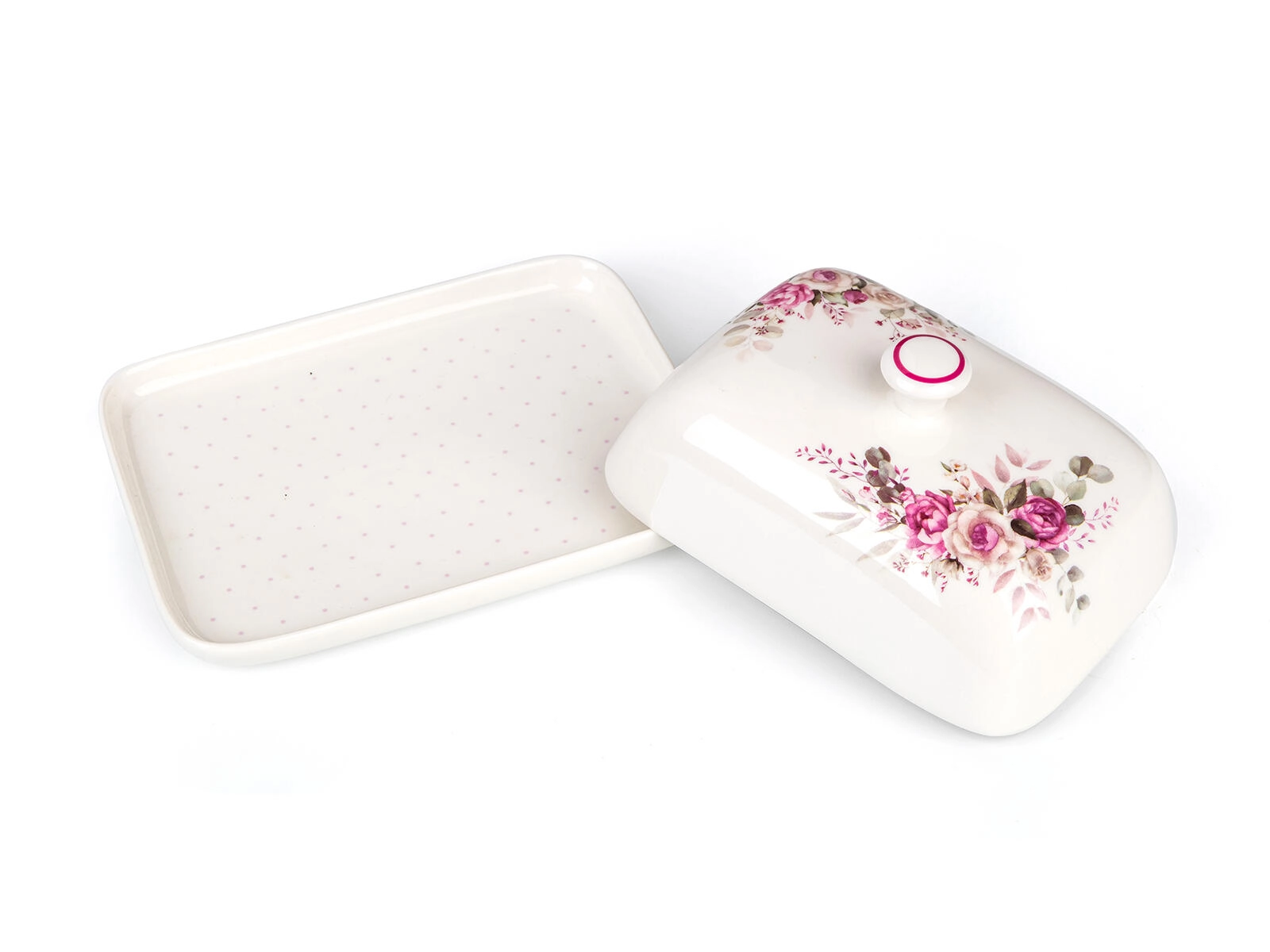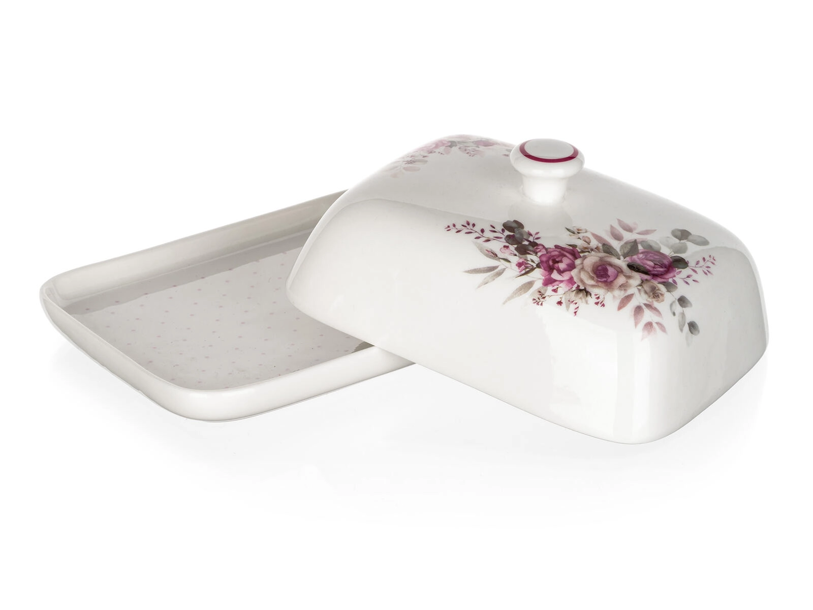 Na svojo mizo vnesite brezčasno eleganco s posodico za maslo ROSE iz kakovostne keramike. Zahvaljujoč tesnemu pokrovu ostaja maslo zaščiteno pred vonjavami in dlje časa sveže, medtem ko gladka glazura olajša čiščenje. Nežen motiv vrtnic v pastelnih tonih se zlahka kombinira z drugim namiznim posodjem in polepša vsako postrežbo.