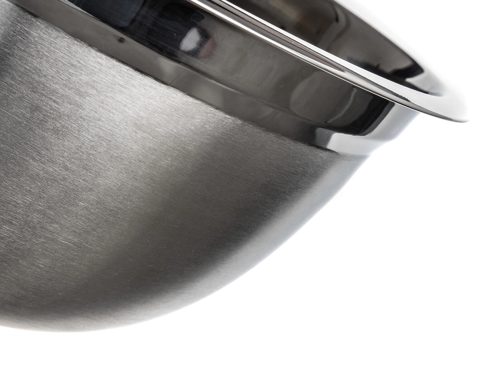 Kombinacija krtačene površine in poliranega roba skledi daje moderen videz ter hkrati povečuje odpornost proti praskam.
