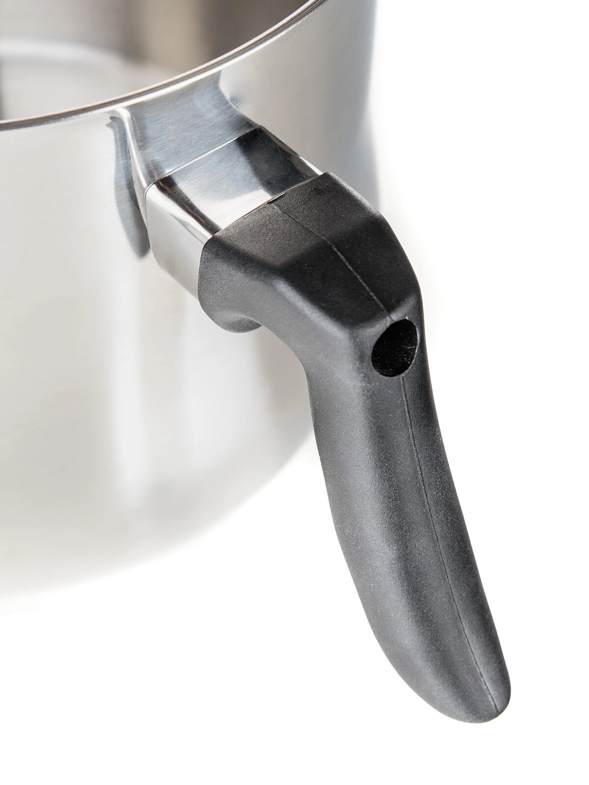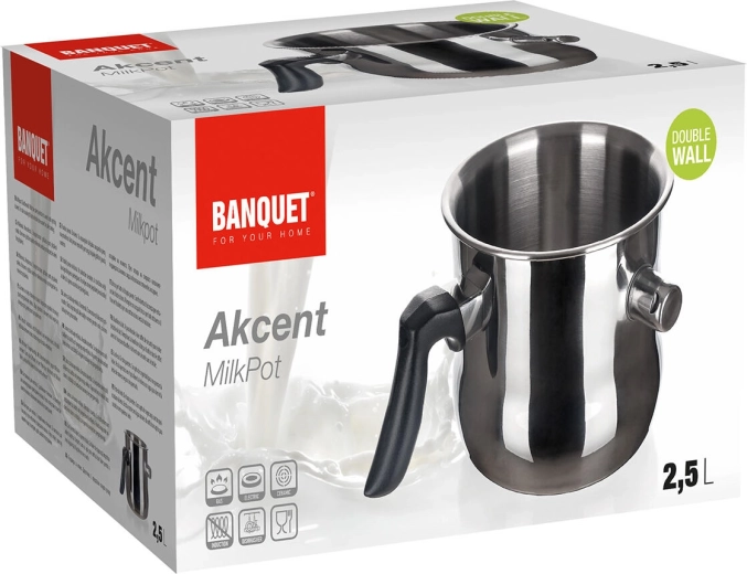 Nerjavno jeklen mlečnik AKCENT s prostornino 2,5 l je zasnovan za nežno kuhanje živil, ki se zlahka prismodijo. Dvostenska konstrukcija omogoča kuhanje v vodni kopeli: v zunanjo posodo se skozi odprtino za piščalko nalije voda, ki ob doseženem vrelišču sproži zvočni signal. Kuhanje je tako nadzorovano in enakomerno.