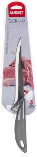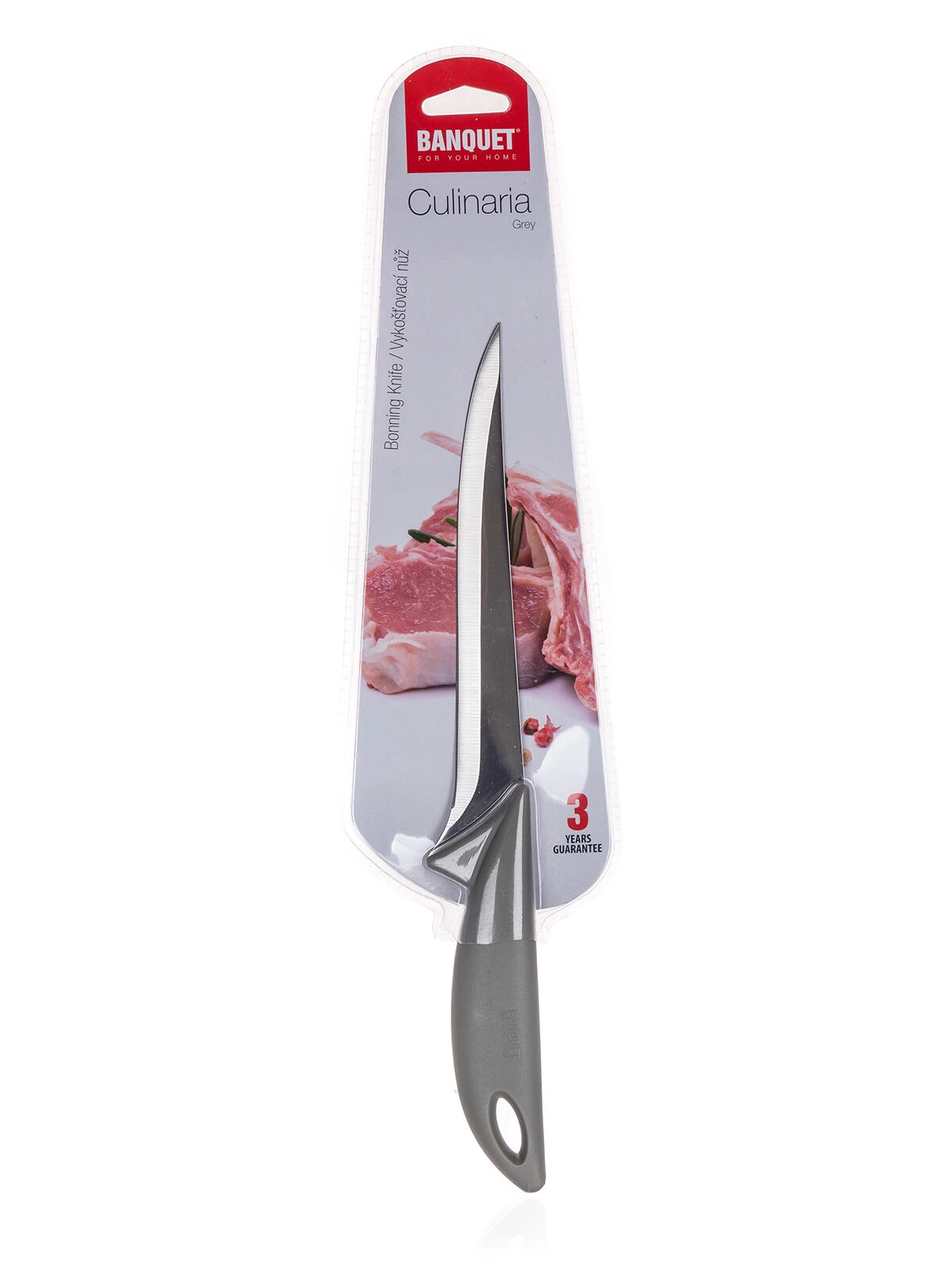 Razkoščiščevalni nož 18 cm CULINARIA Grey je nepogrešljiv pomočnik pri pripravi mesa. Zahvaljujoč ozkemu in čvrstemu jeklenemu rezilu zlahka prodre med kosti in kite, omogoča natančne reze in zmanjšuje poškodbe mesa. Ergonomski ročaj iz odporne plastike dobro sede v dlan in povečuje nadzor nad vsakim gibom.