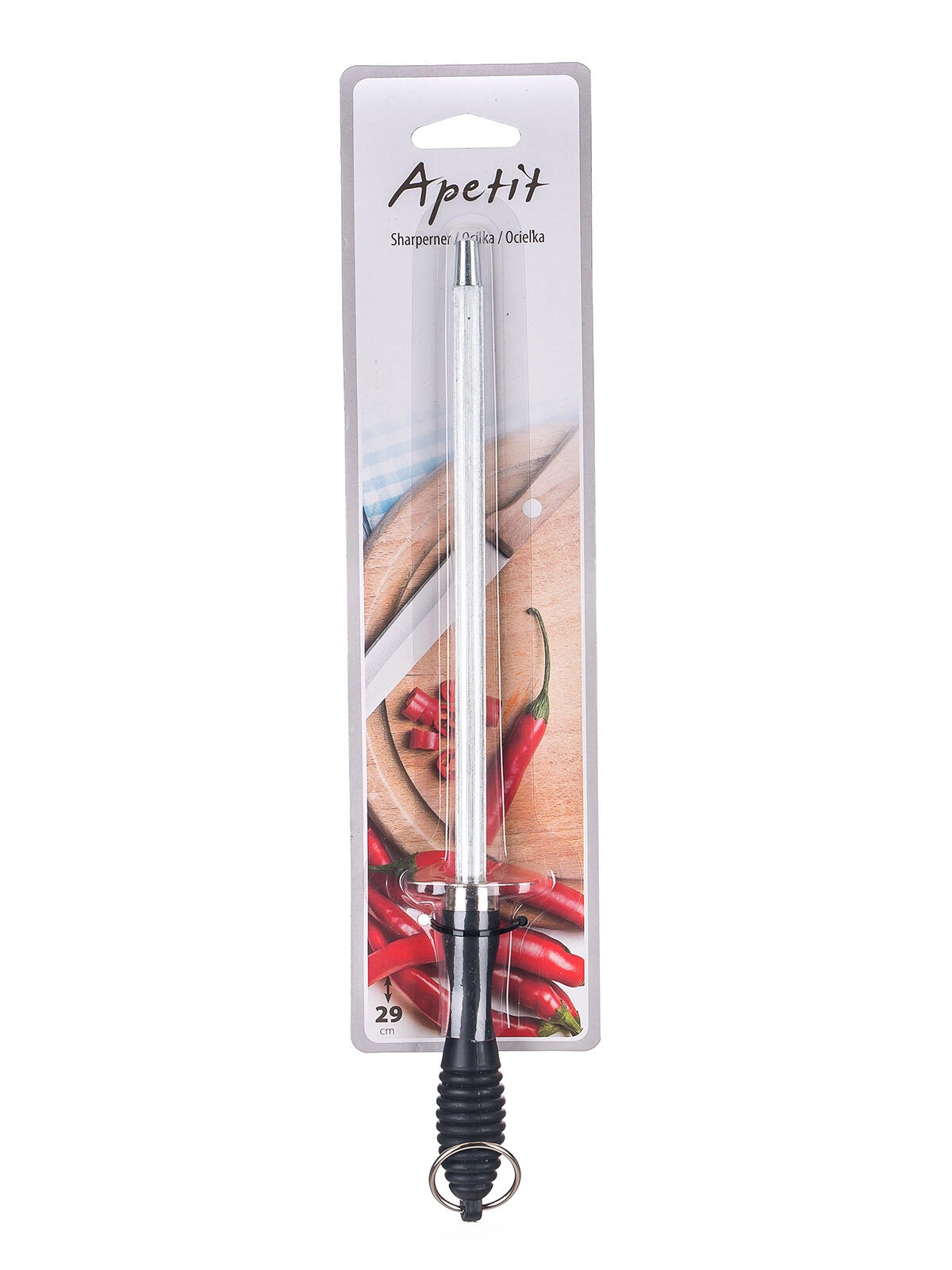 Profesionalna jeklena palica za nože Apetit dolžine 29 cm za hitro in natančno ostrenje ter poravnavo rezila. Zahvaljujoč teksturirani jekleni palici in ergonomsko oblikovanemu ročaju ponuja zanesljivo delovanje, varno uporabo in dolgo življenjsko dobo v vsaki kuhinji.