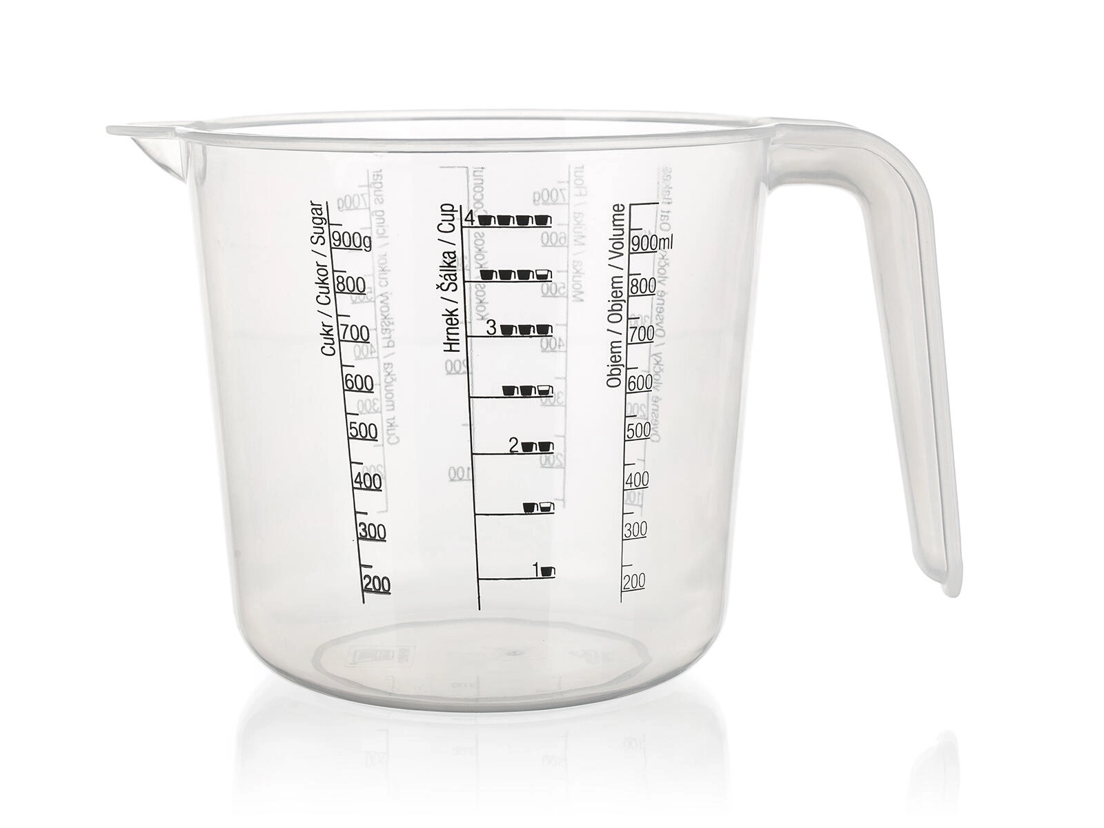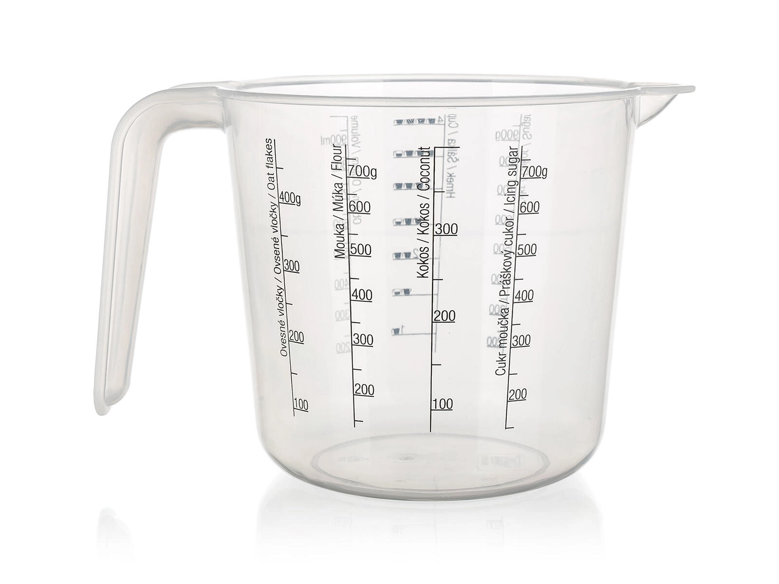 Praktičen plastičen merilni vrč s prostornino 1 l omogoča natančno kuhanje in peko zahvaljujoč preglednim merilnim lestvicam za suhe in tekoče sestavine. Ponuja merilne skale za kokos, ovsene kosmiče, moko, sladkor v prahu, sladkor ter prostornino v ml ali na skodelice, tako da imate vse pri roki v eni posodi.