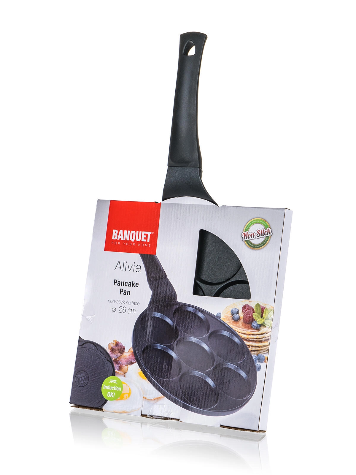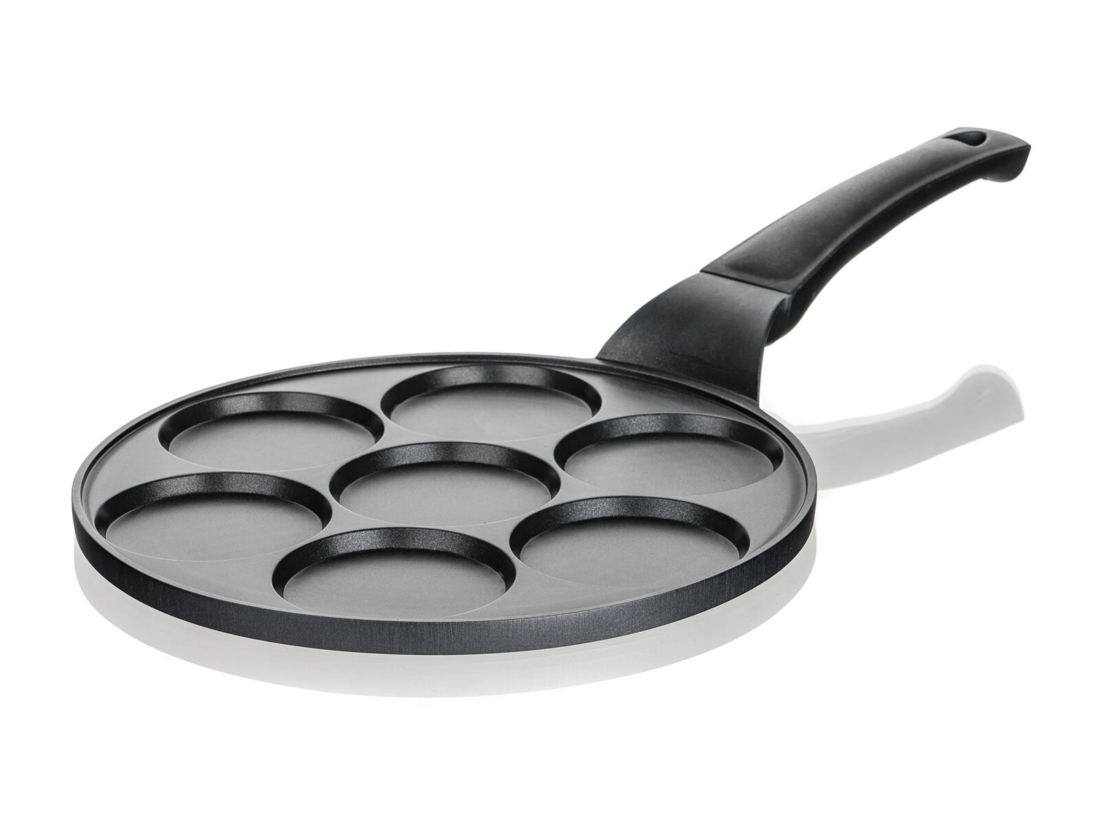 Ponev za palačinke ALIVIA je idealna izbira za hitro in zabavno pripravo zajtrkov in malic. Sedem plitvih modelčkov s premerom 8 cm zadrži testo natančno tam, kjer mora biti, zato bo vsaka palačinka enako velika in popolno pečena. Vzdržljiva nelepljiva površina zmanjšuje uporabo maščobe in poenostavi vzdrževanje.