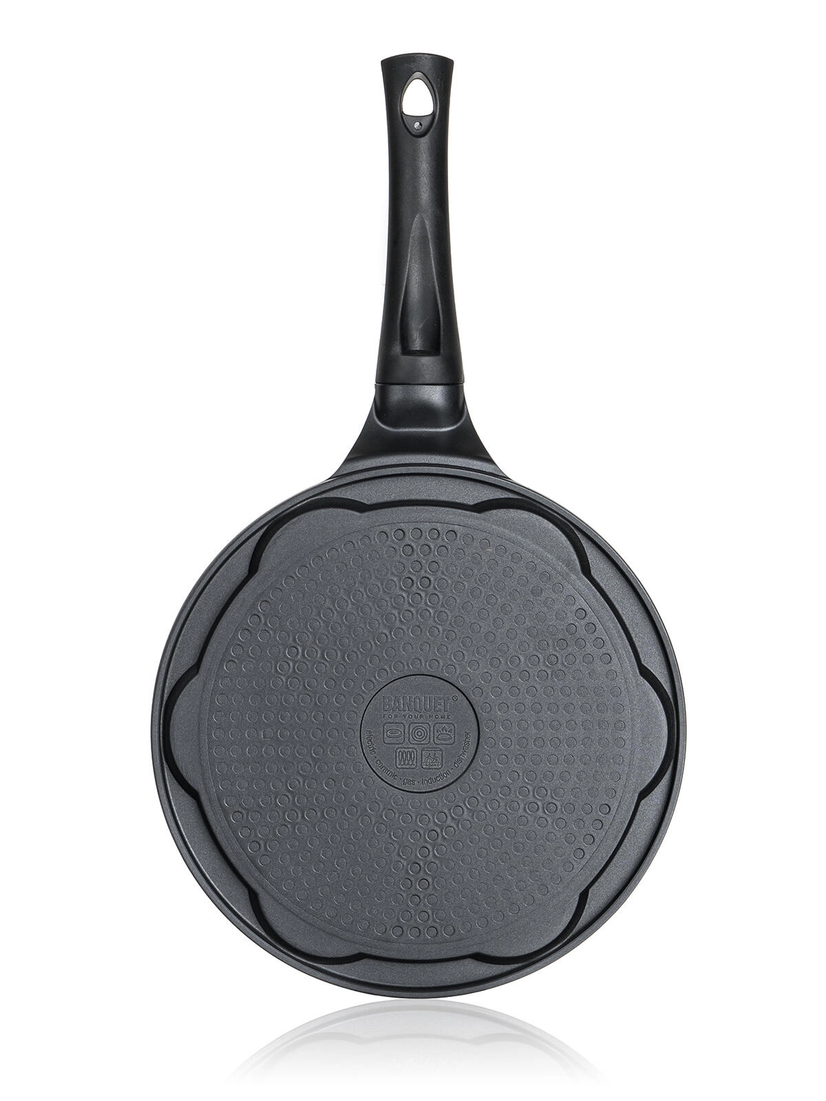 Lita aluminijasta ponev z ravnim dnom zagotavlja odličen stik s kuhalno ploščo in enakomerno segrevanje na plinu, steklokeramiki, elektriki in indukciji.