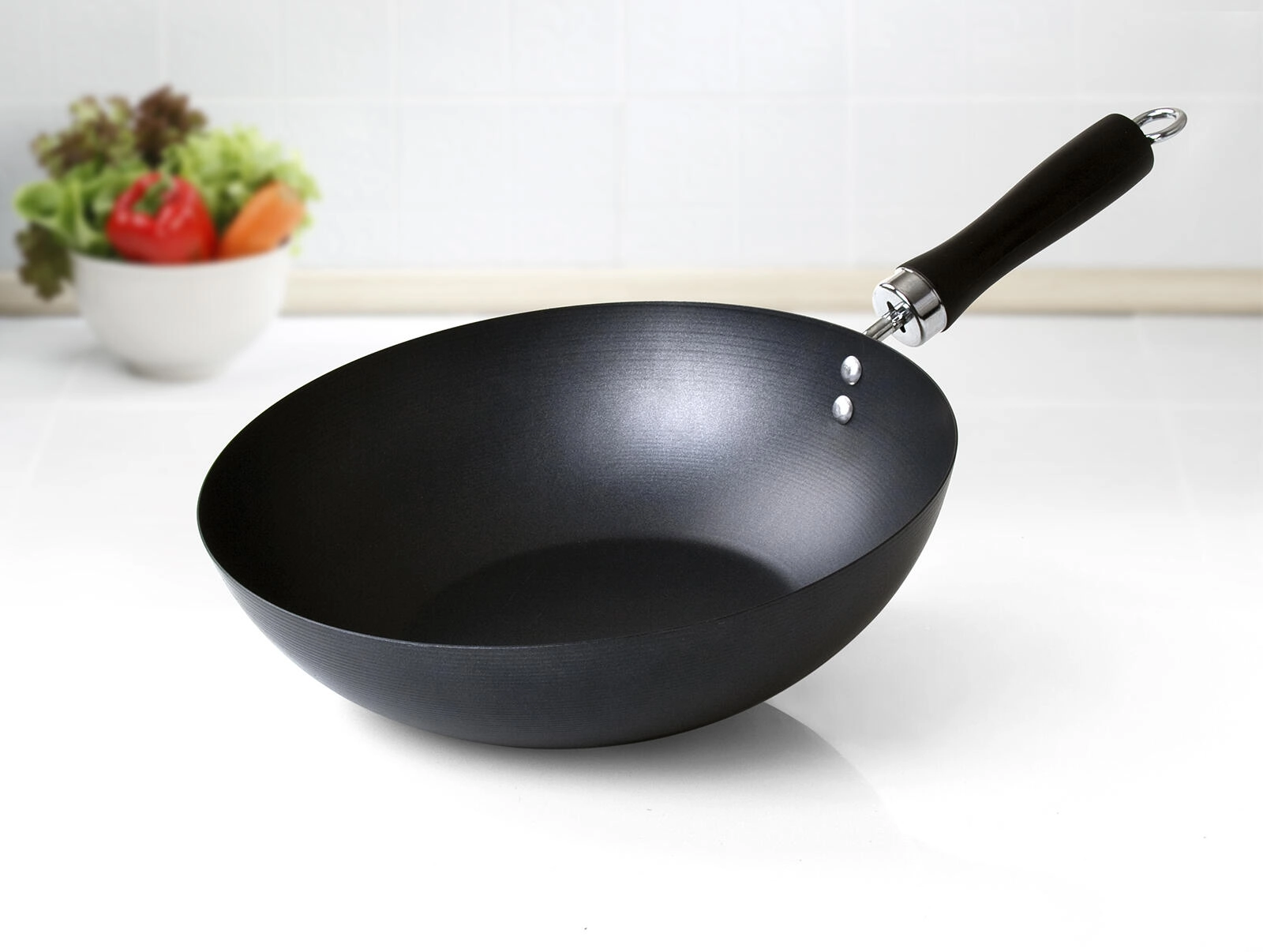 Univerzalna wok ponev s premerom 28 cm za hitro pripravo azijskih in domačih jedi. Zaradi ogljikovega jekla z nelepljivo površino se sestavine ne prijemajo, tanke stene pa hitro prenašajo toploto. Udoben kovinski nasad z bakelitnim ročajem dobro sede v roko, zanka pa omogoča praktično obešanje.
