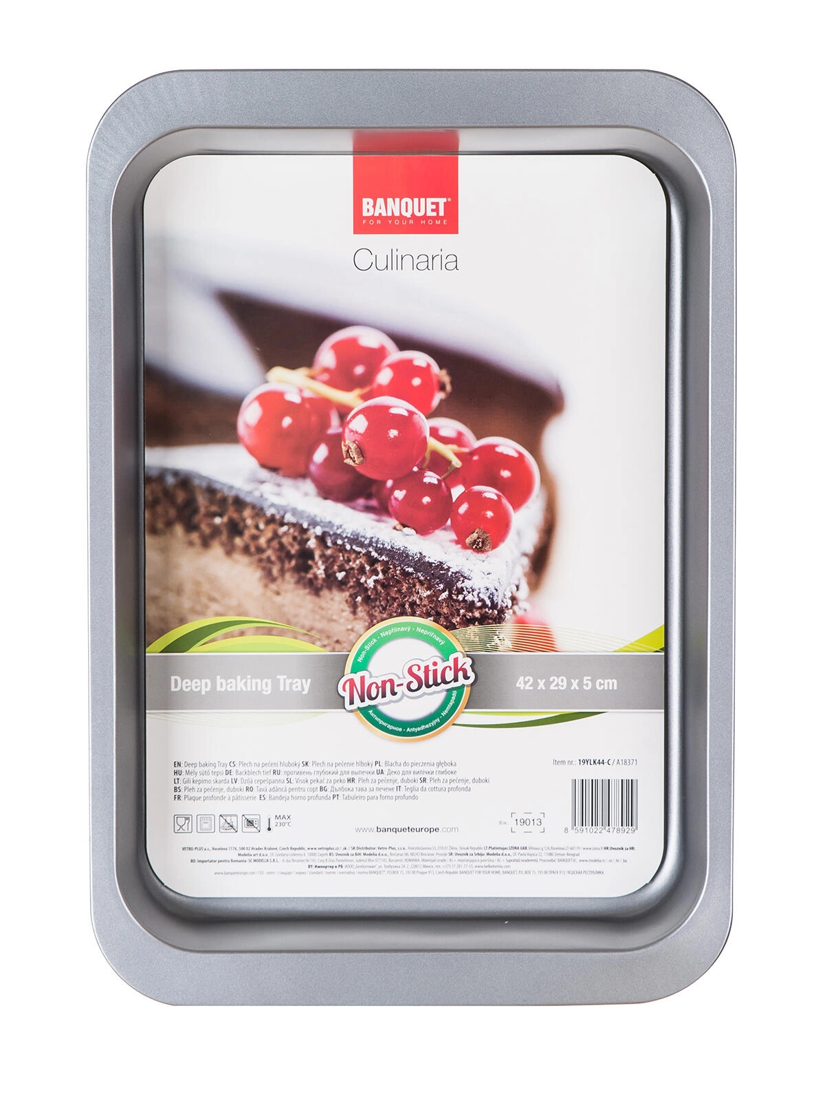 Univerzalni globok pekač CULINARIA dimenzij 42 × 29 × 5 cm je idealen za sladke in slane jedi. Izdelan je iz trpežnega ogljikovega jekla z nelepljivo površino XYNFLON na osnovi PTFE za preprosto odstranjevanje jedi iz pekača in hitro čiščenje. Elegantna srebrno-siva izvedba in robustna debelina 0,5 mm zagotavljata dolgo življenjsko dobo in enakomerno peko.