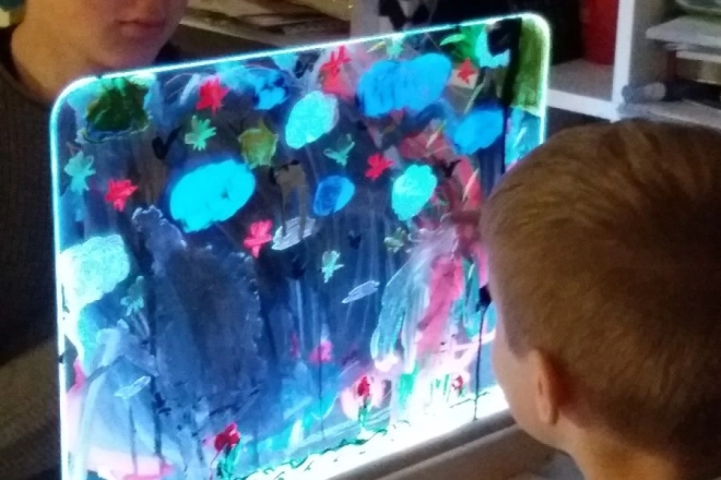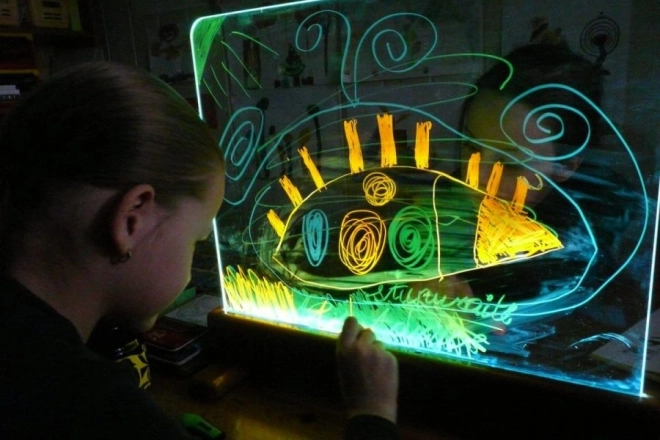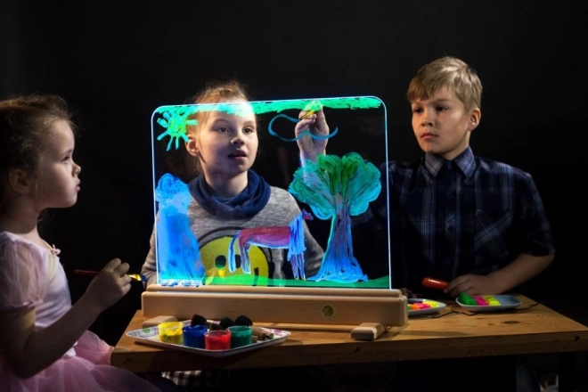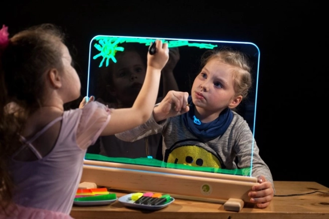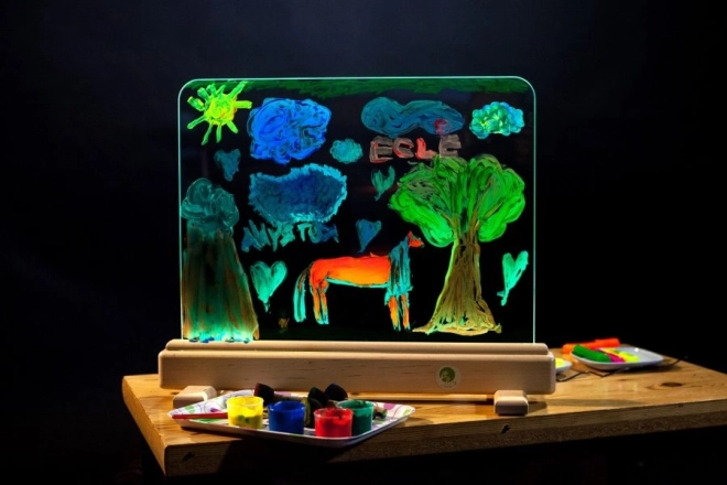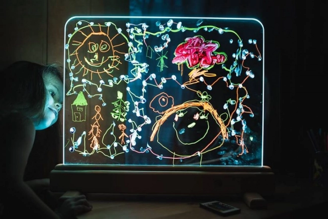 Prebudite otroško domišljijo. Svetlobna tabla Jonely z odporno ploščo iz kaljenega stekla omogoča slikanje z vodenimi barvami, s prsti in z izbrisljivimi flomastri. Površina se zlahka čisti, možnost dvosmernega risanja pa omogoča zabavo tudi sorojencem hkrati. Vgrajene LED diode v spodnjem okvirju lepo osvetlijo vsak potez in spremenijo risbe v žareča dela.