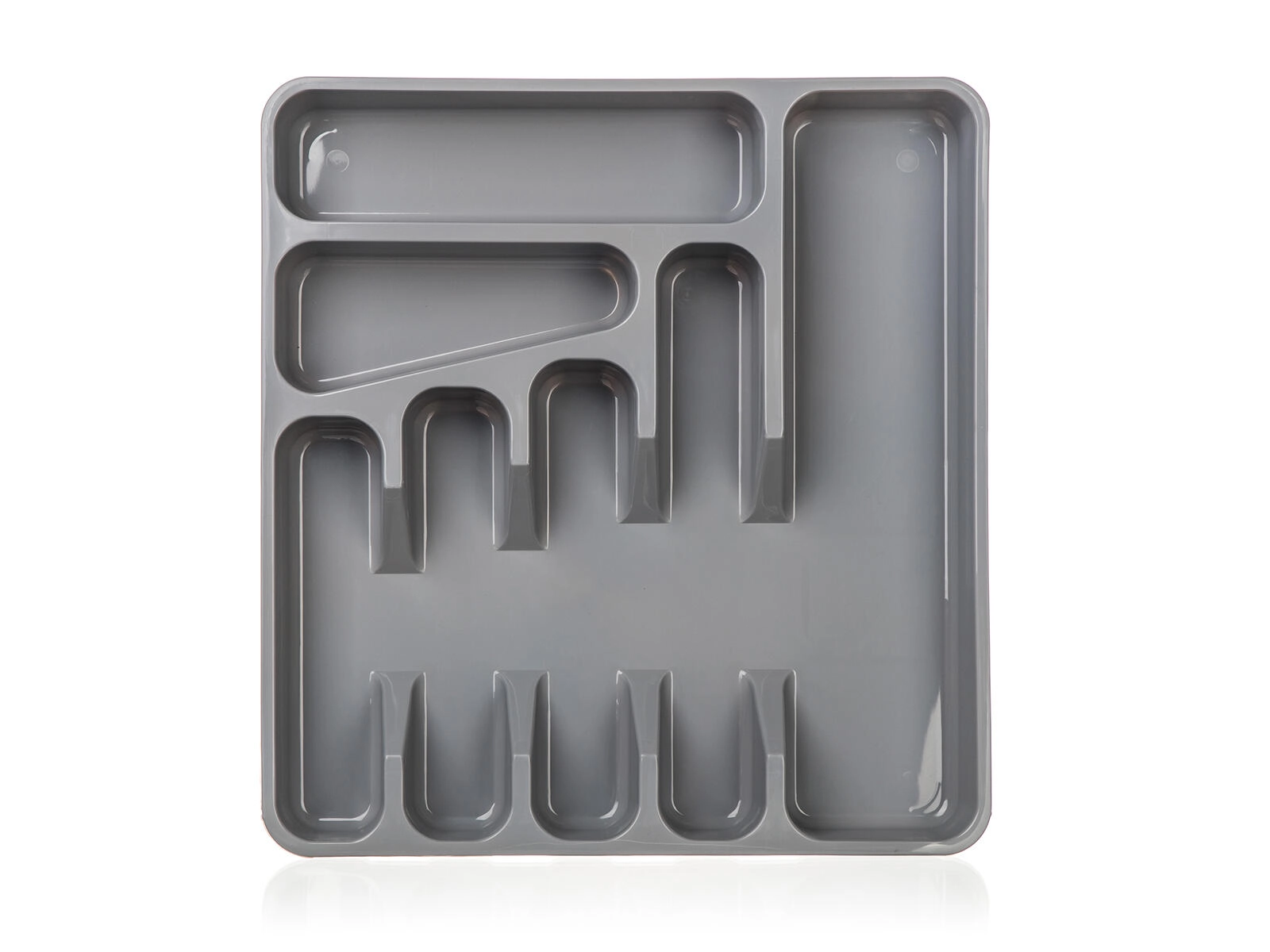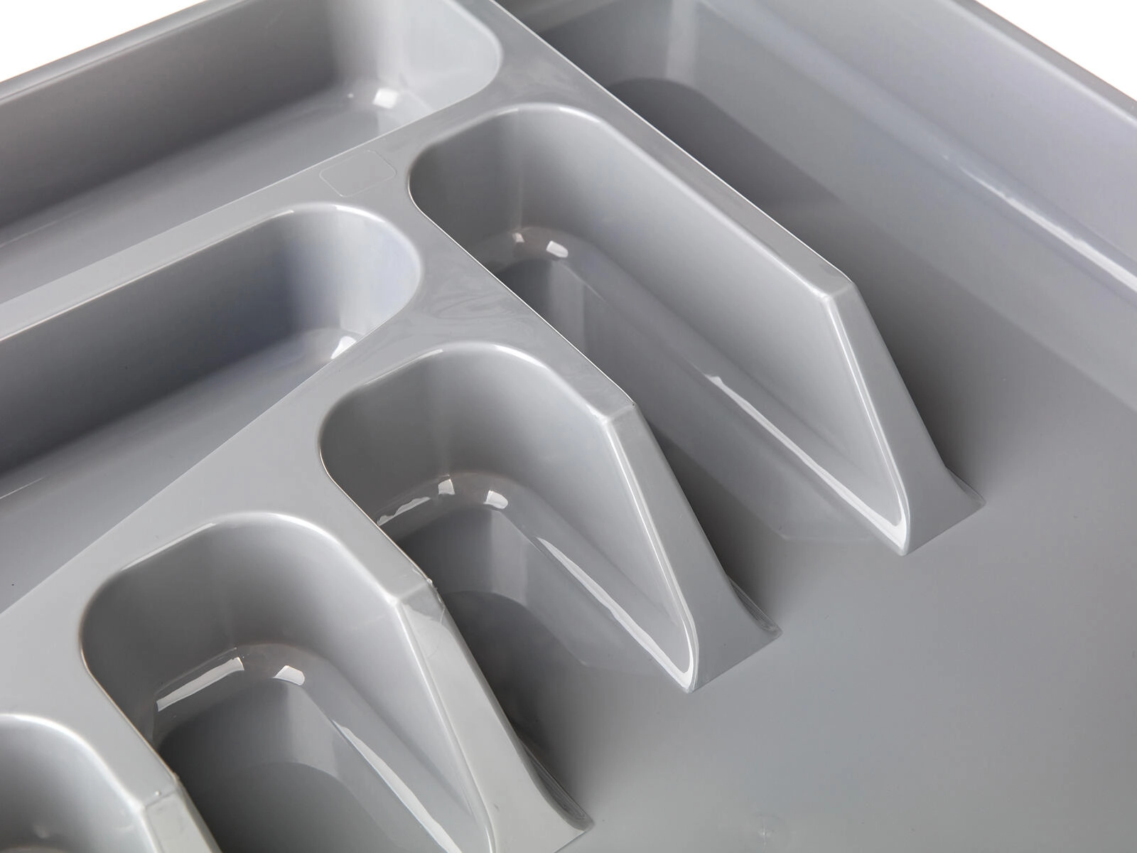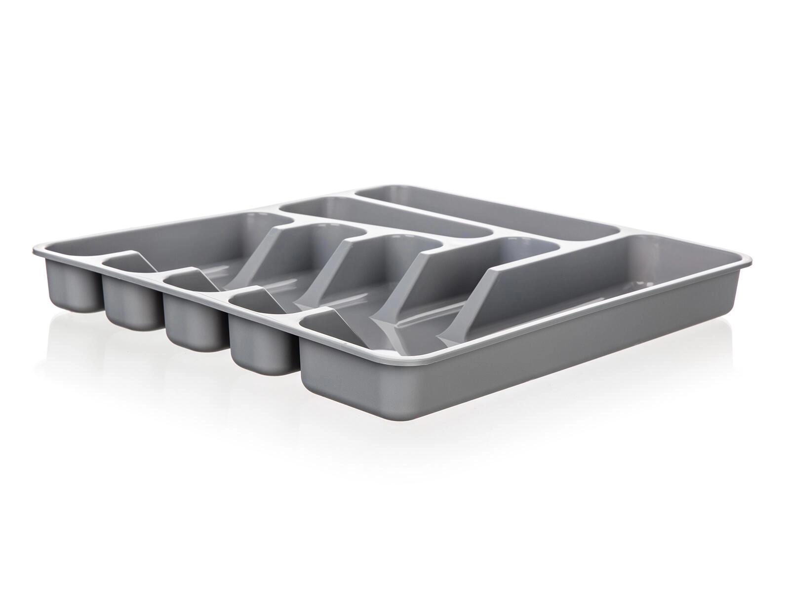 Siv priborovnik iz kakovostne plastike je praktična rešitev za pregledno shranjevanje pribora in manjših kuhinjskih pripomočkov. Zaradi premišljene razporeditve predalčkov boste imeli vilice, nože, žlice in majhne pripomočke vedno pri roki in na svojem mestu.