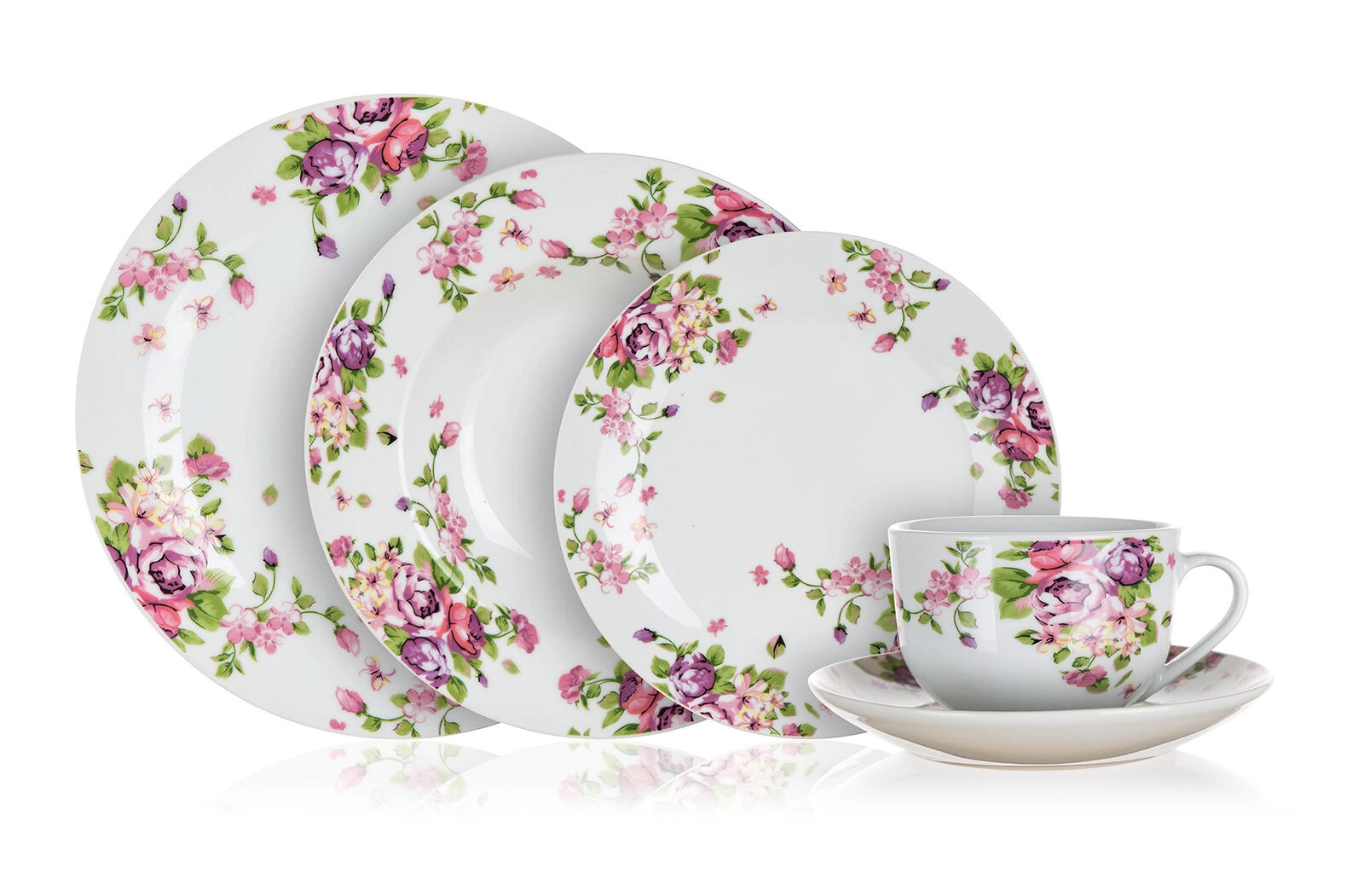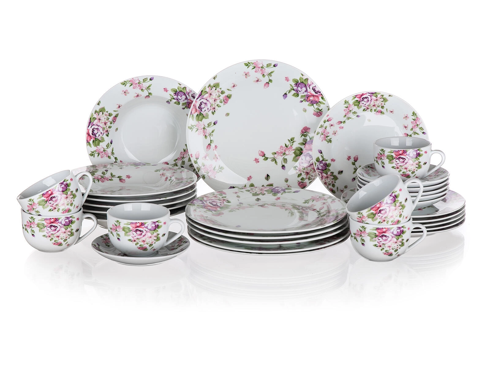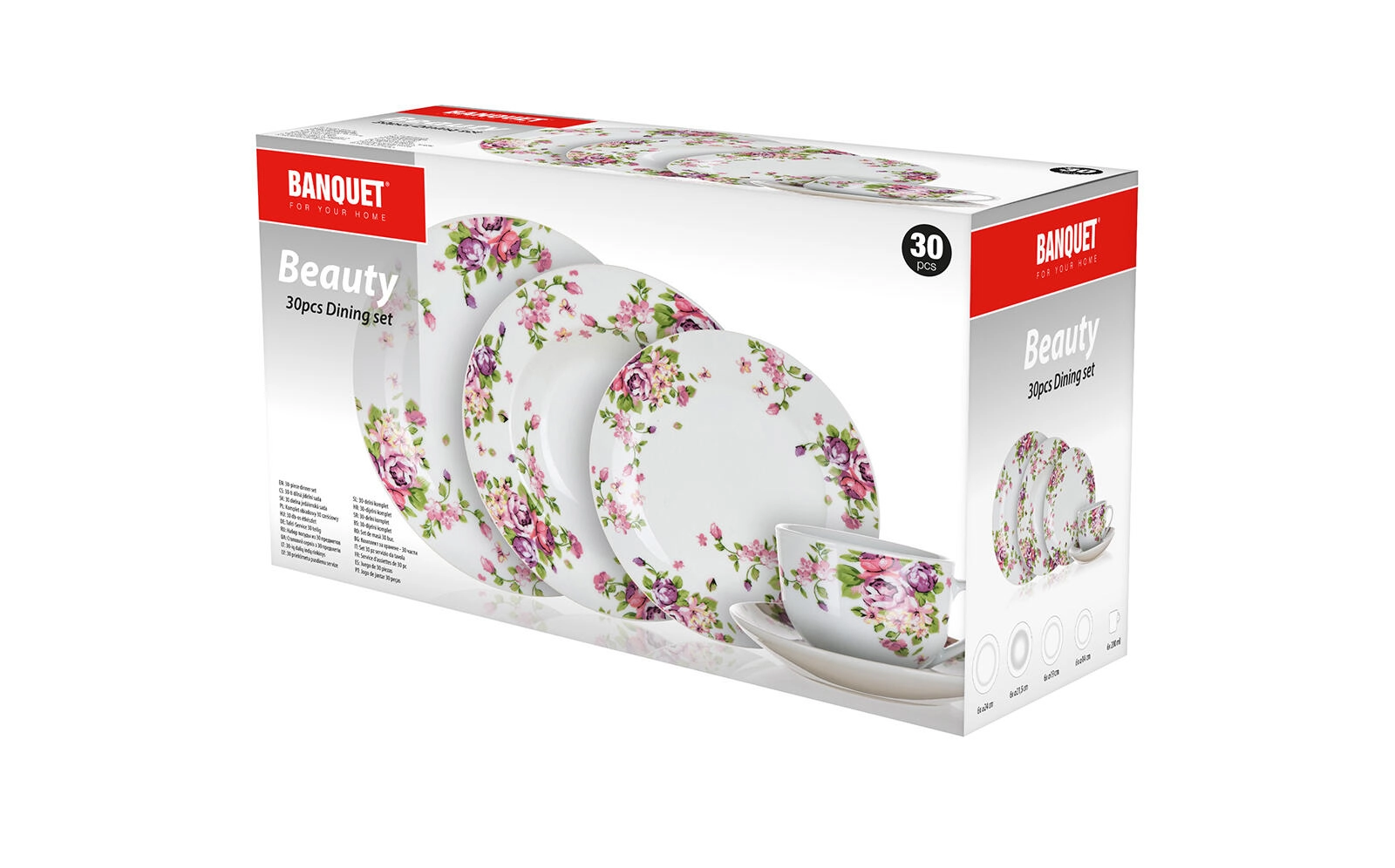 Stilski set posodja Beauty združuje klasičen bel porcelan z romantičnim cvetličnim motivom, ki je usklajen skozi vse kose. S premišljeno sestavo dobite krožnike za juhe, glavne jedi in sladice, dopolnjene s skodelicami in krožnički za serviranje kave ali čaja.