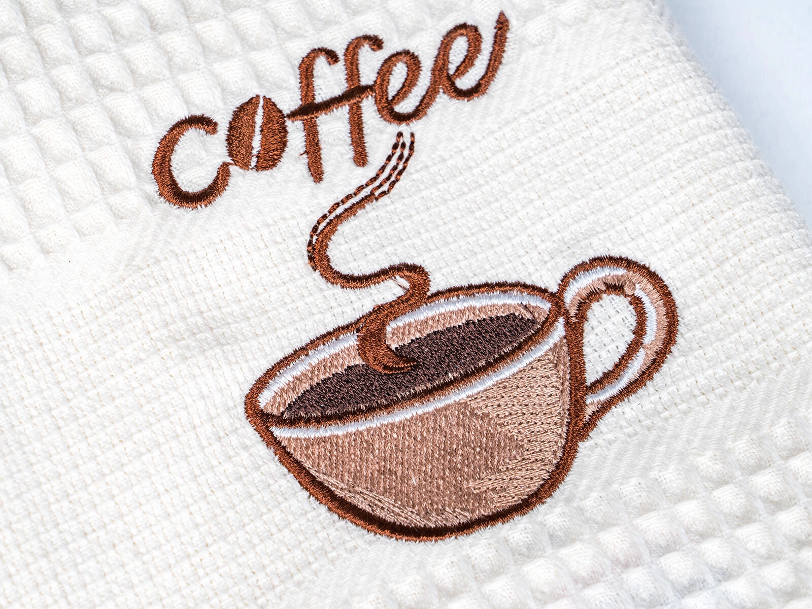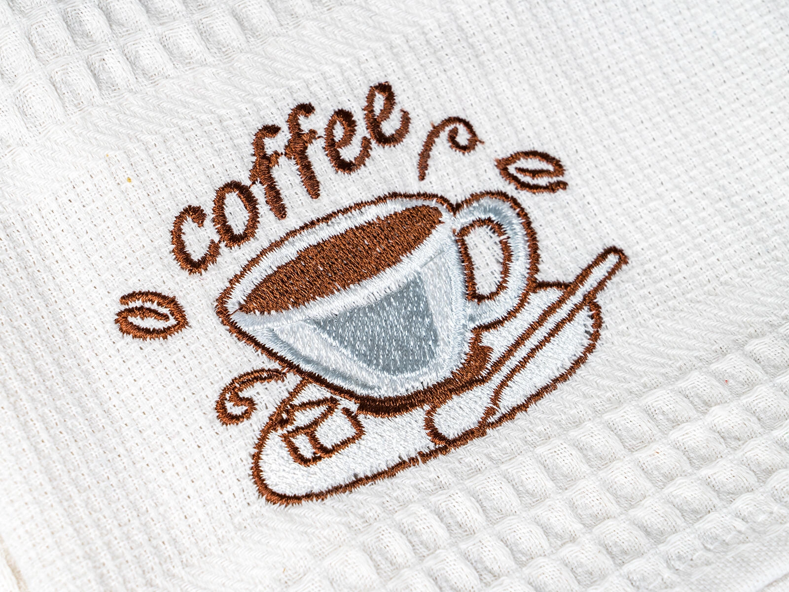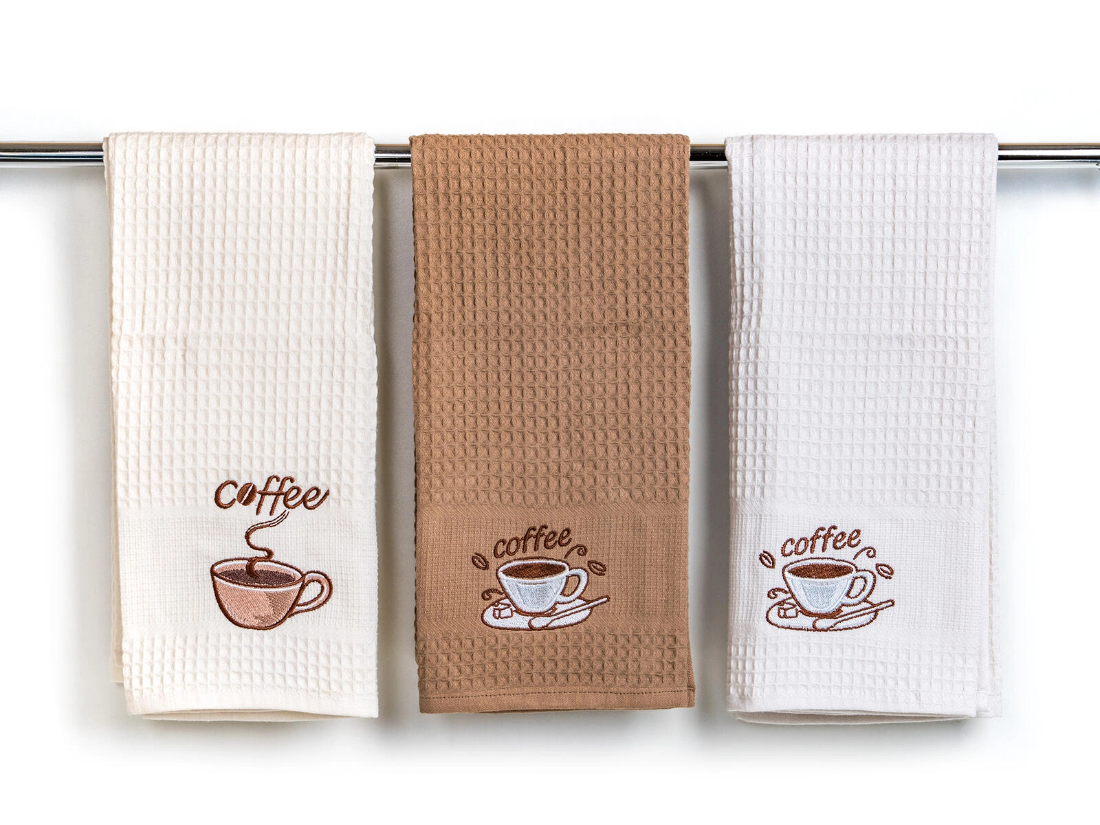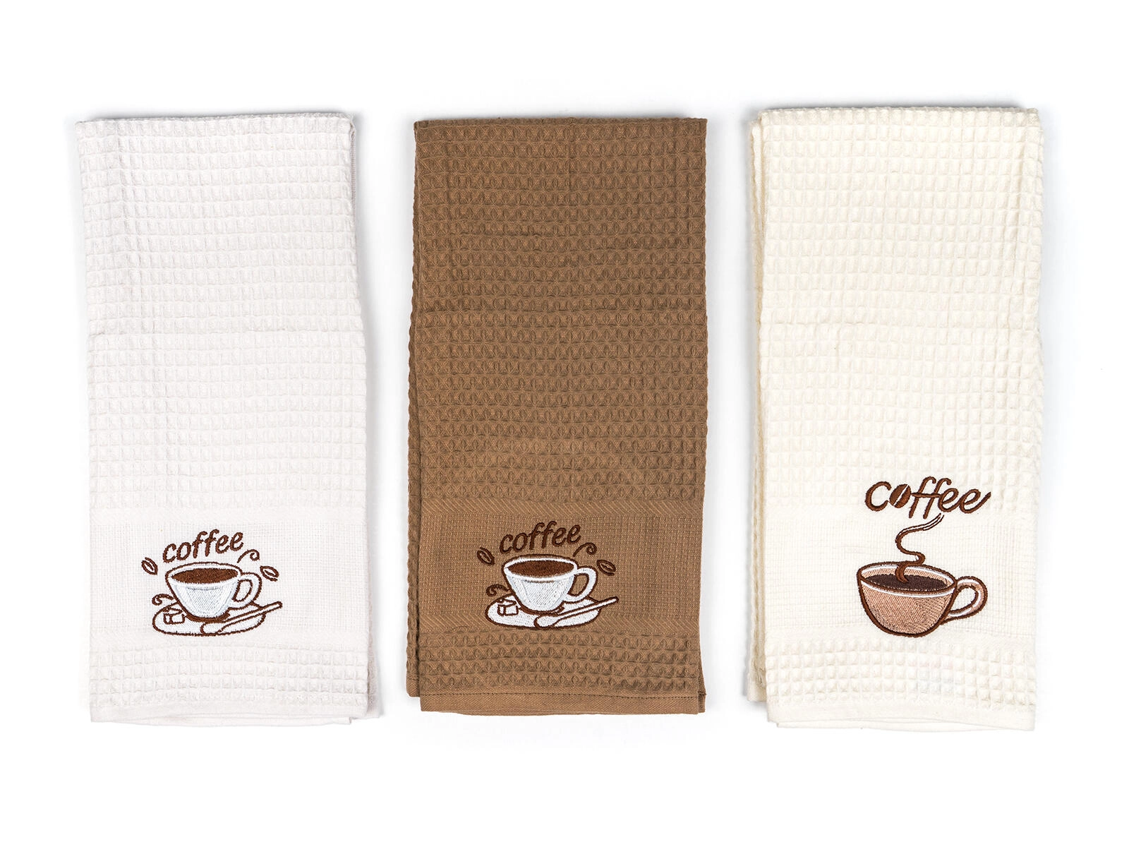 Priljubljene vafeljske brisače z elegantnim vezenjem COFFEE so nepogrešljiv pomočnik za brisanje posode in rok. Zahvaljujoč kakovostnemu bombažnemu materialu odlično vpijajo, se hitro sušijo in dolgo trajajo. Brezčasne barve se zlahka kombinirajo z drugim kuhinjskim tekstilom.