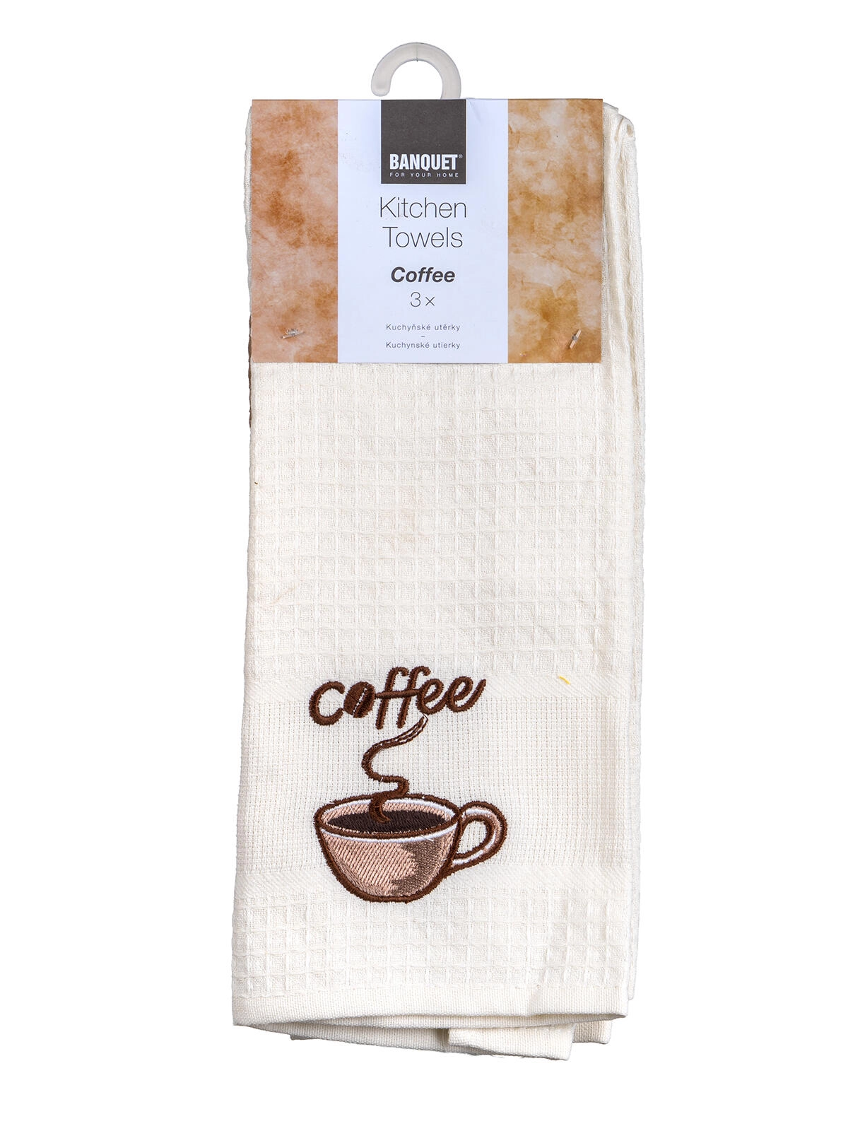 Dekorativni vezen napis coffee doda kuhinji pridih prefinjenosti. Set treh kosov v belih, krem in bež odtenkih se poda vsakemu interierju.