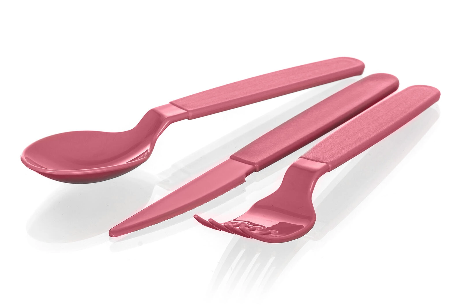 Tri kose v enotnem dizajnu: žlica, nož in vilica v temno rožnati barvi za usklajeno mizo doma in na prostem.
