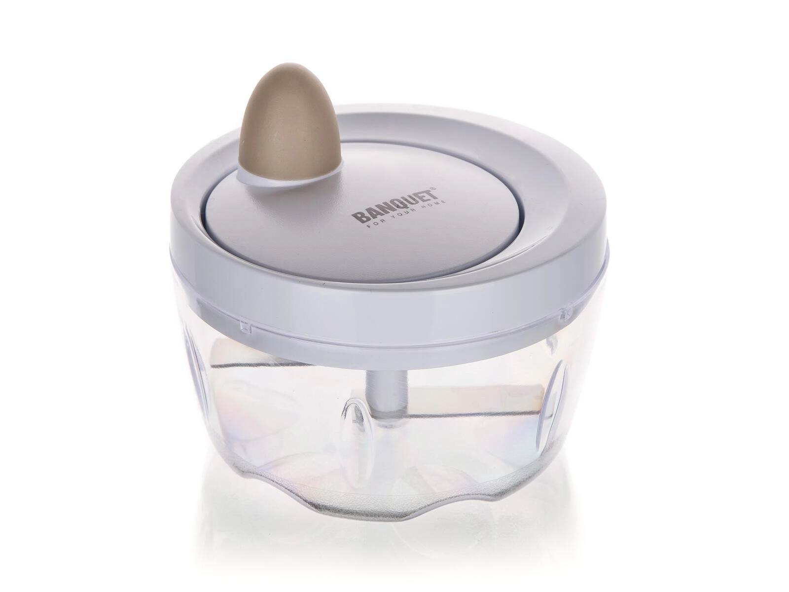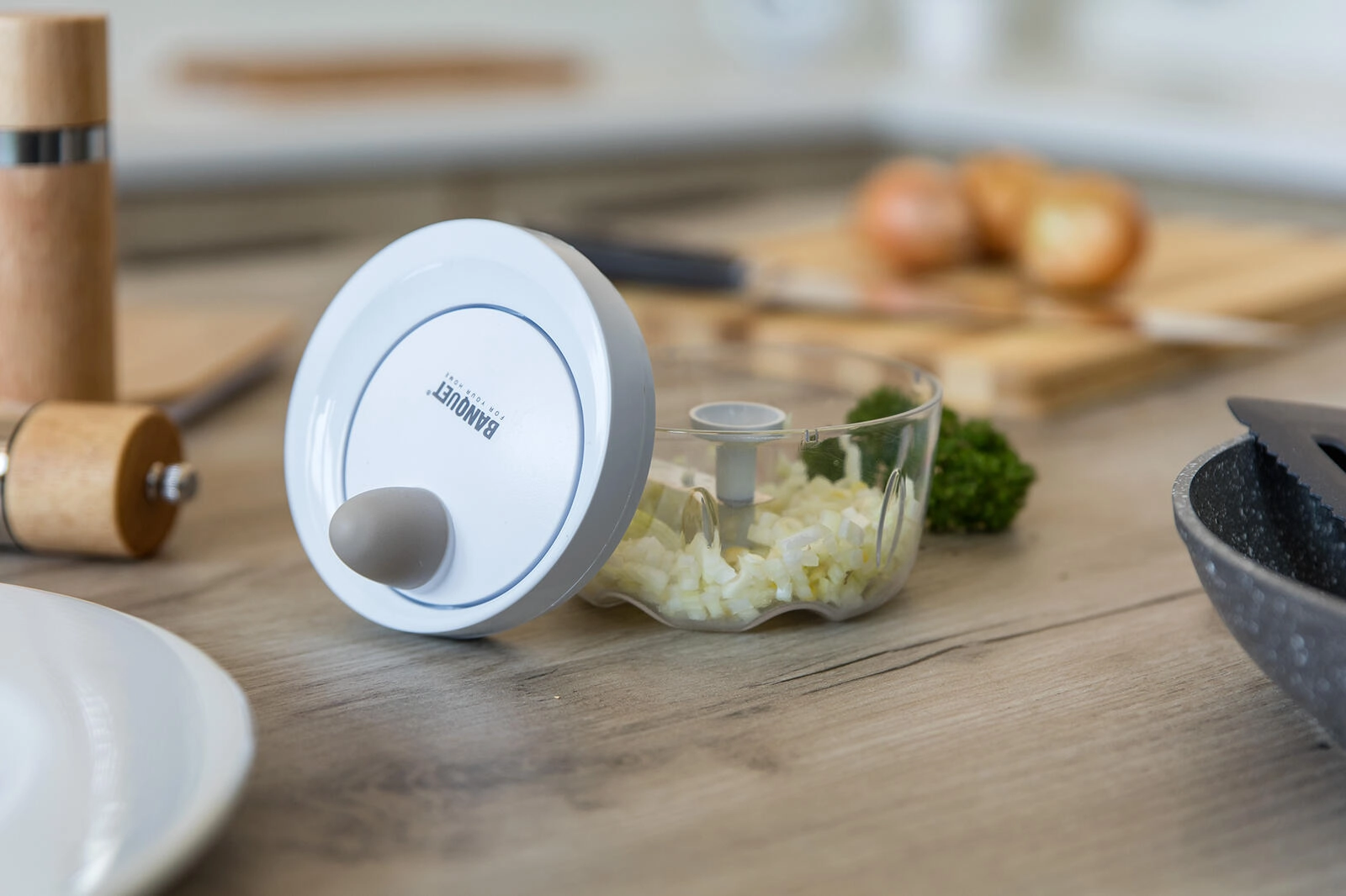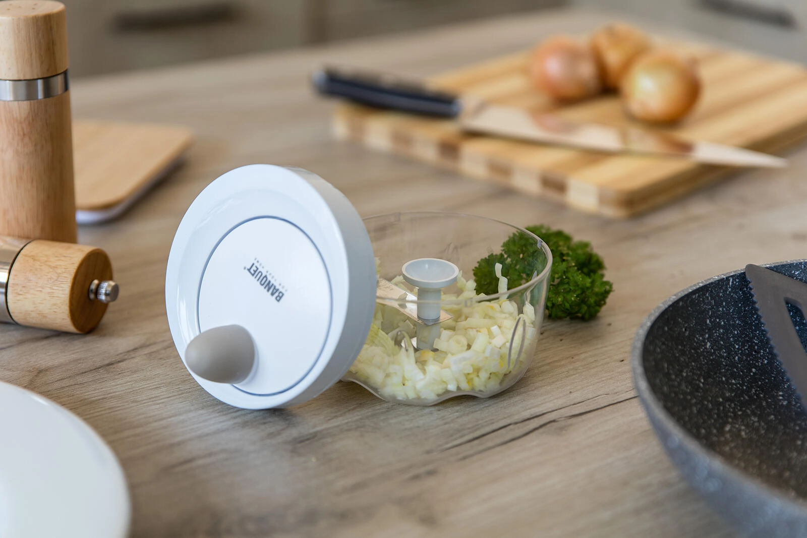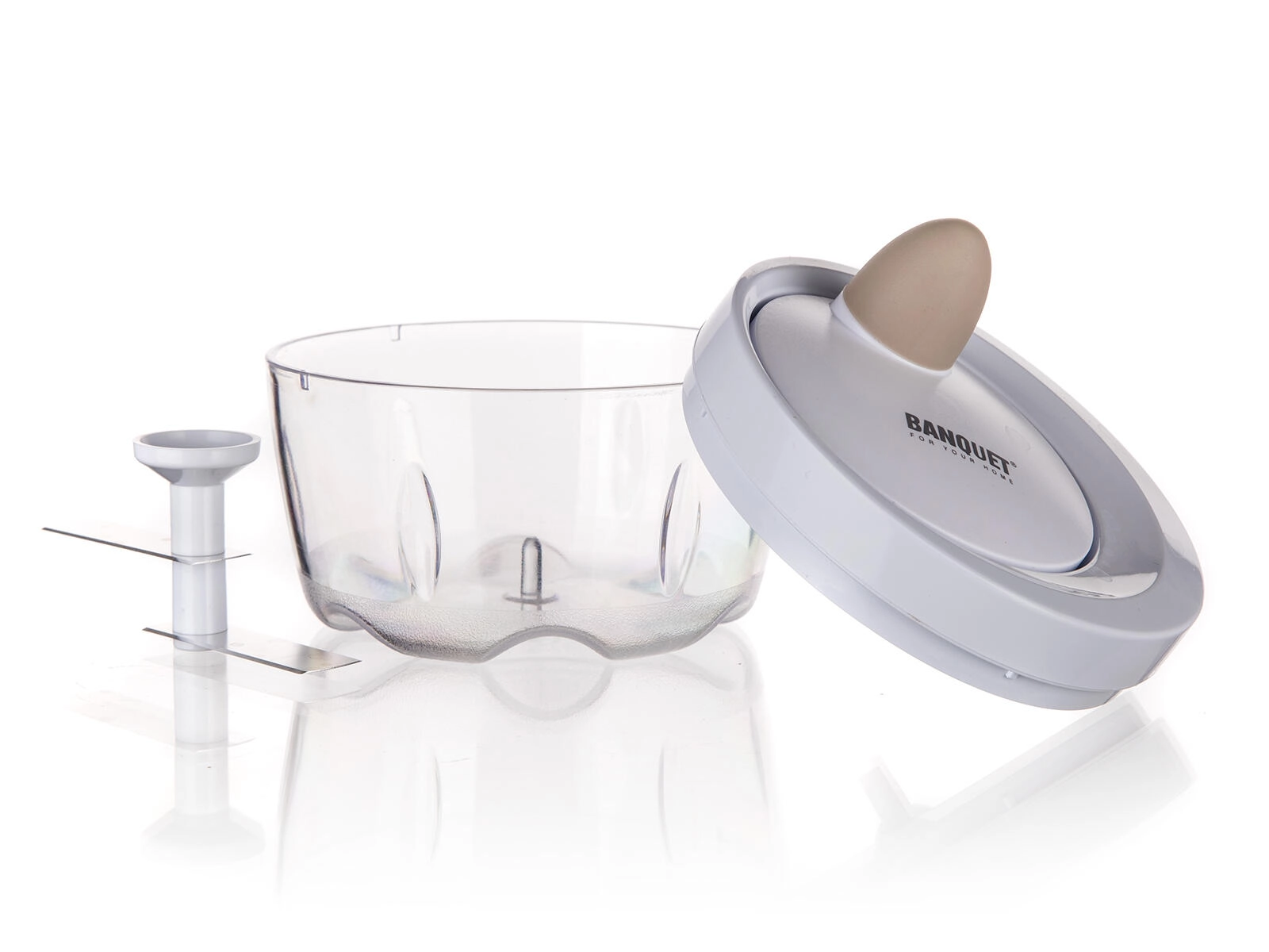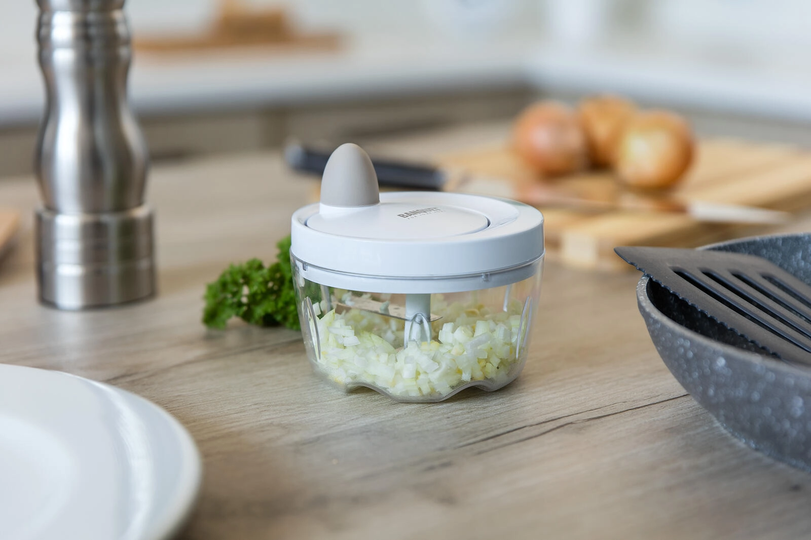 Mehanski pogon z vlečnim mehanizmom v nekaj sekundah zavrti nerjavna rezila. Idealno za čebulo, zelišča in sadje.