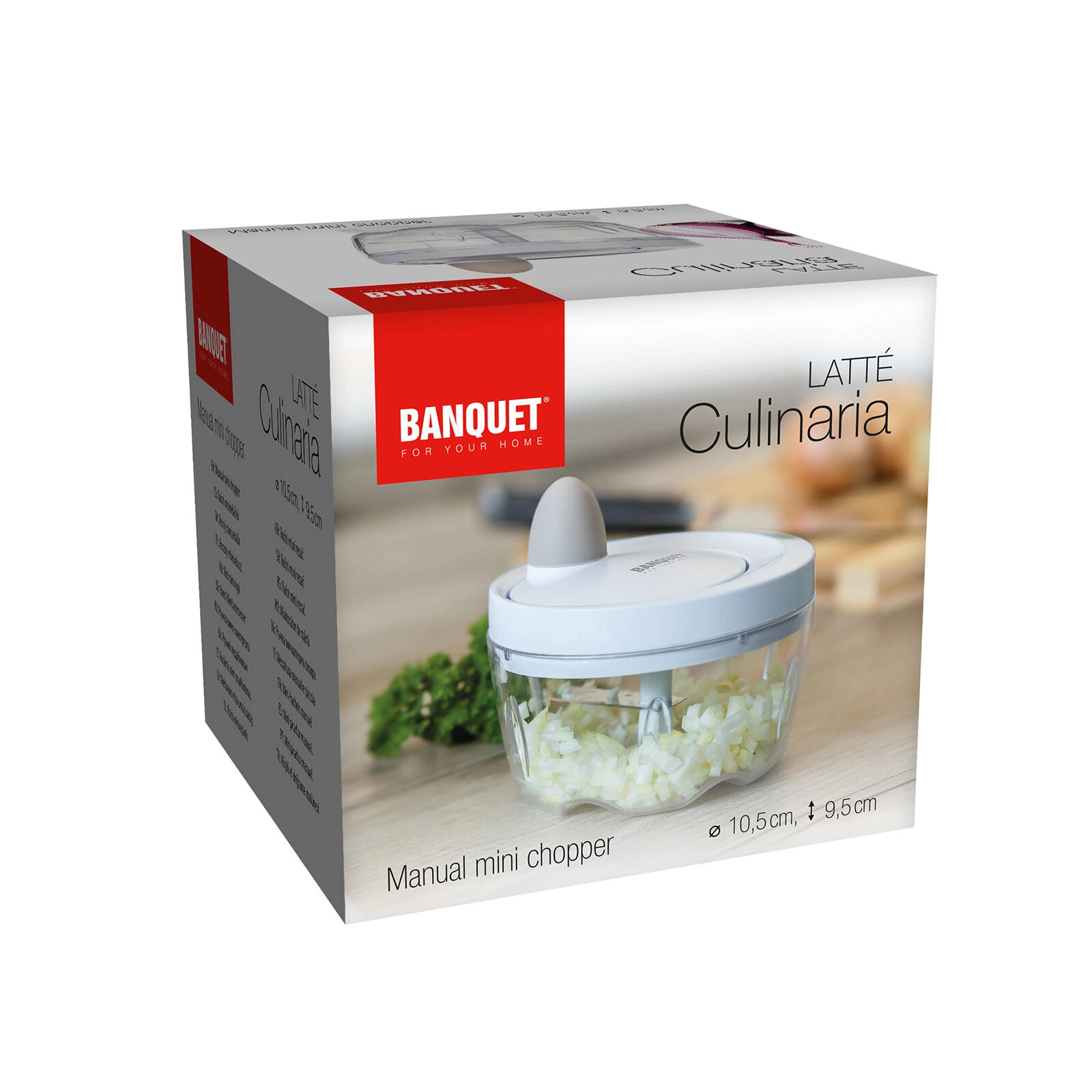 Praktični mini sekljalnik Culinaria Latte je idealen pomočnik za vsako kuhinjo. Z ostrimi nerjavnimi rezili zlahka in enakomerno naseklja čebulo, zelišča, oreščke ali zelenjavo. Prozorna posoda s premerom 10,5 cm omogoča nadzor nad konsistenco sekljanja v realnem času.