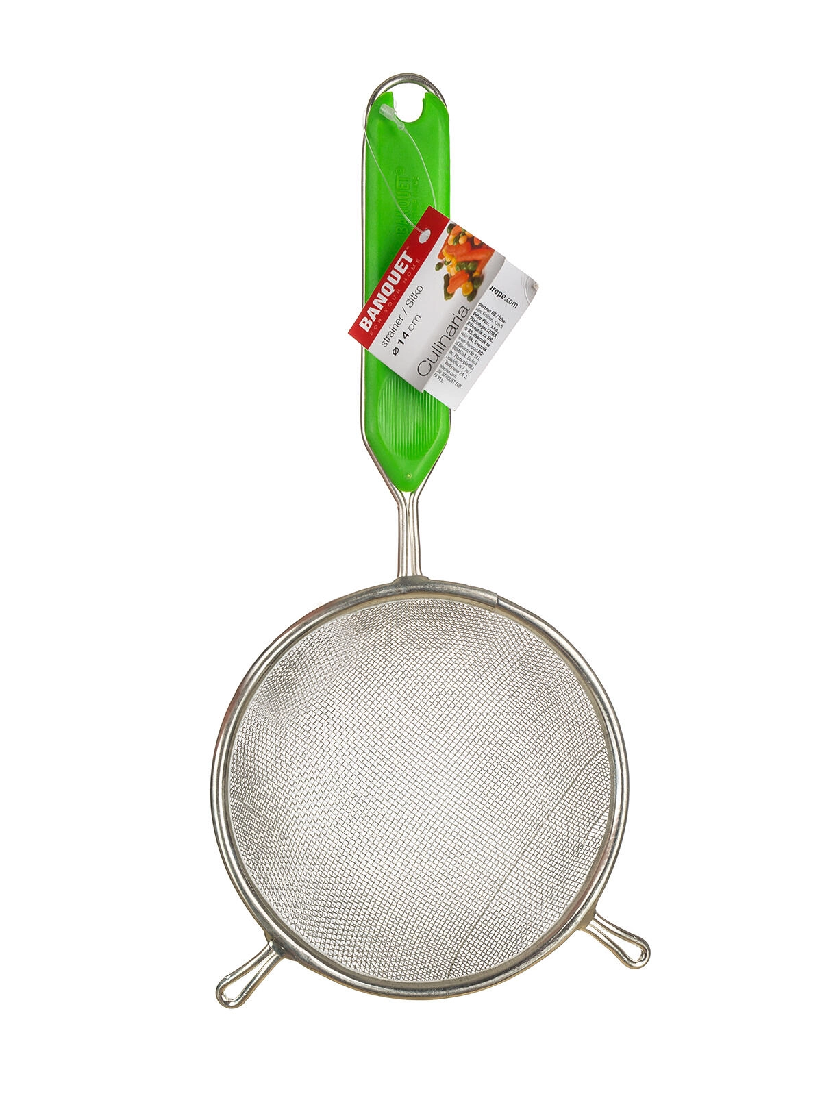 Praktično kuhinjsko cedilo s premerom 14 cm iz pocinkanega kovina z trdno plastično vložko ABS v ročaju za udoben oprijem. Fina mrežica 1 × 1 mm z gostoto 15 očesc na cm² zanesljivo zadrži tudi drobne nečistoče. Idealno za cejenje tekočin in napitkov, omak ali juhnih osnov, v elegantni zeleni barvi.