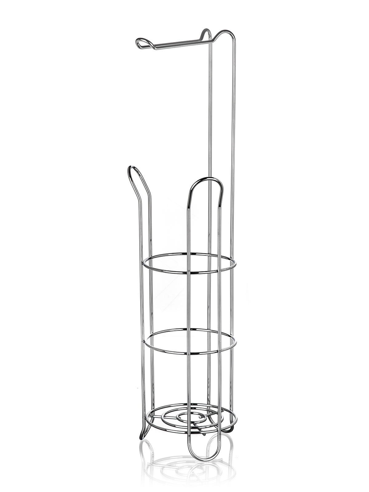Elegantno stojalo za toaletni papir z držalom v kromirani izvedbi združuje praktično shranjevanje do 4 rolic (3 v stojalu + 1 na držalu) z varčnim izkoristkom prostora. Stabilna kovinska konstrukcija z sijočo površinsko obdelavo vaši kopalnici doda moderen videz in zagotavlja lahek dostop do rolic kadarkoli jih potrebujete.
