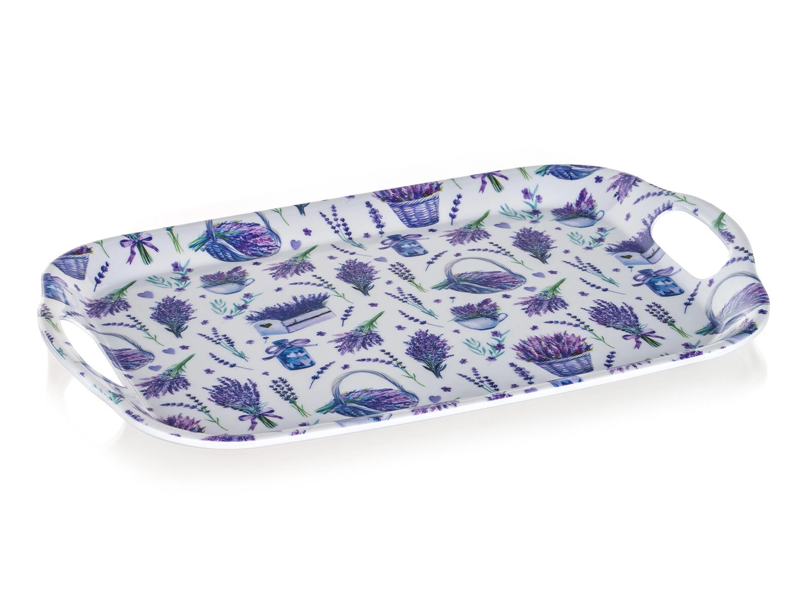 Odkrijte praktičnega pomočnika za serviranje – melaminski pladenj NEW LAVENDER s čudovitim motivom sivke. Zaradi čvrste in lahke zasnove je rokovanje udobno, medtem ko vgrajeni ročaji in povišani robovi zagotavljajo stabilnost in varnost pri prenašanju.
